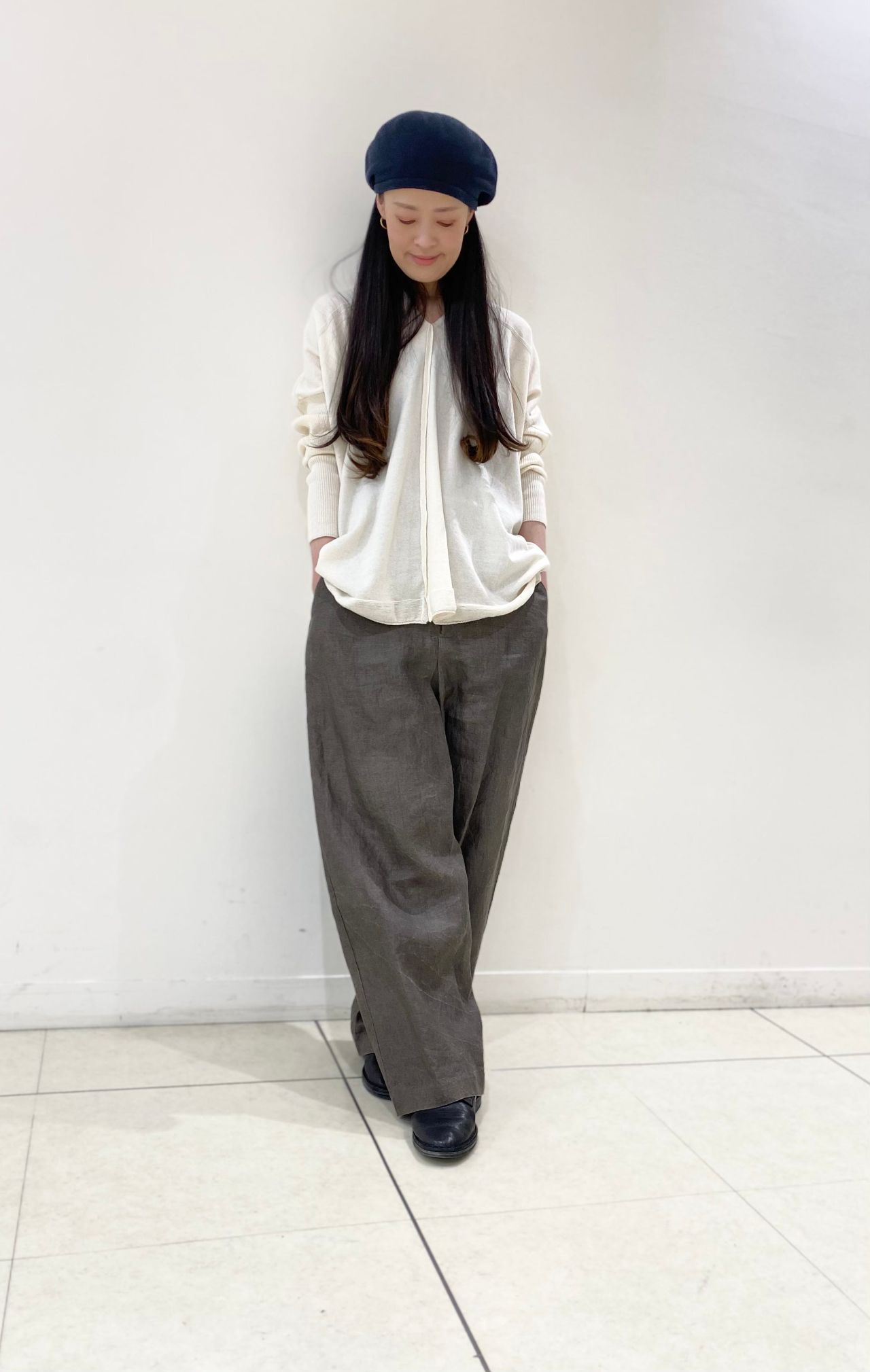 腰回りをカバーする、ゆったりVネックニット。