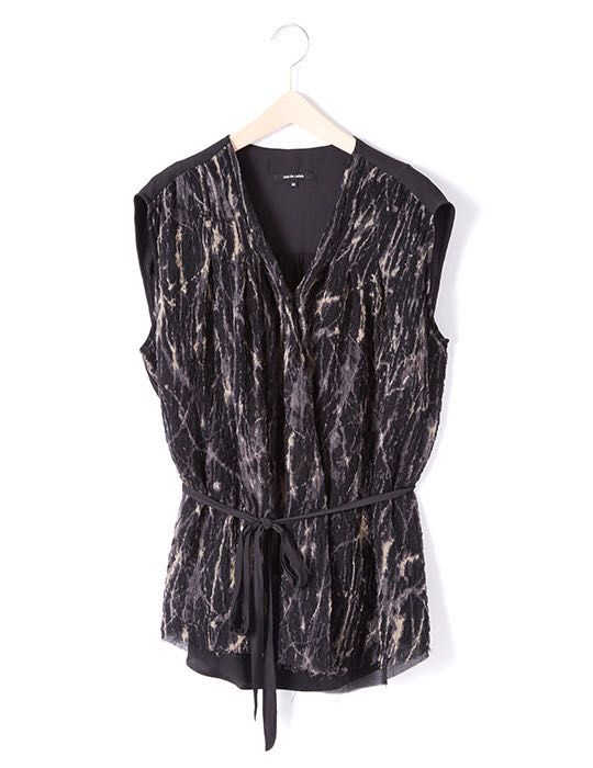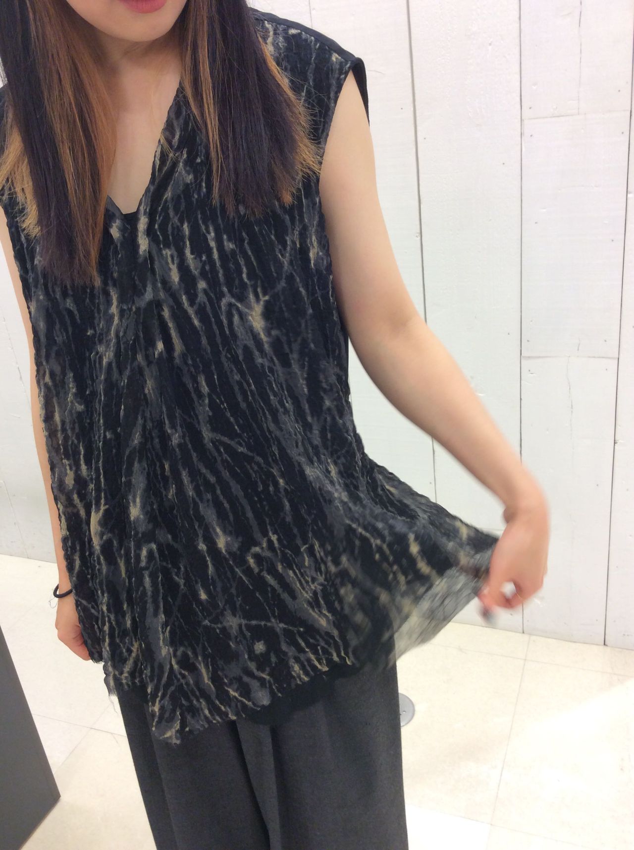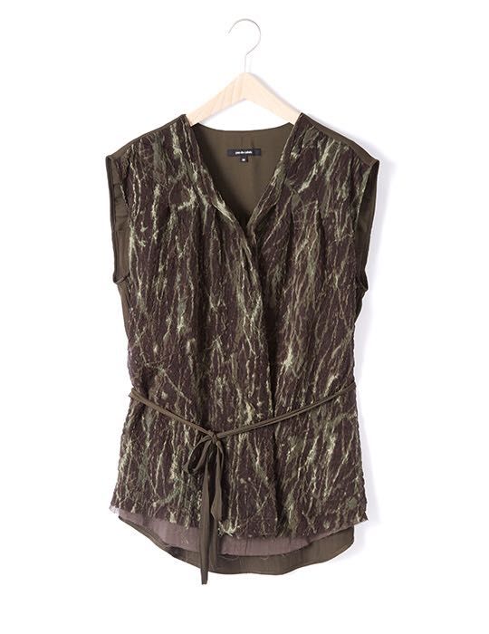 生地のシボ感と柔らかい動きを活かし、前身頃にデザインタックを入れることで立体感を出しました。
