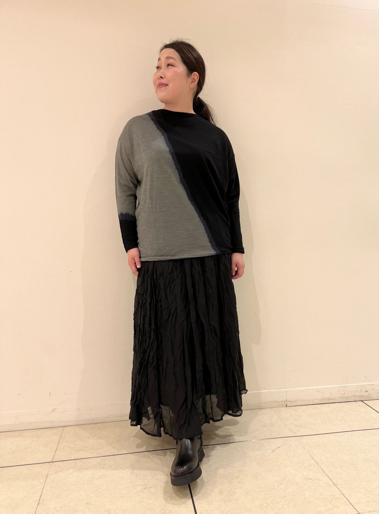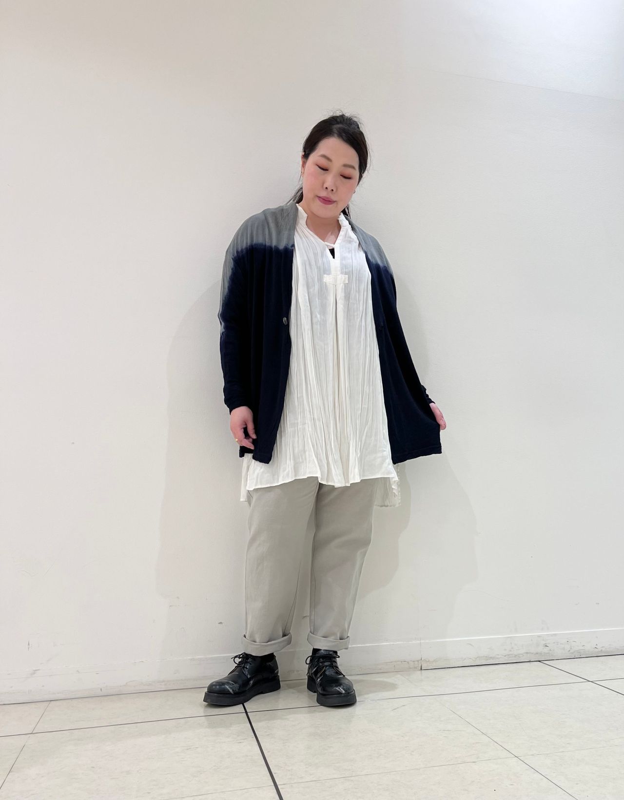 ゆったりとした身巾感に裾巾を小さめにして腰にかかるようなシルエット。
