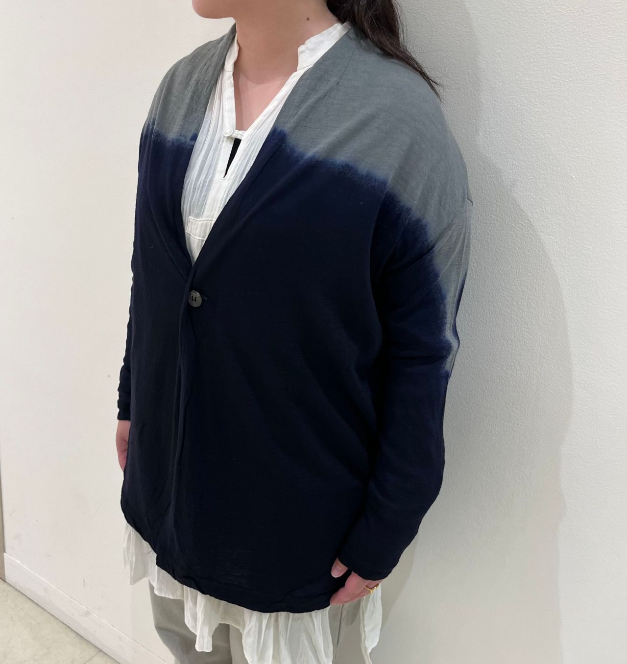 前ボタンが一つあり、止めて着ると漬け染めの風合いが綺麗に見えます。