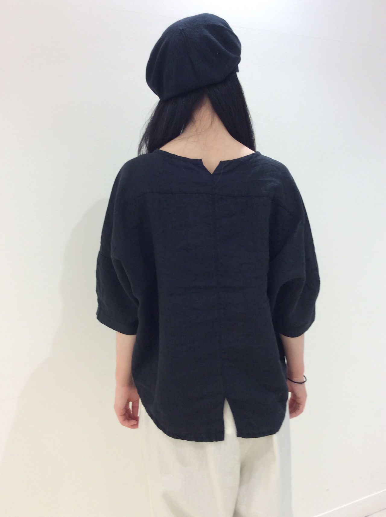 後ろ衿ぐりと裾にスリットを入れたデザインです。