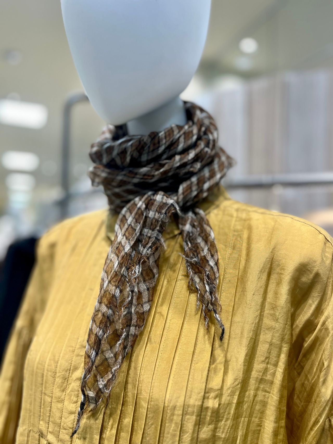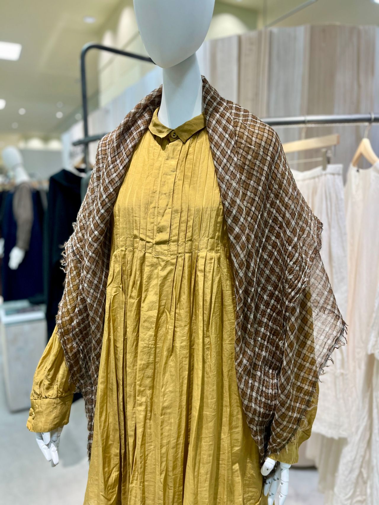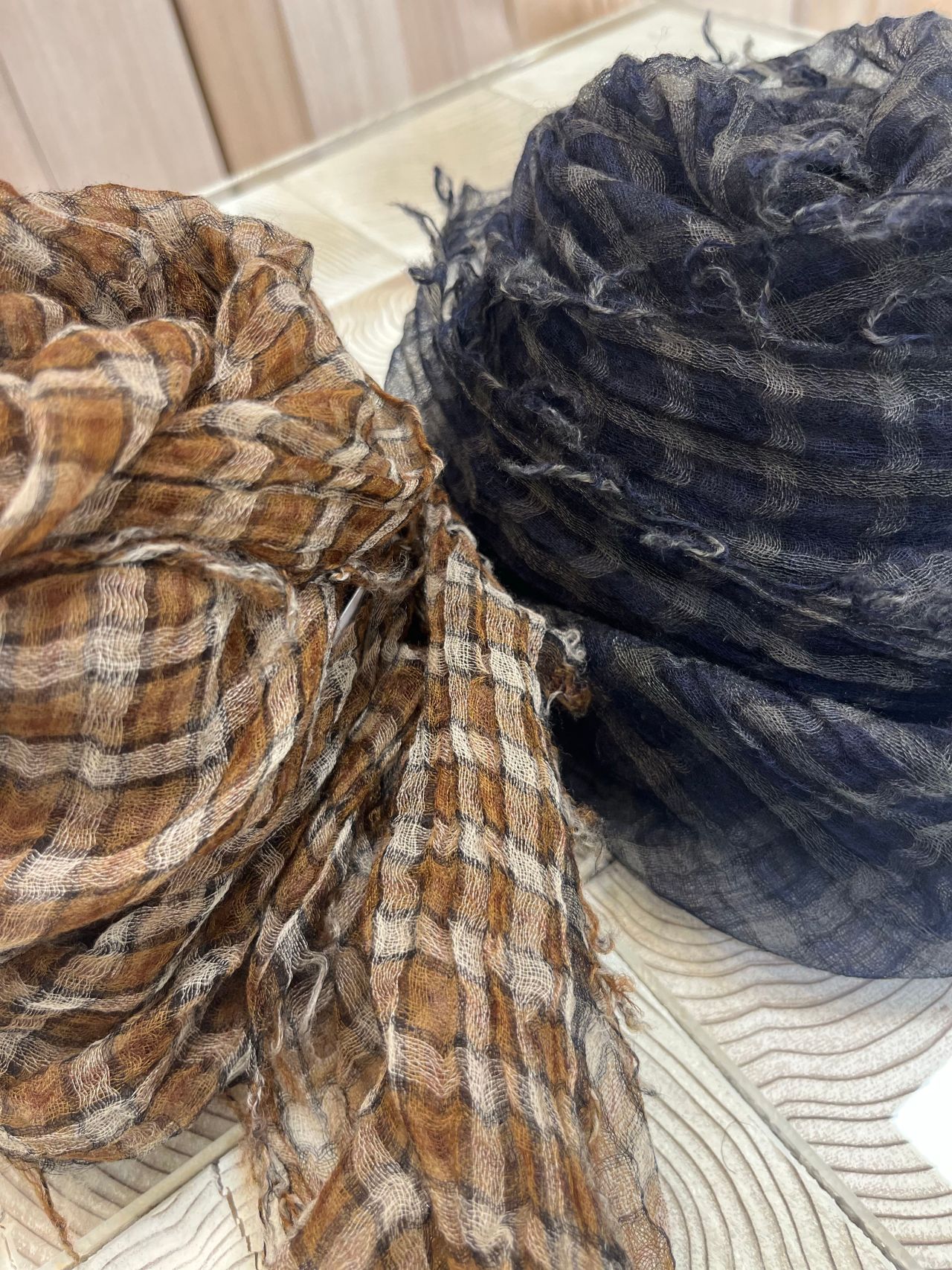 広げるとこのような大きさですが、カシミヤの薄く柔らかなこちらのストールはフワッと肩にかけても良いですし、クシュクシュとコンパクトにもなります。