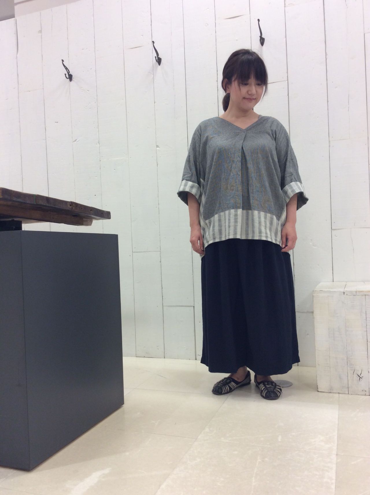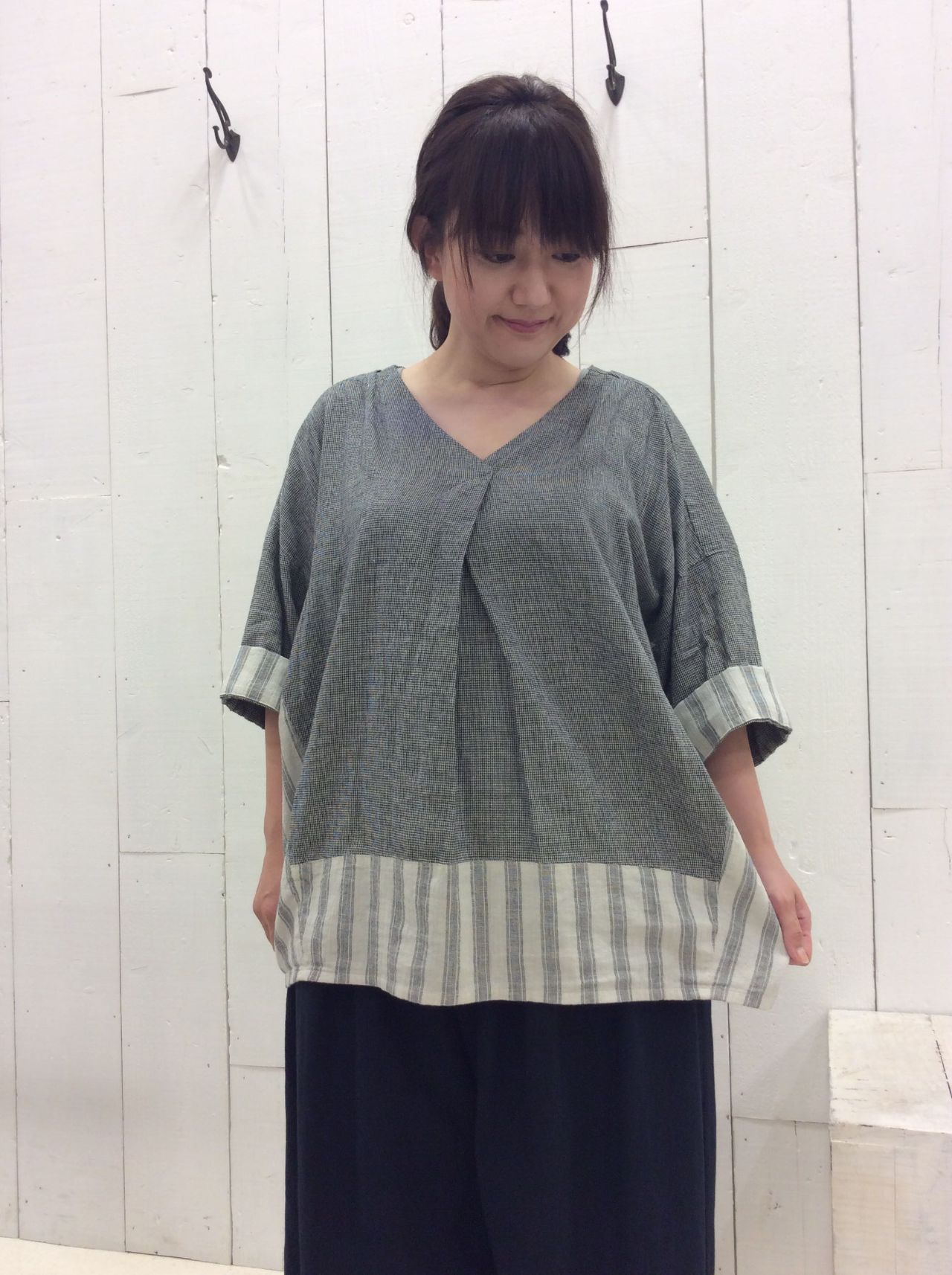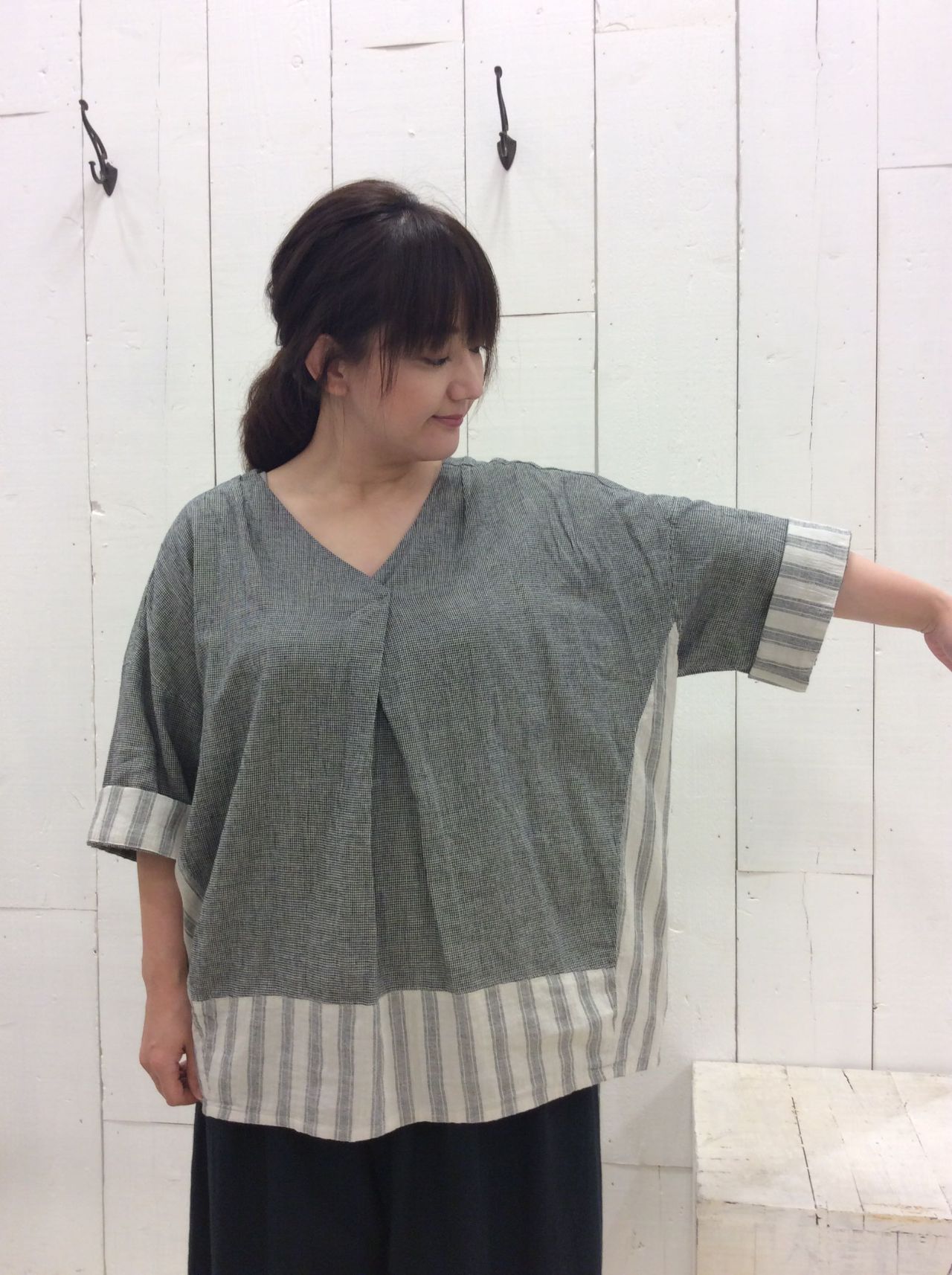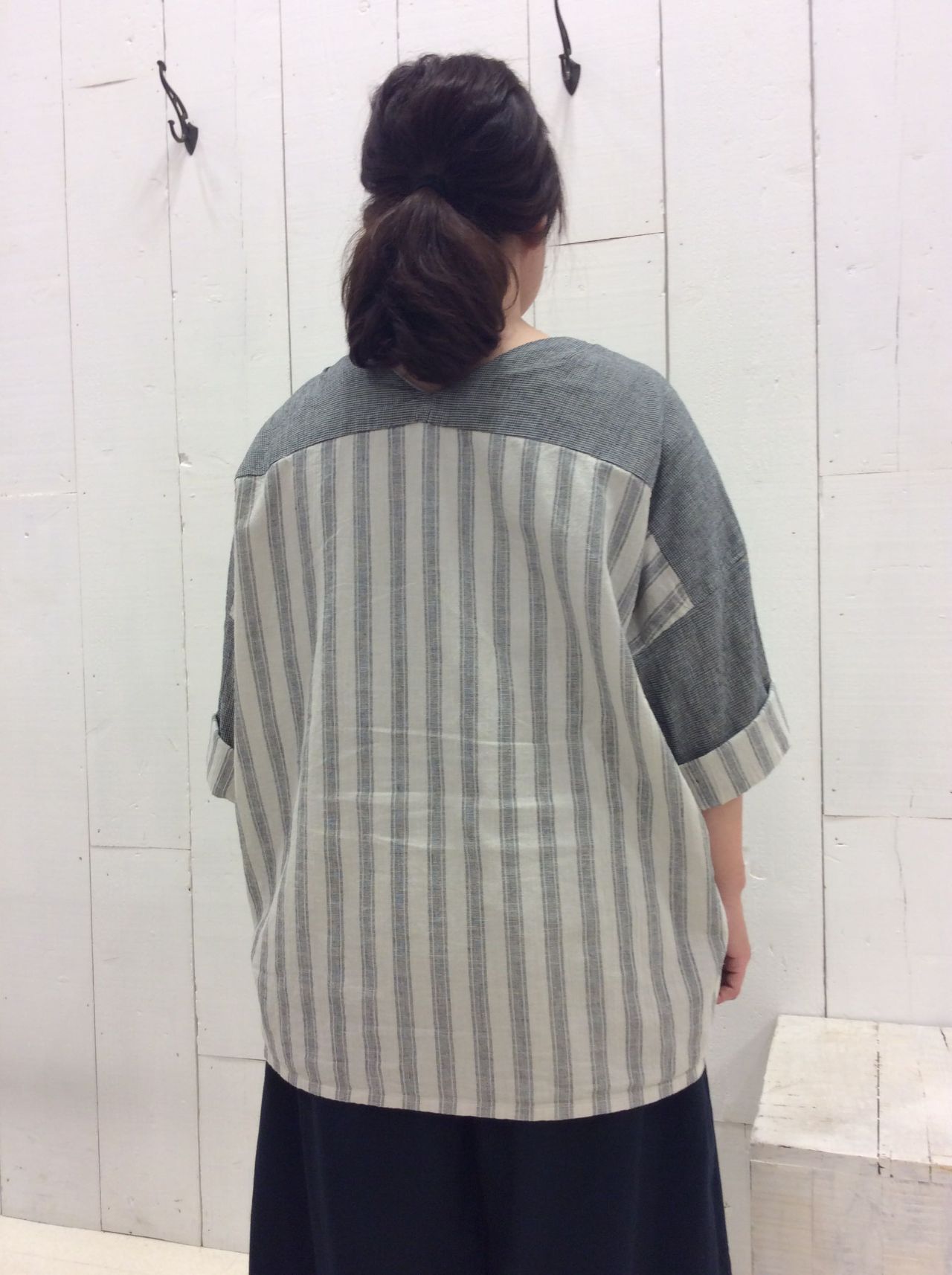 生成りの綿麻に、千鳥と太巾ストライプの柄が入った生地を組み合わせて、製品染めをしてナチュラルな風合いに仕上げました。