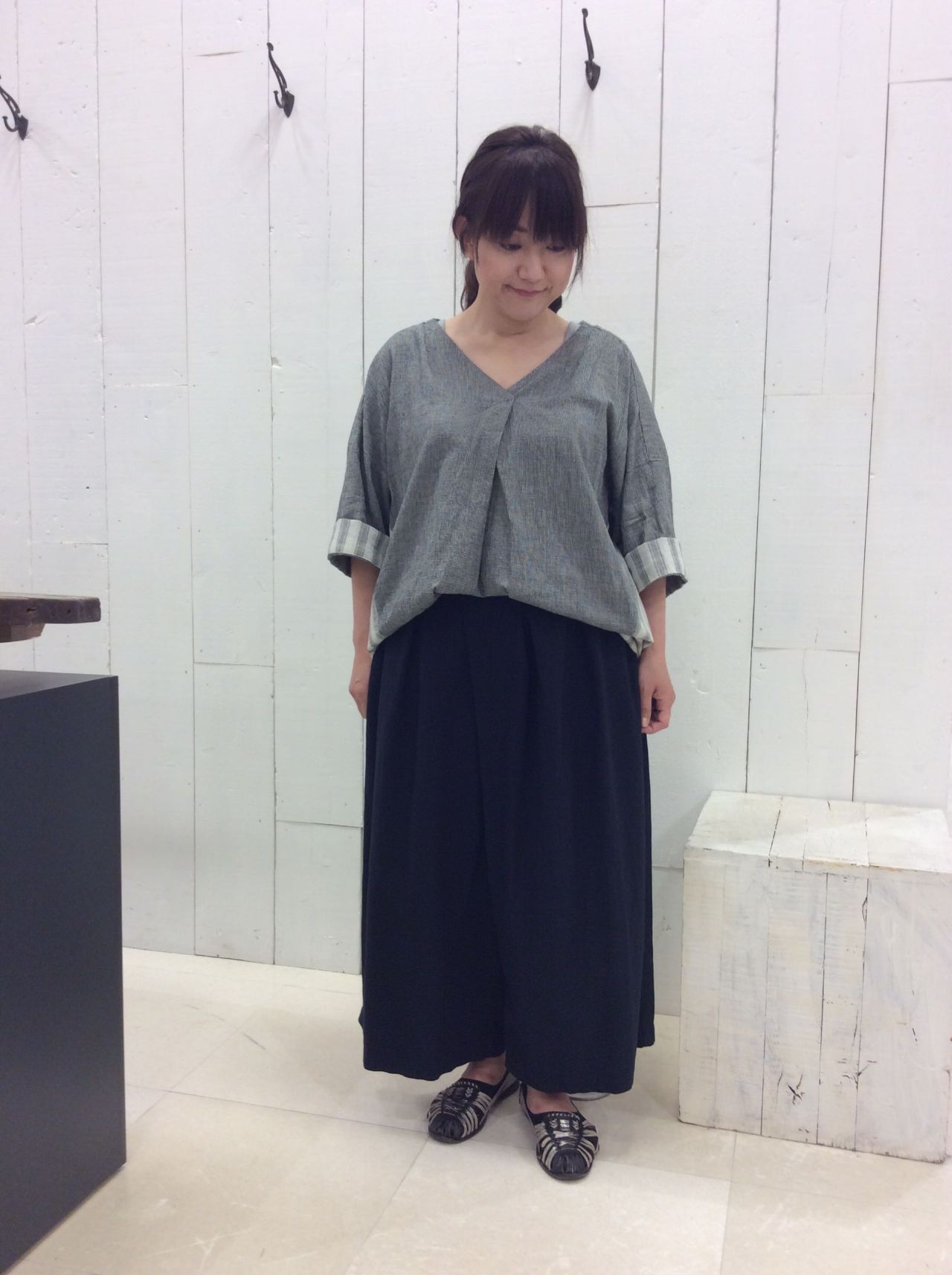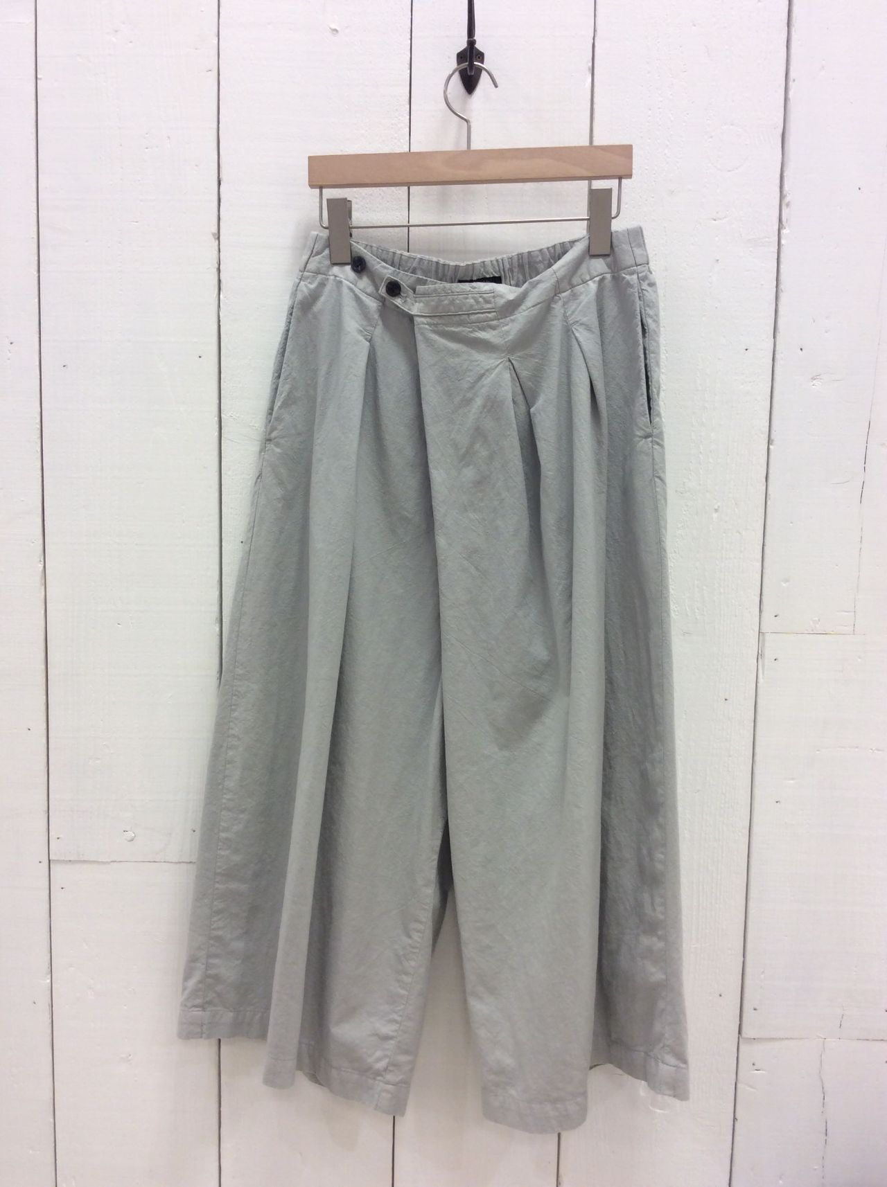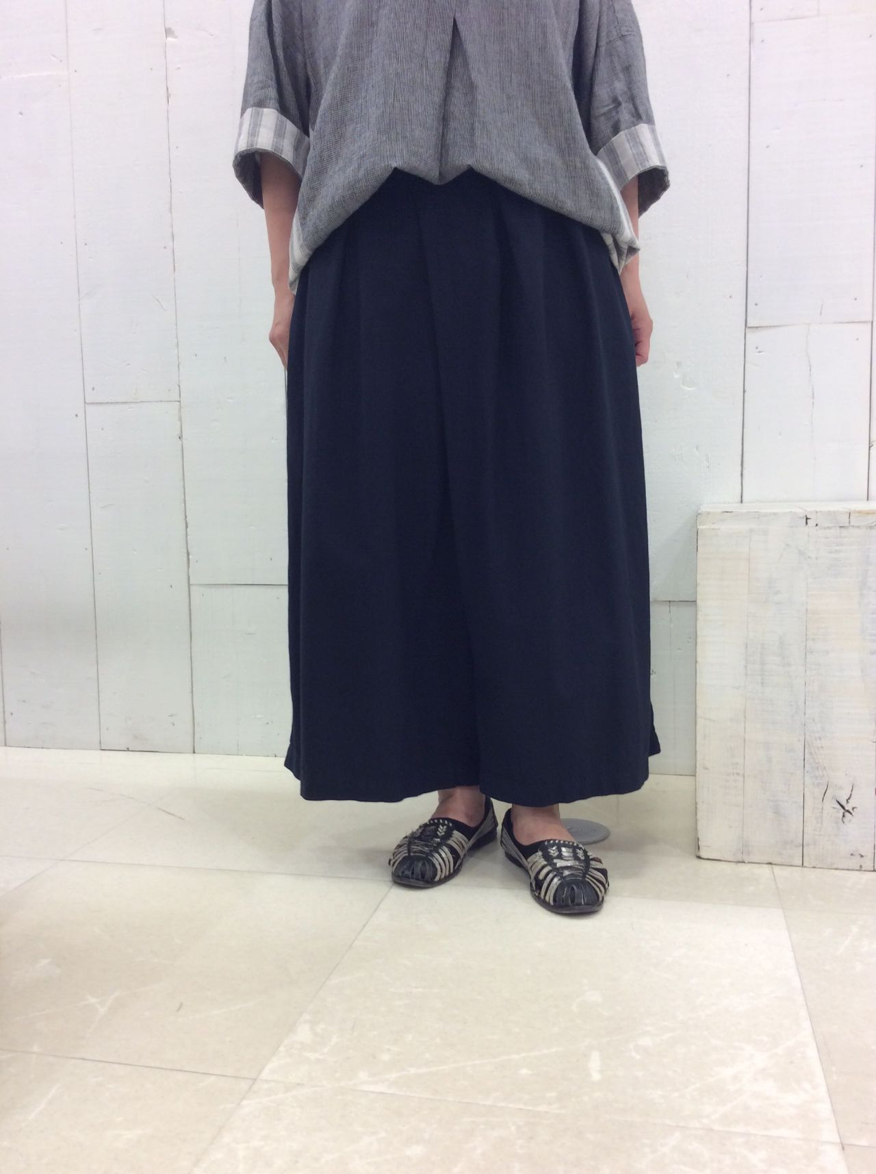 スカートの様に裾幅が広いラップパンツ。後ウエストがゴムになっており履きやすい仕様です。