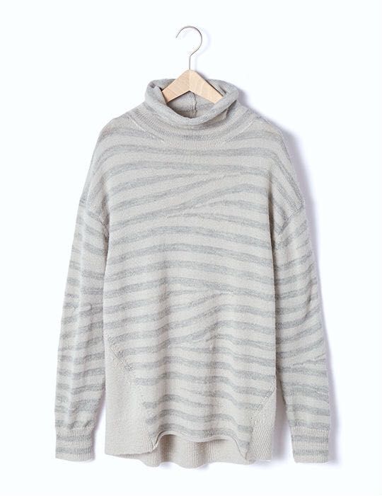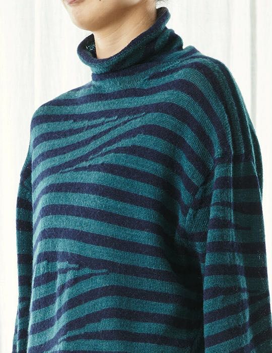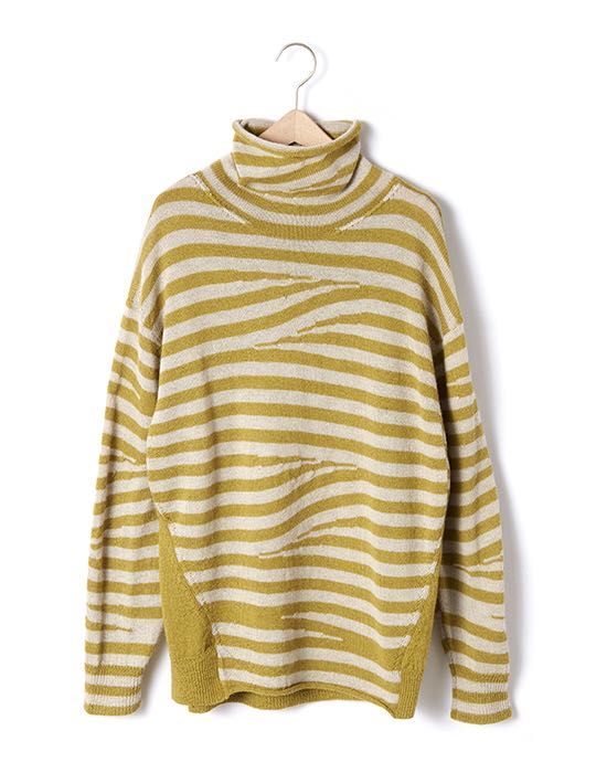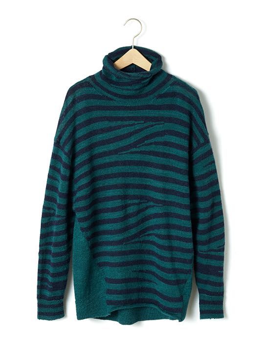 編みのテクニックだけで、ボーダーをイレギュラーに交差させて、遊び心のあるテキスタイルになってます。