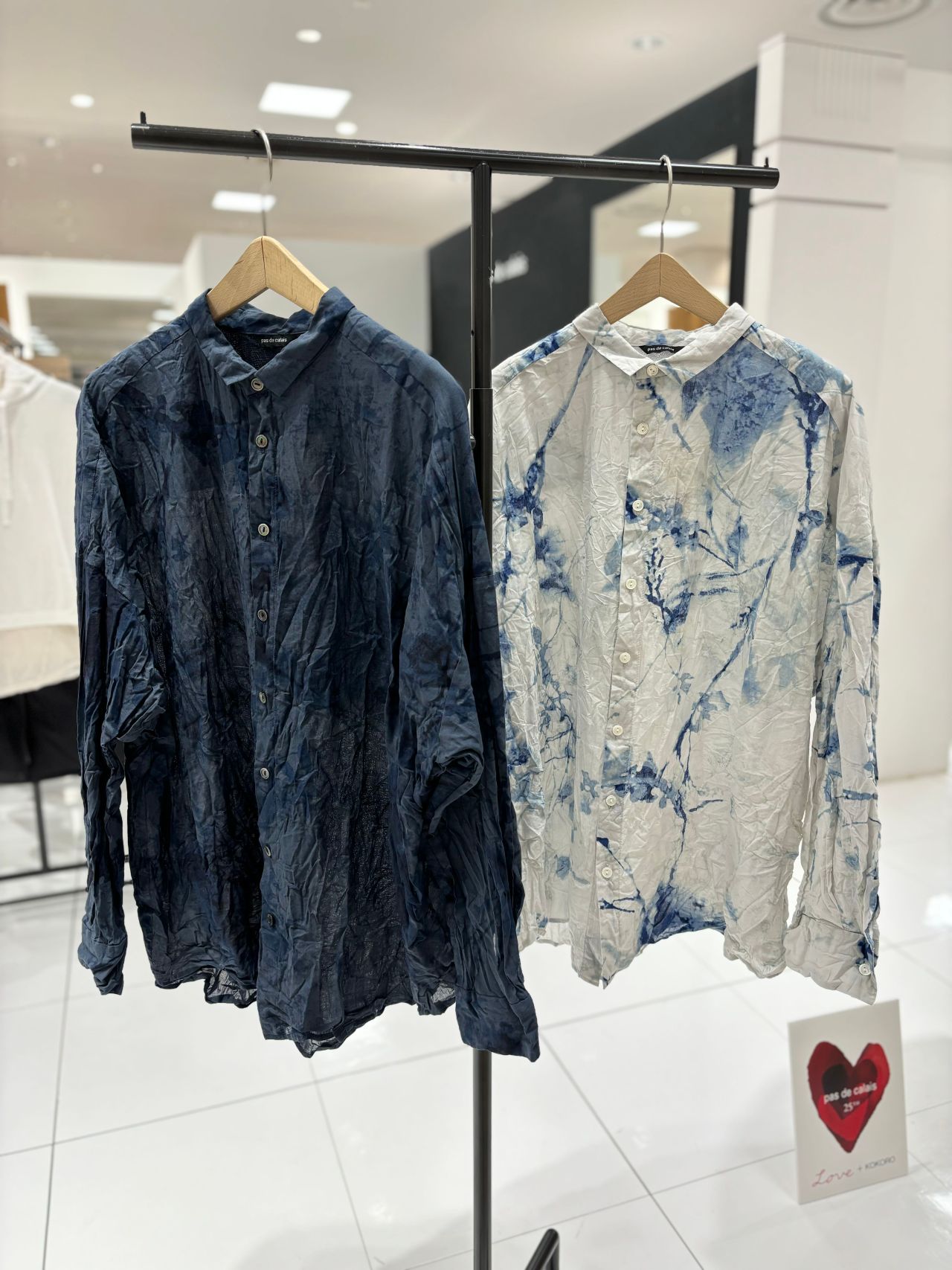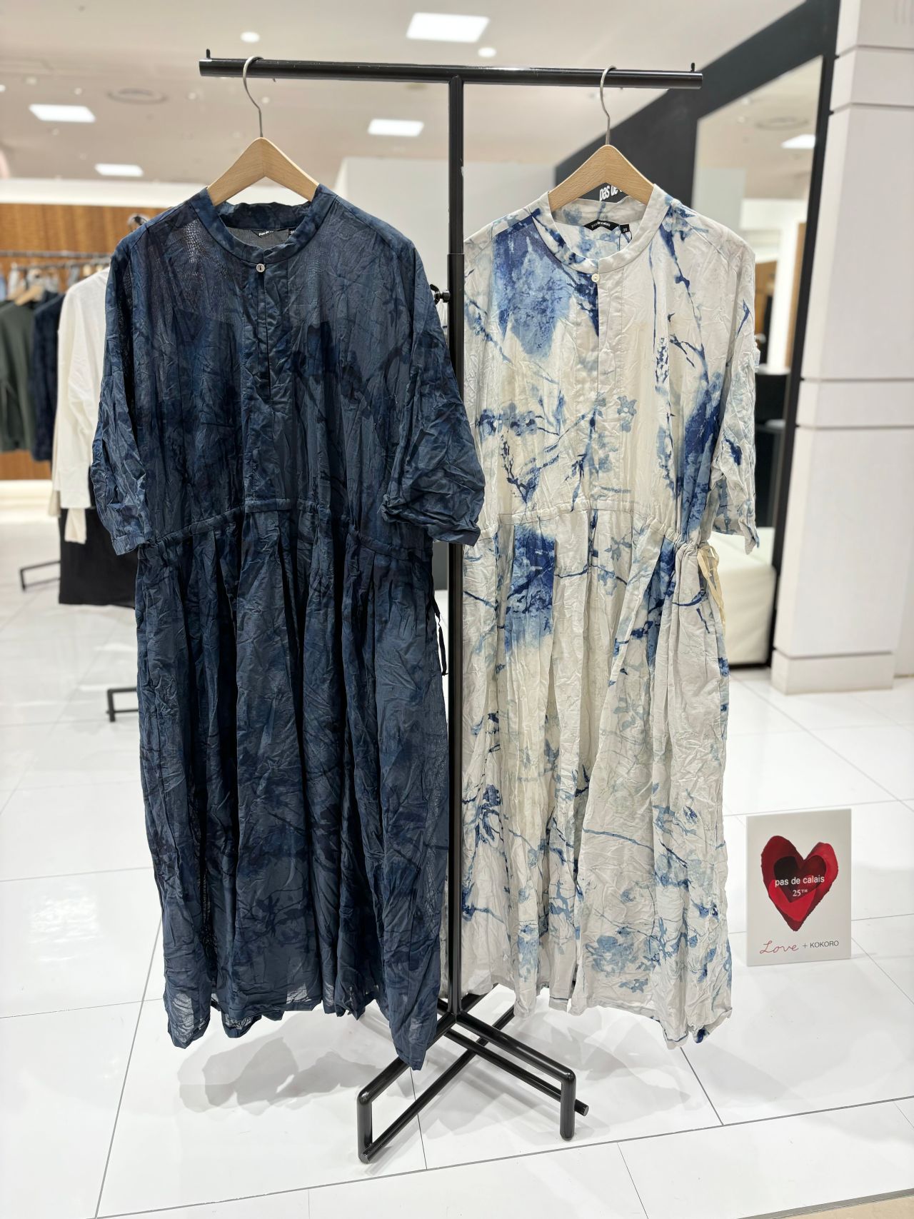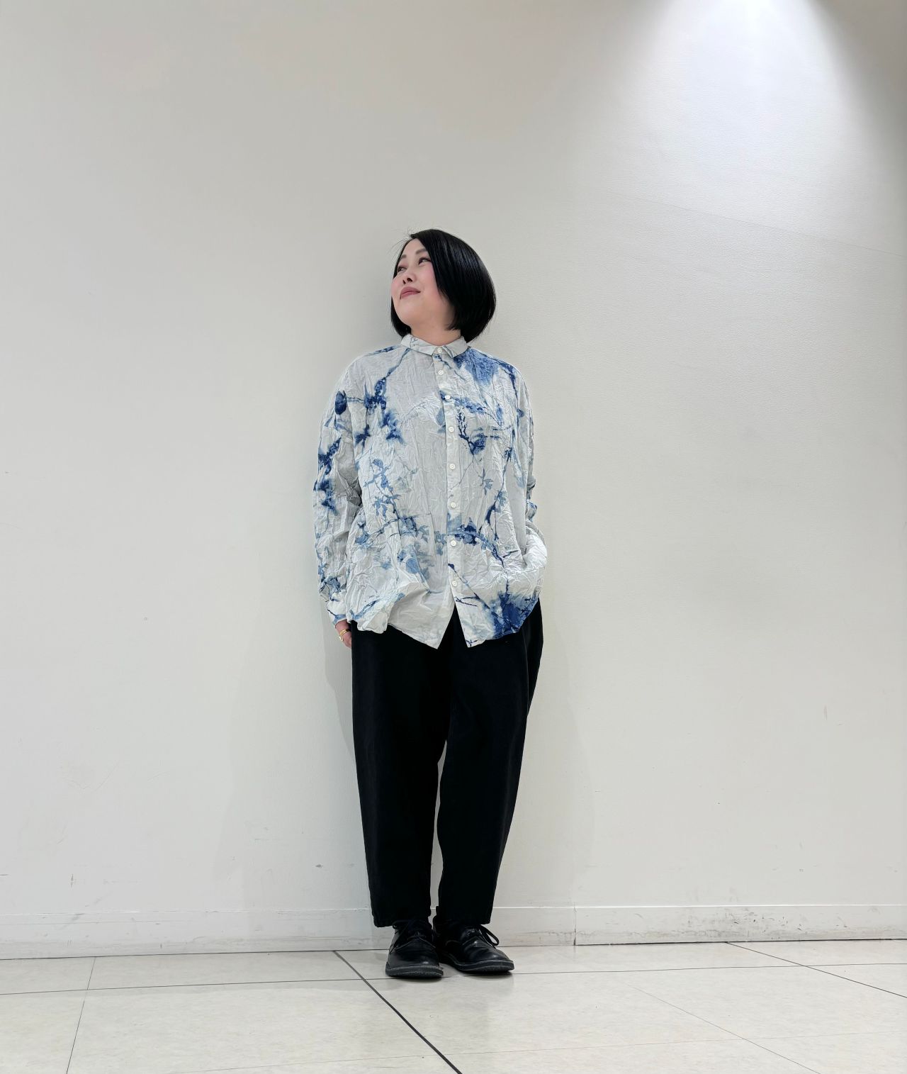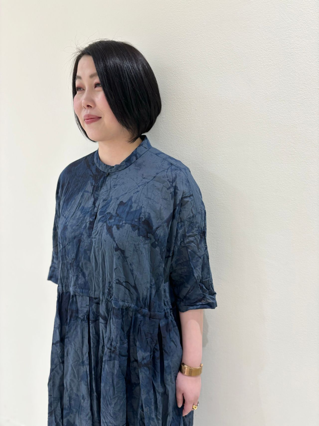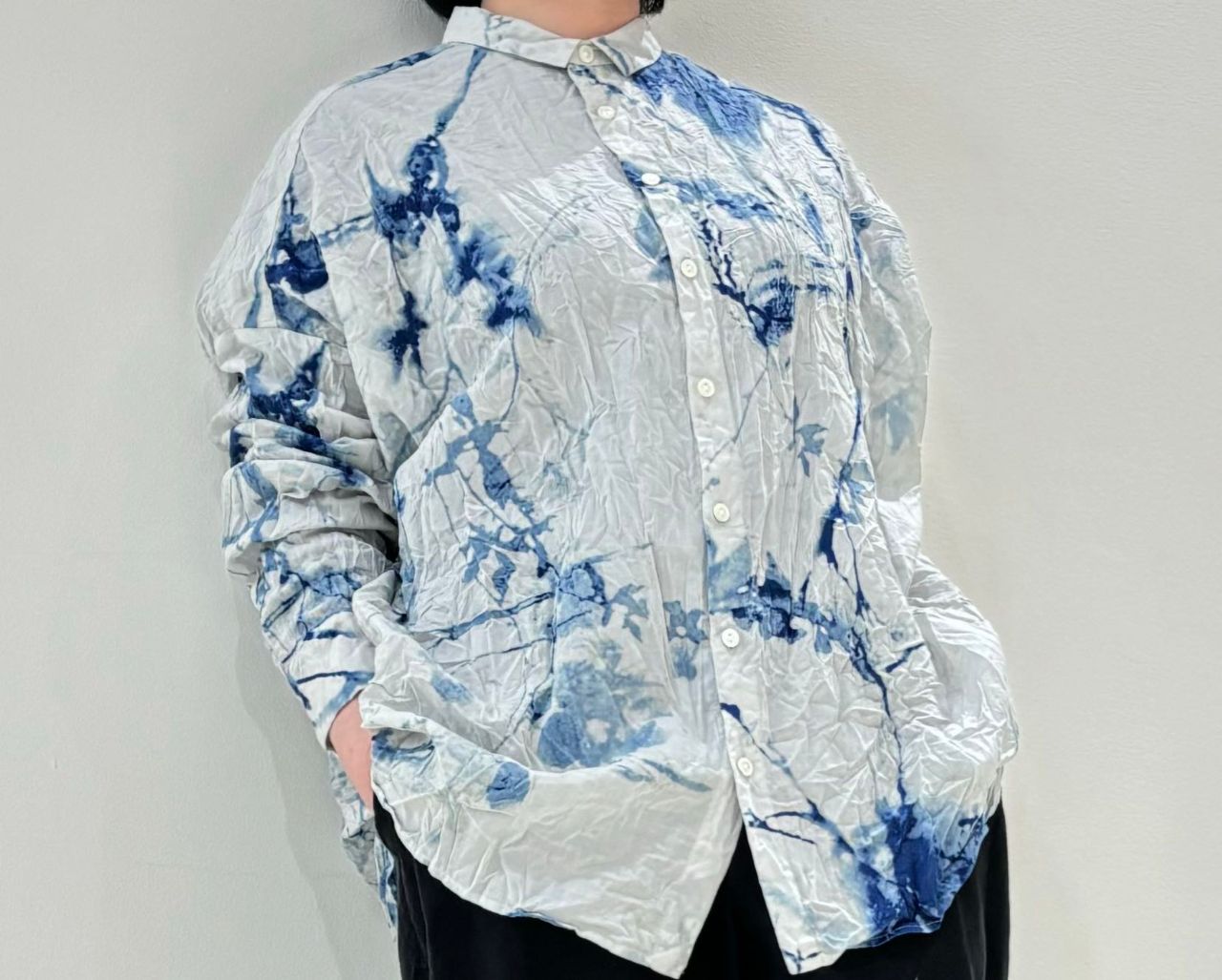 大胆なプリントが目を惹きます。藍染を施す際に現れる滲んだような波紋を花に表現。