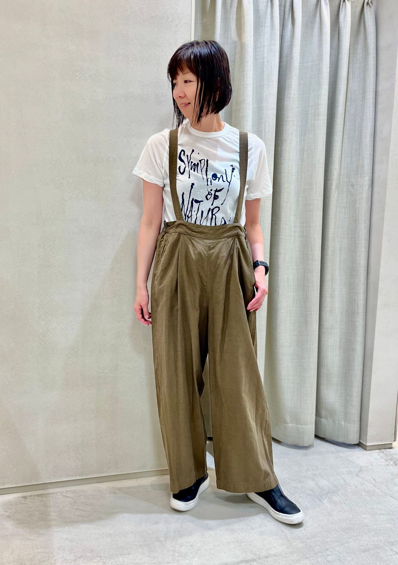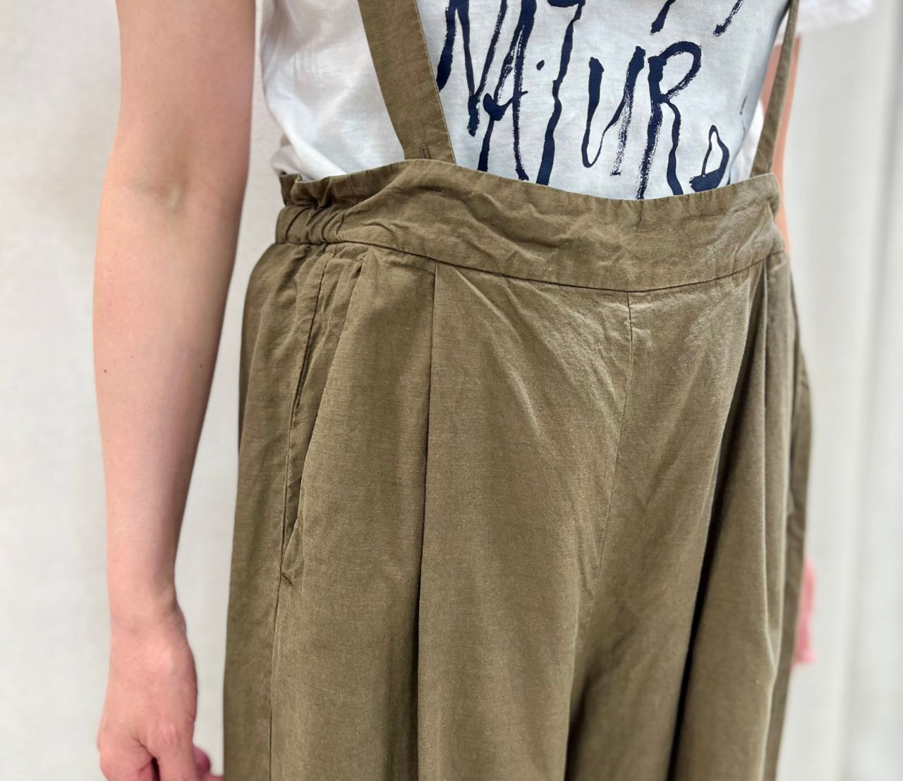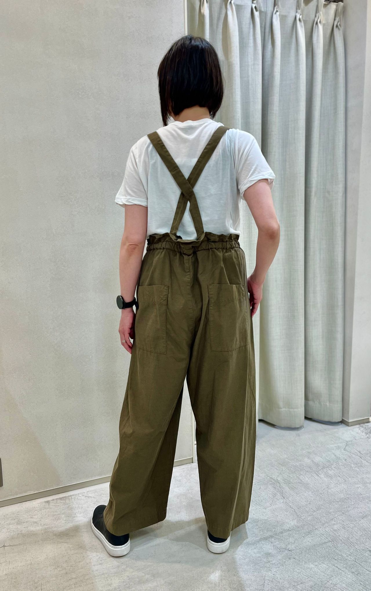 こちらのパンツは落ち感のある素材にこだわった大人のためのサロペットパンツです。