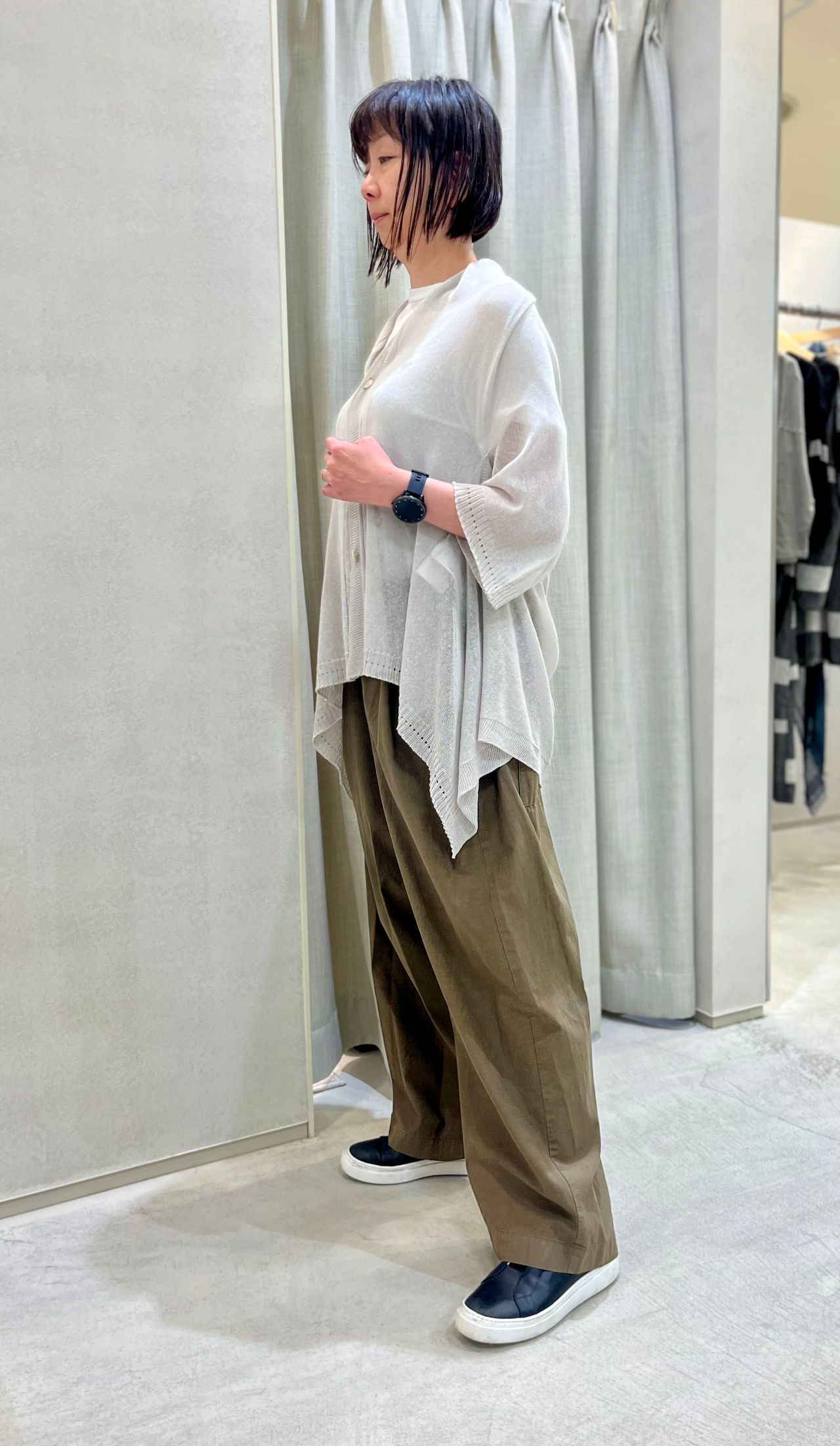 そしてあえてボーイッシュなワイドパンツにこちらのエレガントなカーディガンを合わせると素敵です。