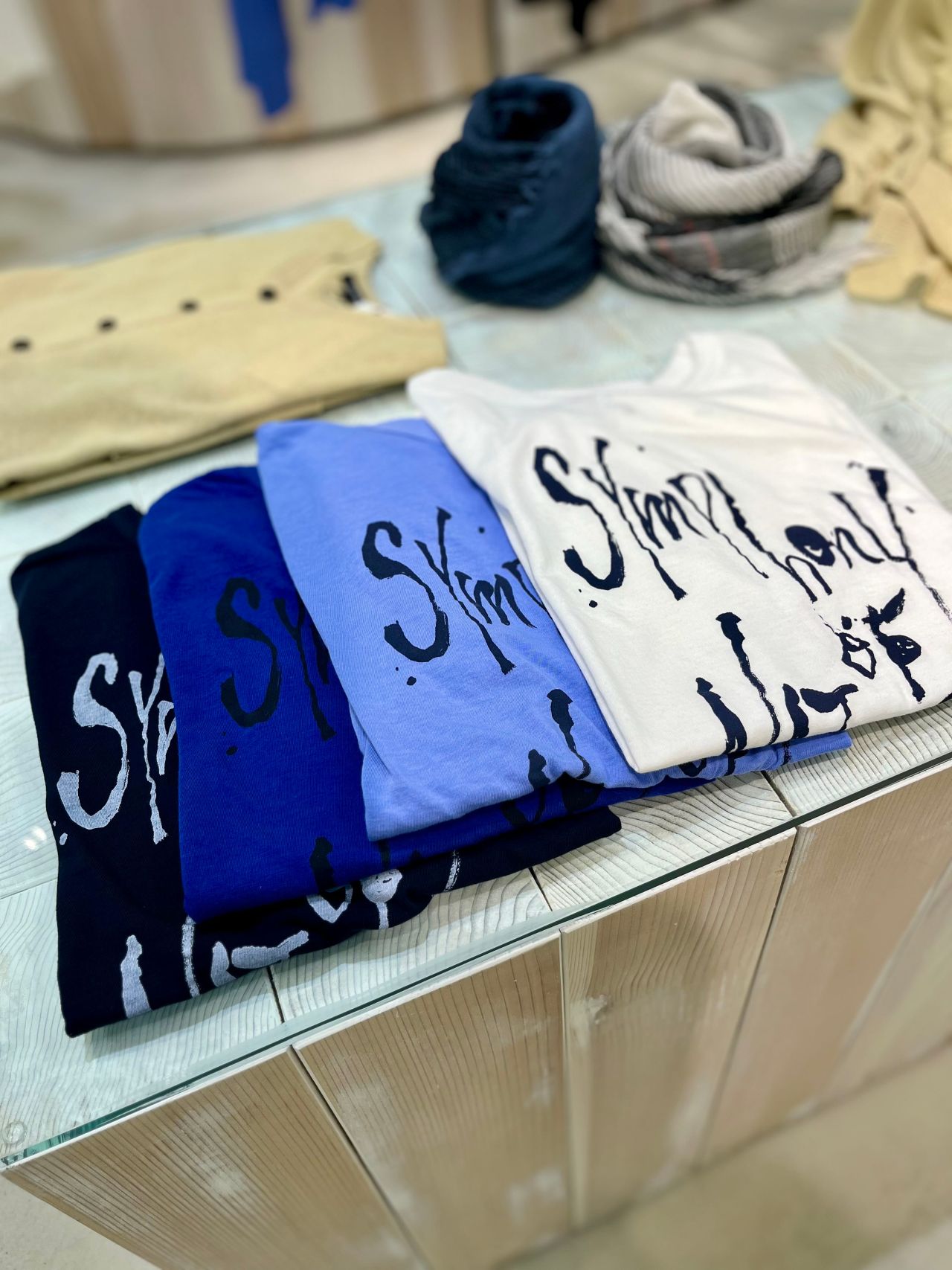前身頃に今回のテーマ「Symphony ofNature」のハンドロゴ・プリント加工し、更に風合い出しのためにホワイト:製品湯洗い、その他:製品にてオーバーダイ(反応染め)加エをしています。