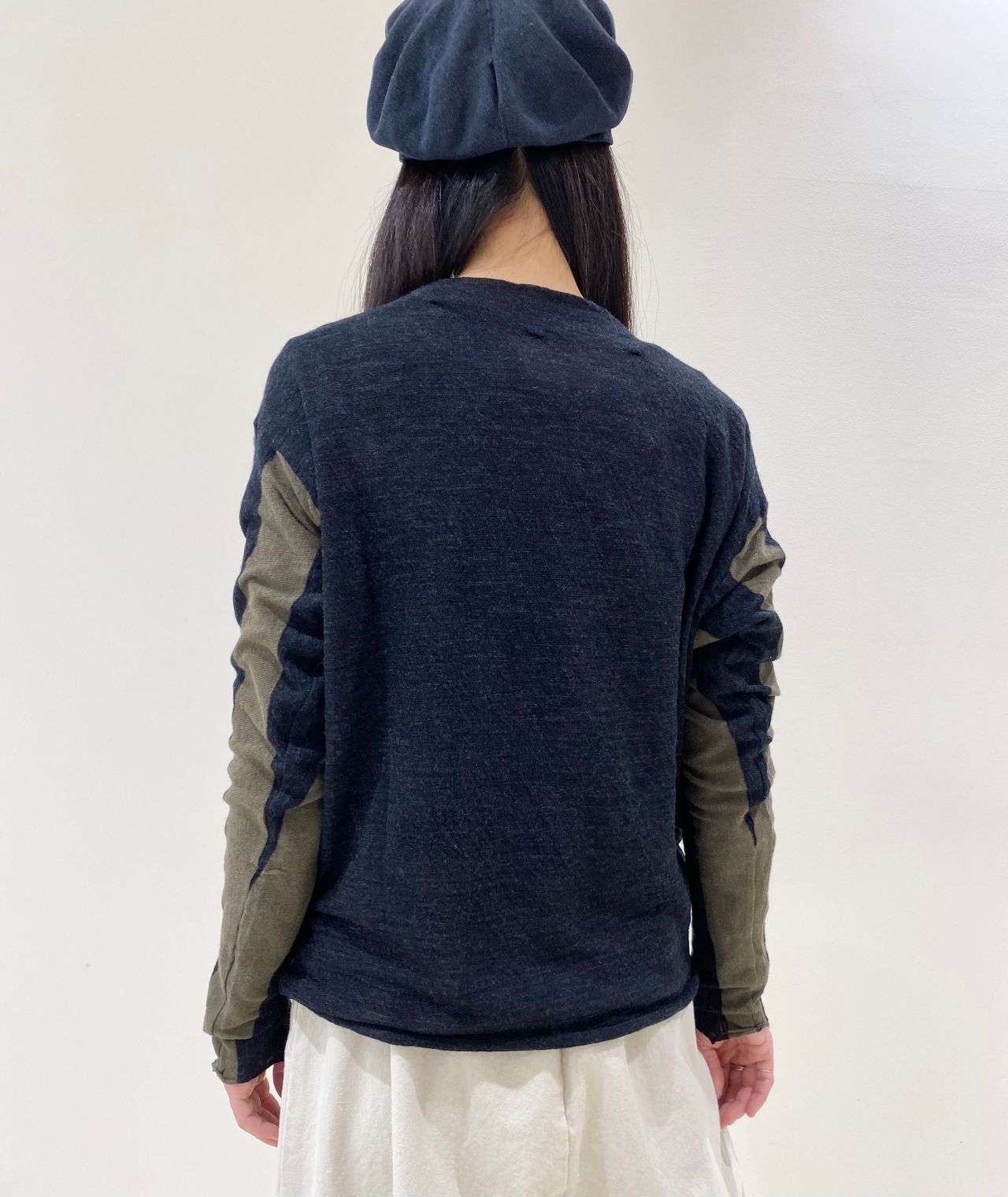 前身頃はボーダー、袖と後身頃はすっきりした無地のウールガーゼを切替えてメリハリをつけました。