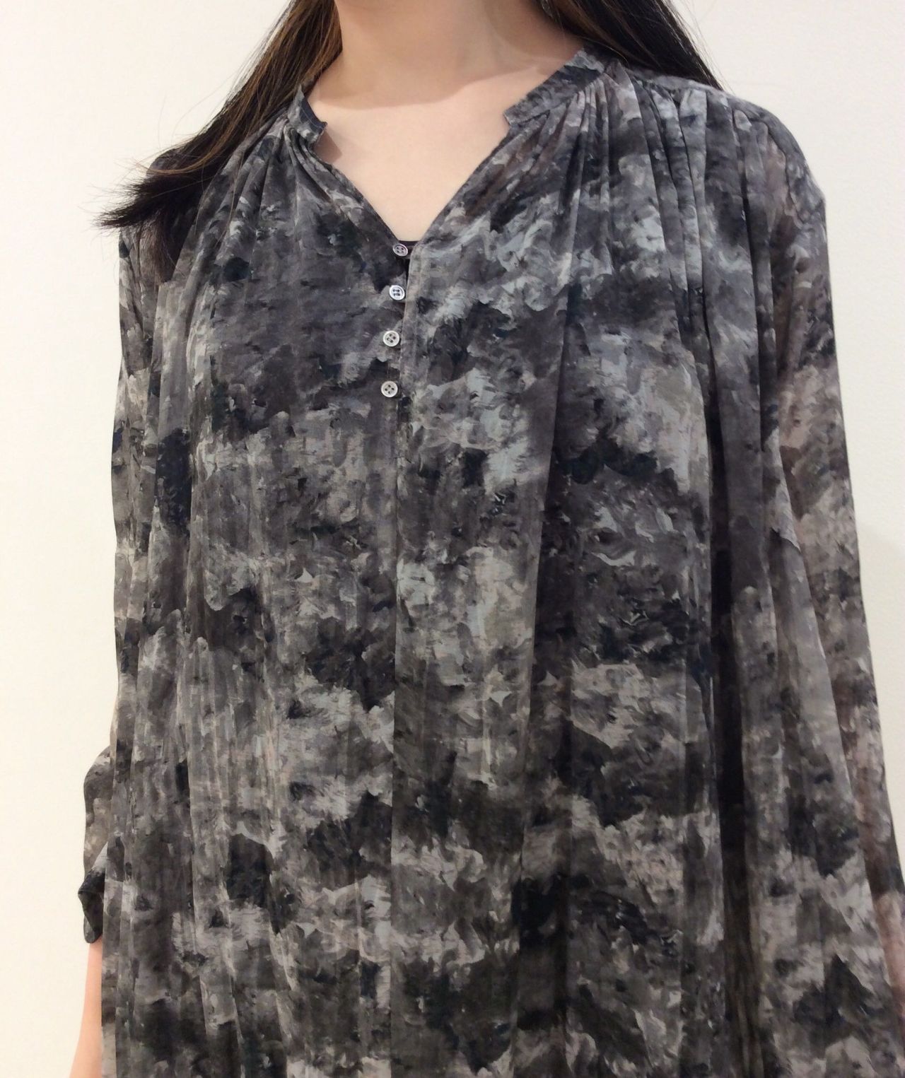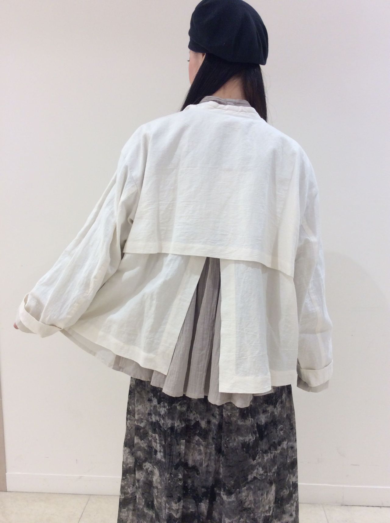 ギャザーが入った全体的にゆったりしたシルエットに、後ろがやや長めになっています。