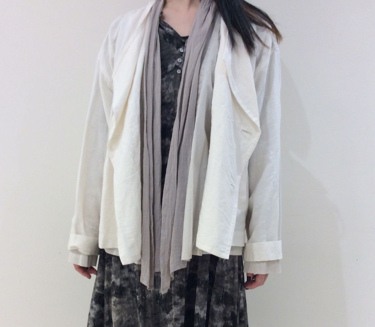 同系色コーディネートでまとめて大人の雰囲気にしたり、下にパンツを重ねてカジュアルにしていただいても素敵です。