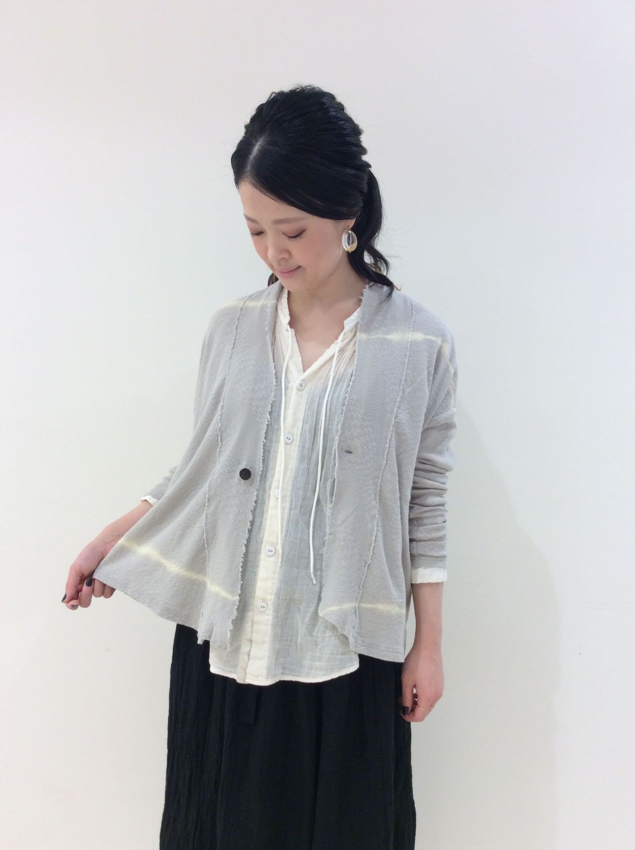 前開きなので、ワンピースやノースリブに羽織っていただいてもシアー感が出て素敵です。