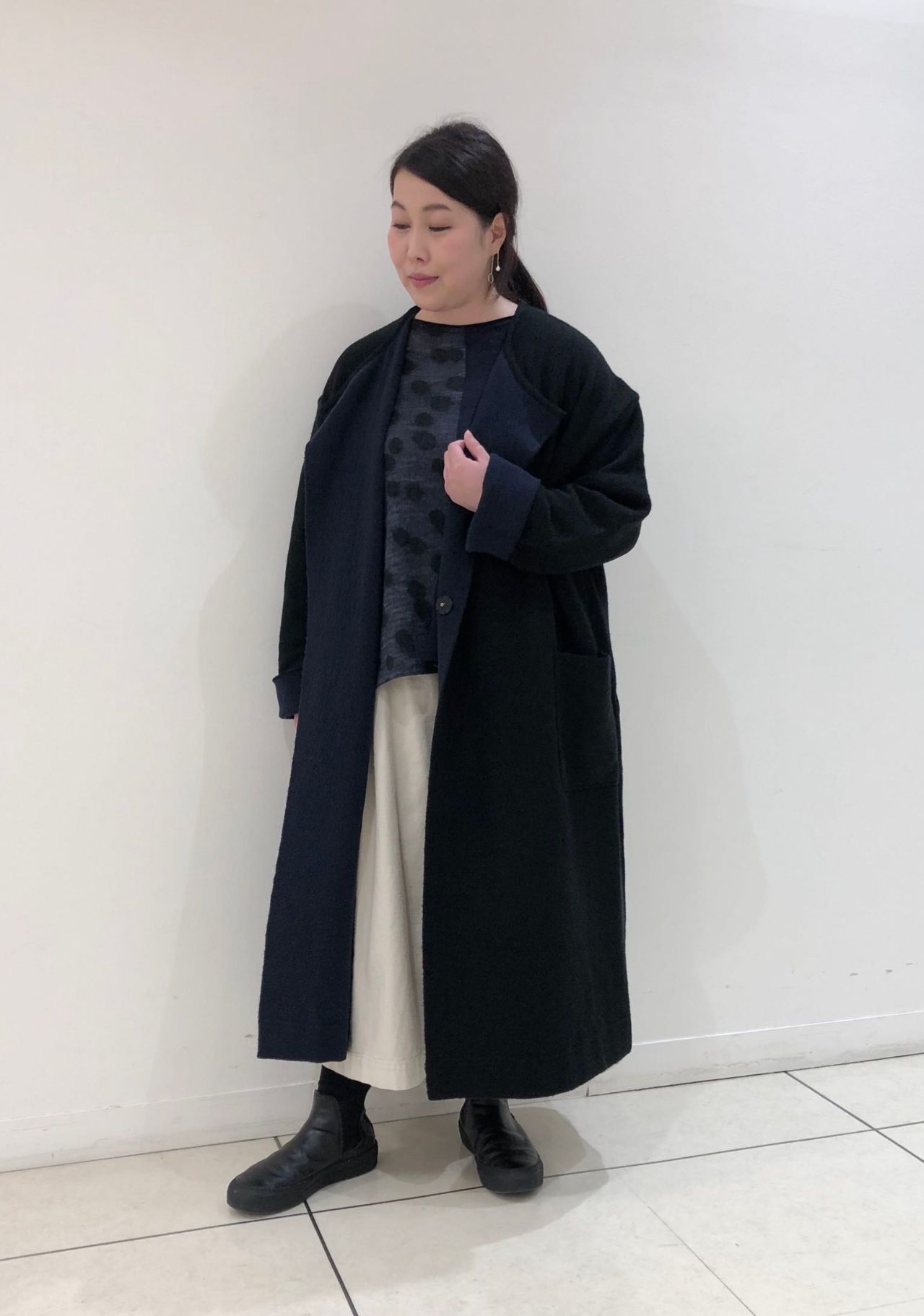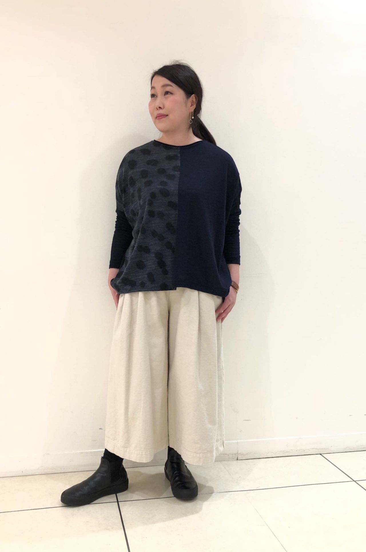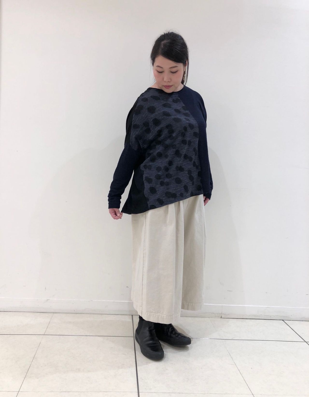前回高田が合わせていた綿ダック両面針布起毛パンツにゆったりと羽織れるニットローブとドットのプルオーバーで低身長の方でも着れるコーディネートにしました。