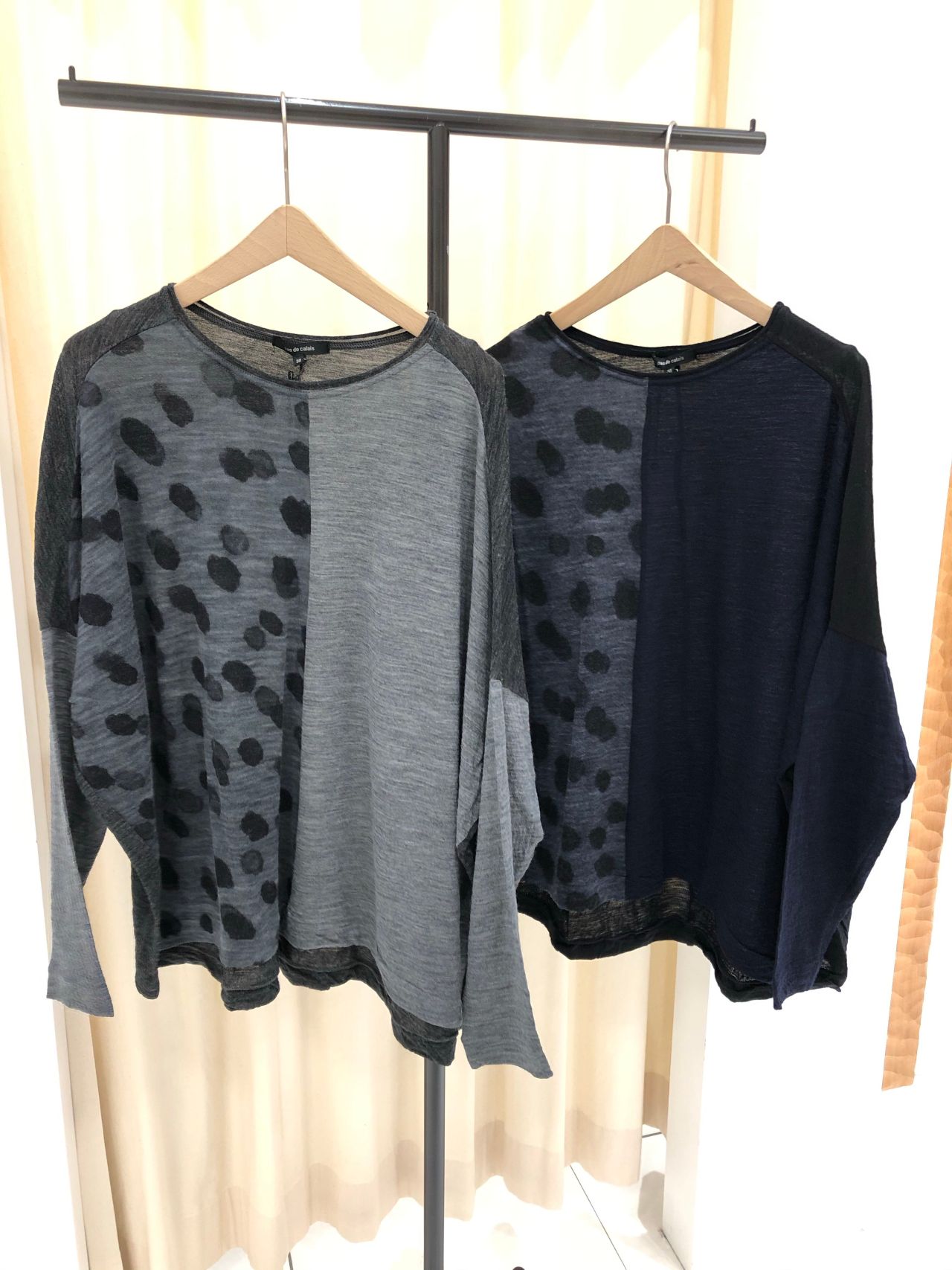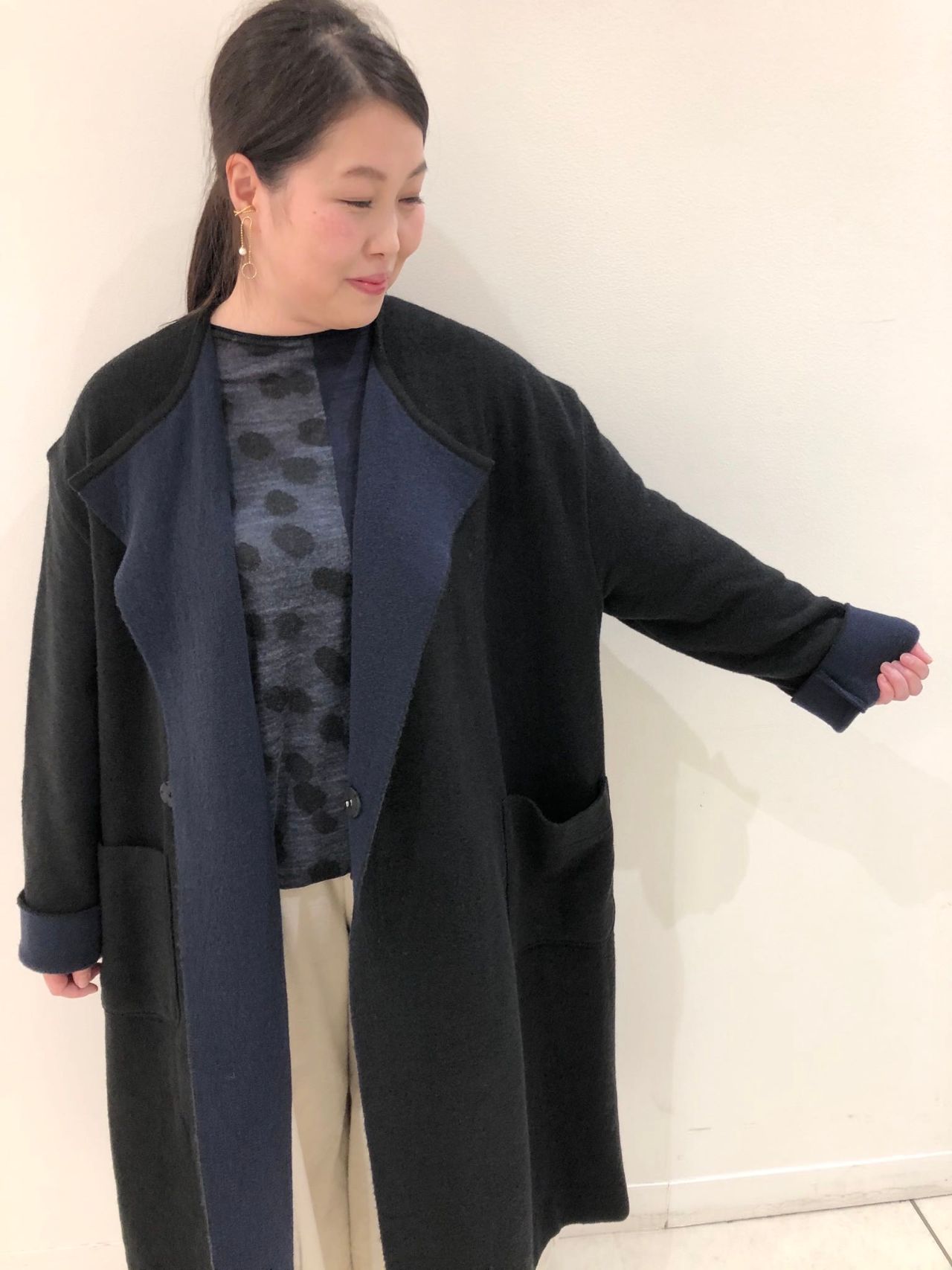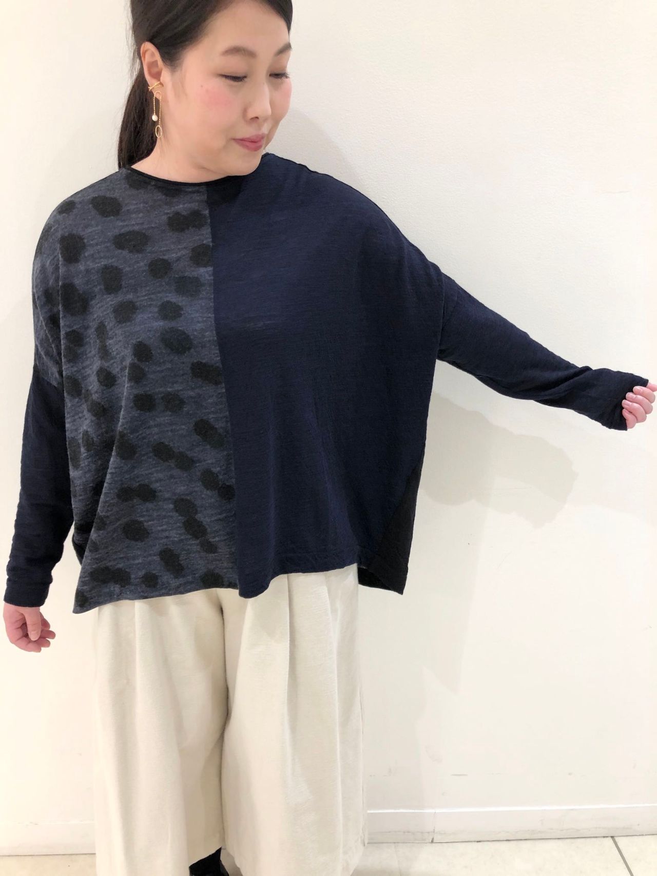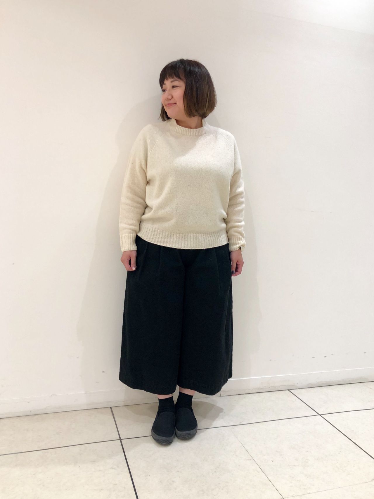 前回高田が合わせていた綿ダック両面針布起毛パンツにゆったりと羽織れるニットローブとドットのプルオーバーで低身長の方でも着れるコーディネートにしました。