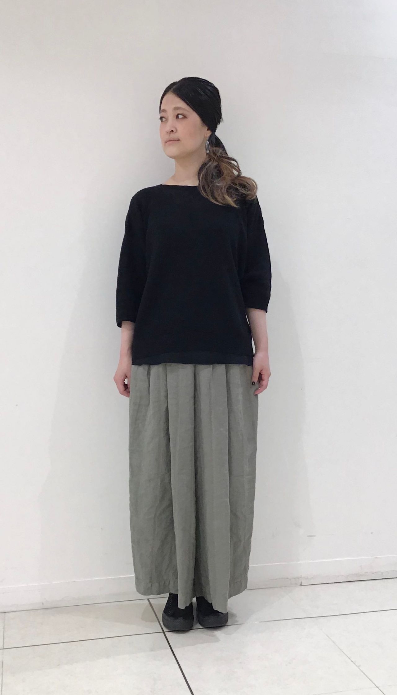 今回はたっぷりしたキュロットパンツで合わせ、ゆったりしたい日のコーディネートにしましたが、スッキリしたシルエットのパンツやスカートとのコーディネートもおすすめです。