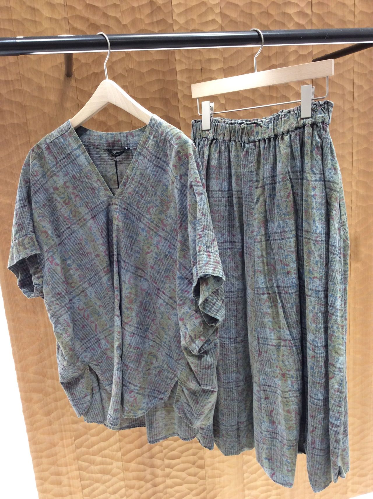 ブラウスはV開きのスッキリ涼しく着て頂けるプルオーバーです。