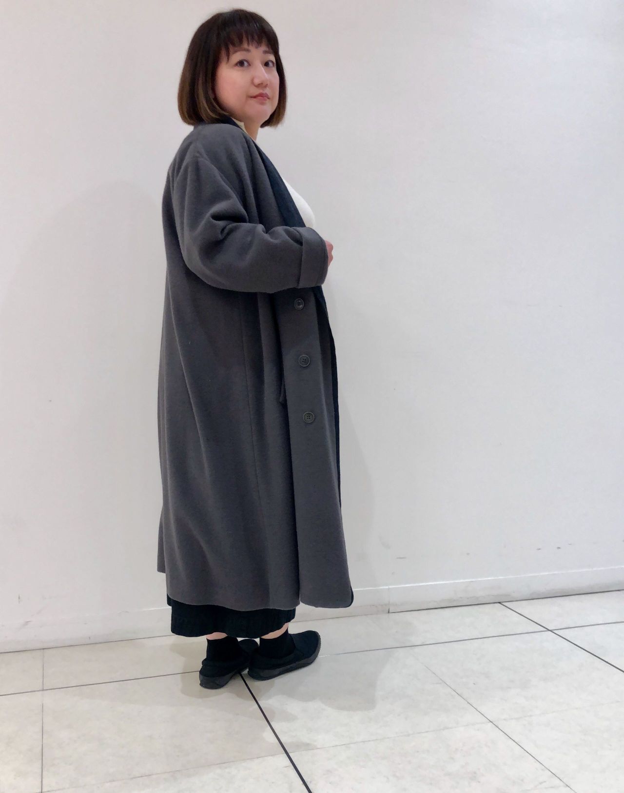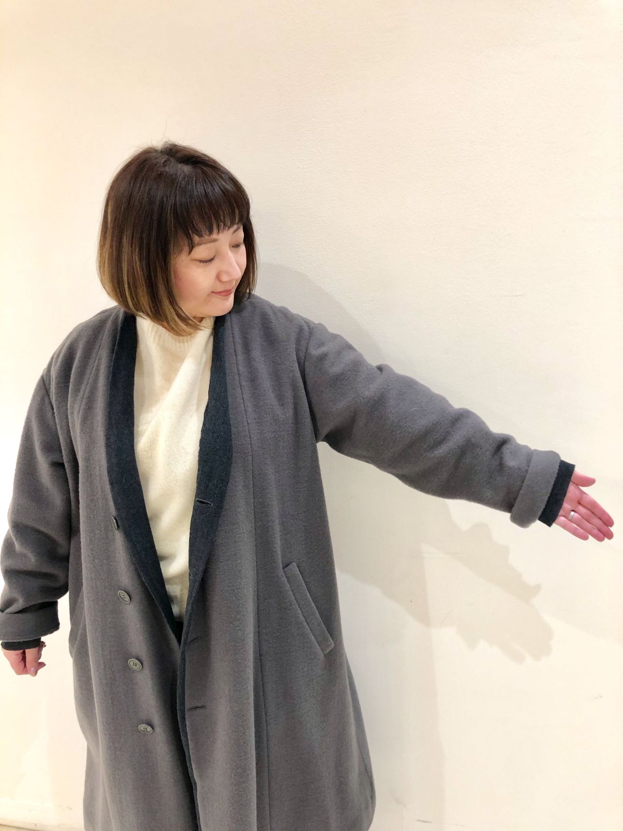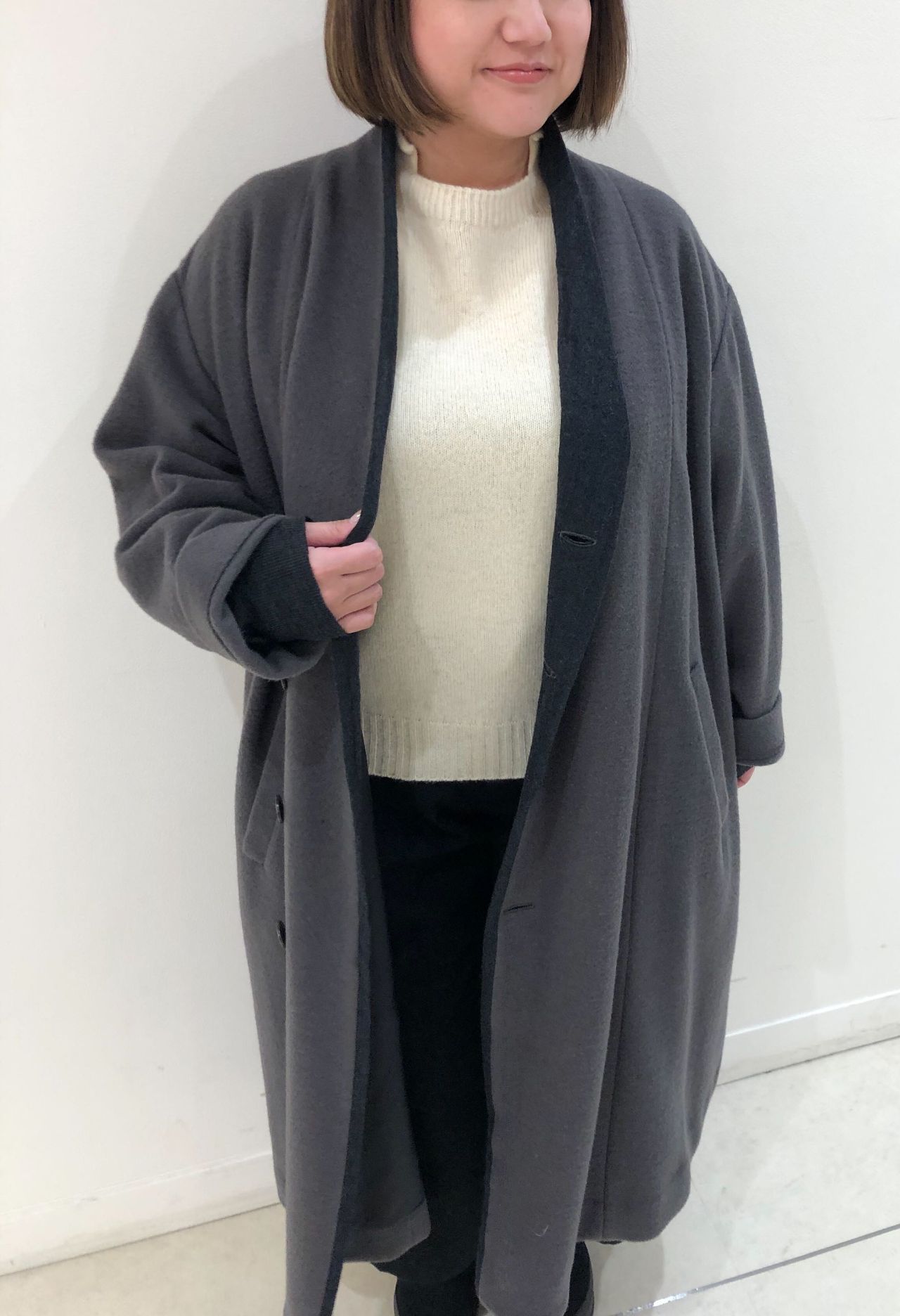 前回のニットモッサコートを取り入れ、秋にも冬にも最適なコーディネートをご紹介いたします。