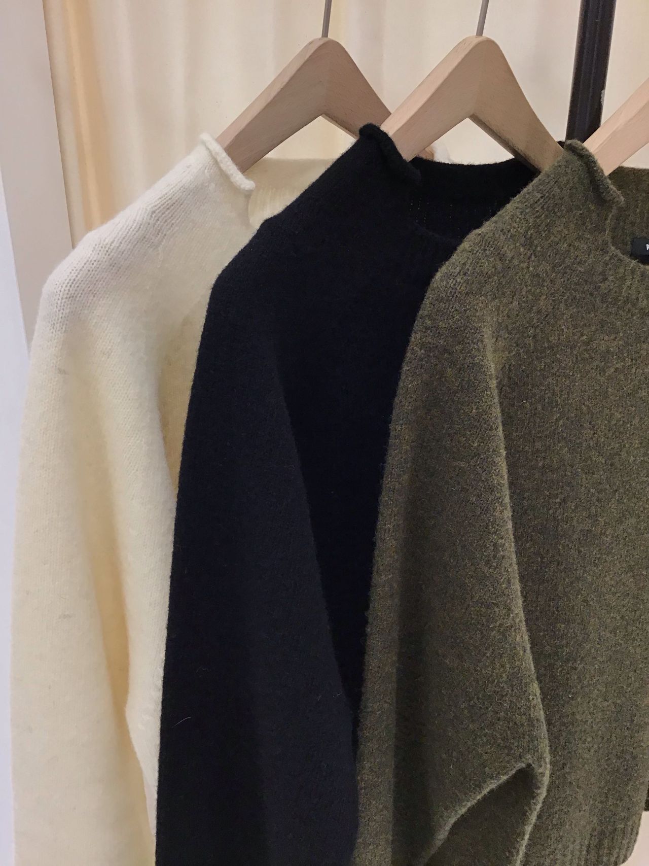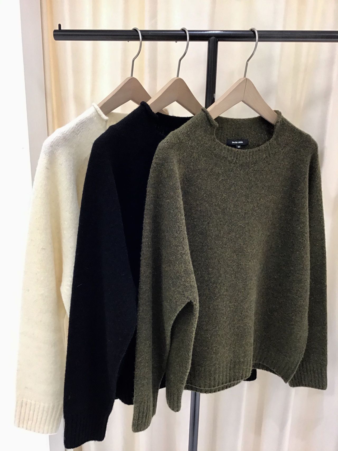 ハイネックを変形させたデザインで、首元がスッキリ見えるので、ハイネックが苦手な方にもおすすめのニットです。