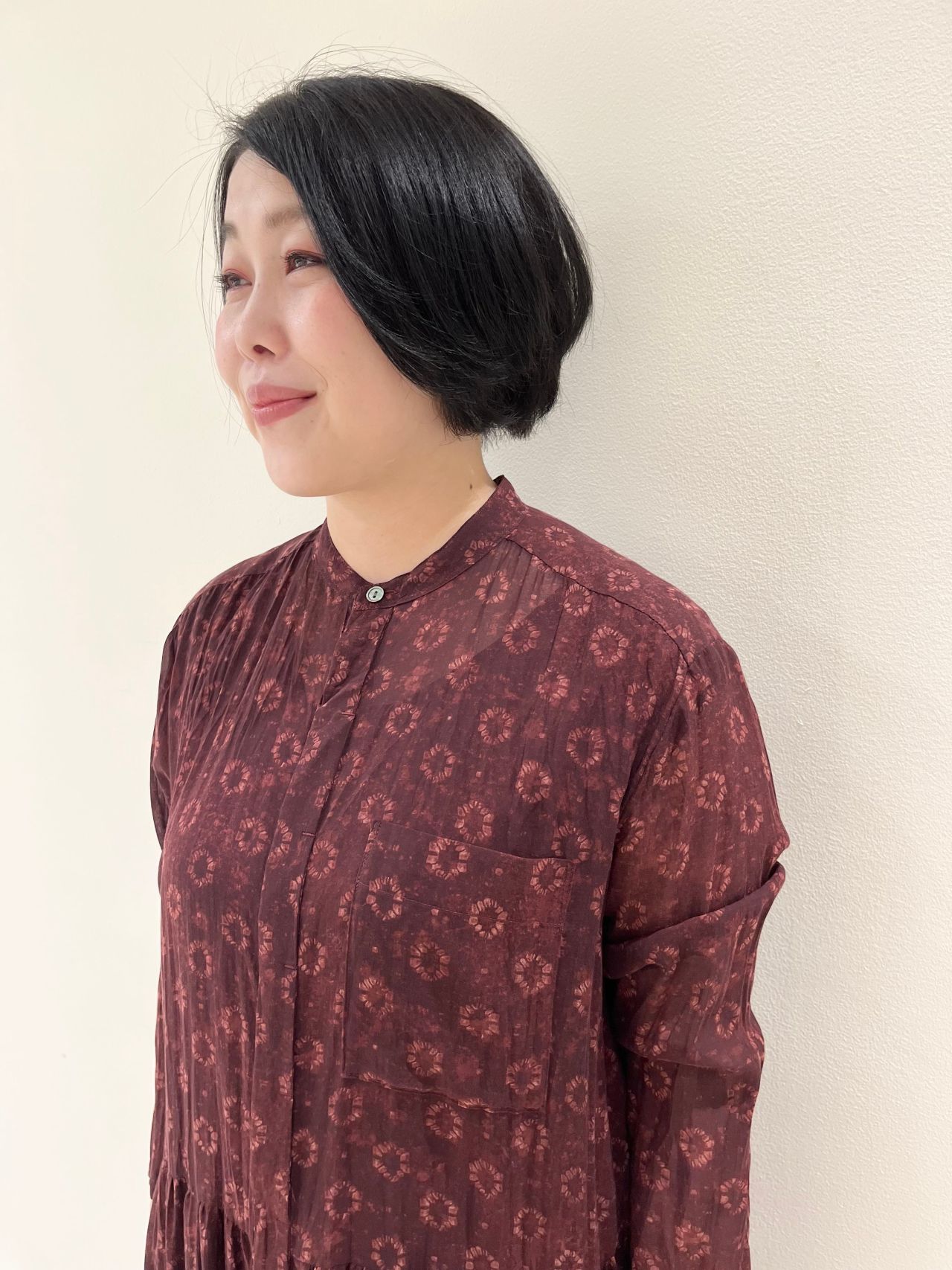 襟元にギャザーをあしらった台衿をつけて、すっきりとコンパクトなサイズ感にしました。