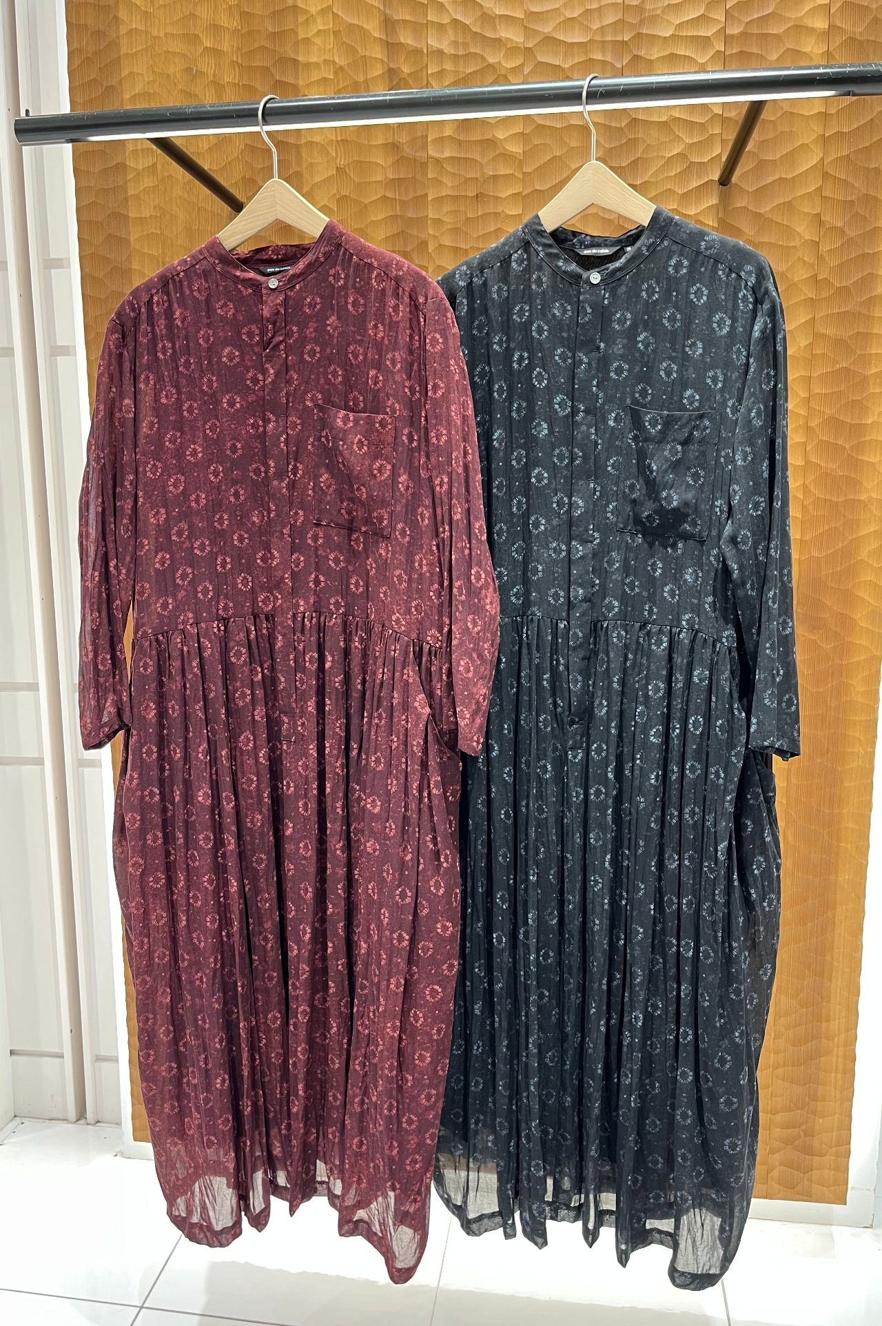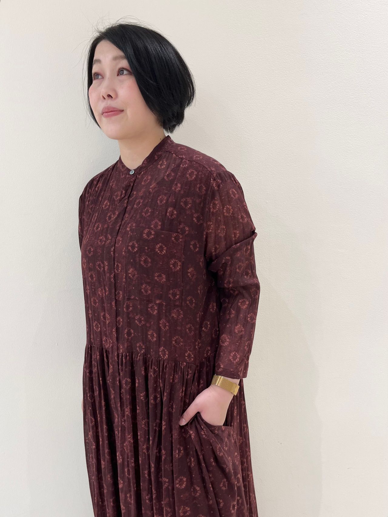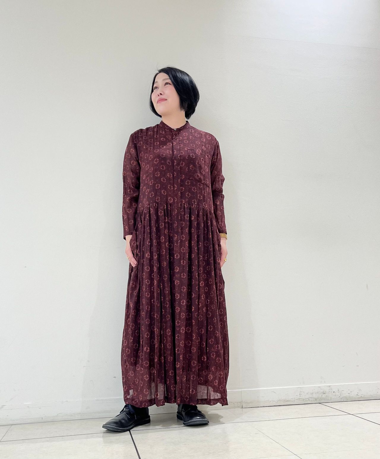 花にもリング(指輪)にも見えるプリントモチーフをのせた、台襟付きのロングドレス。