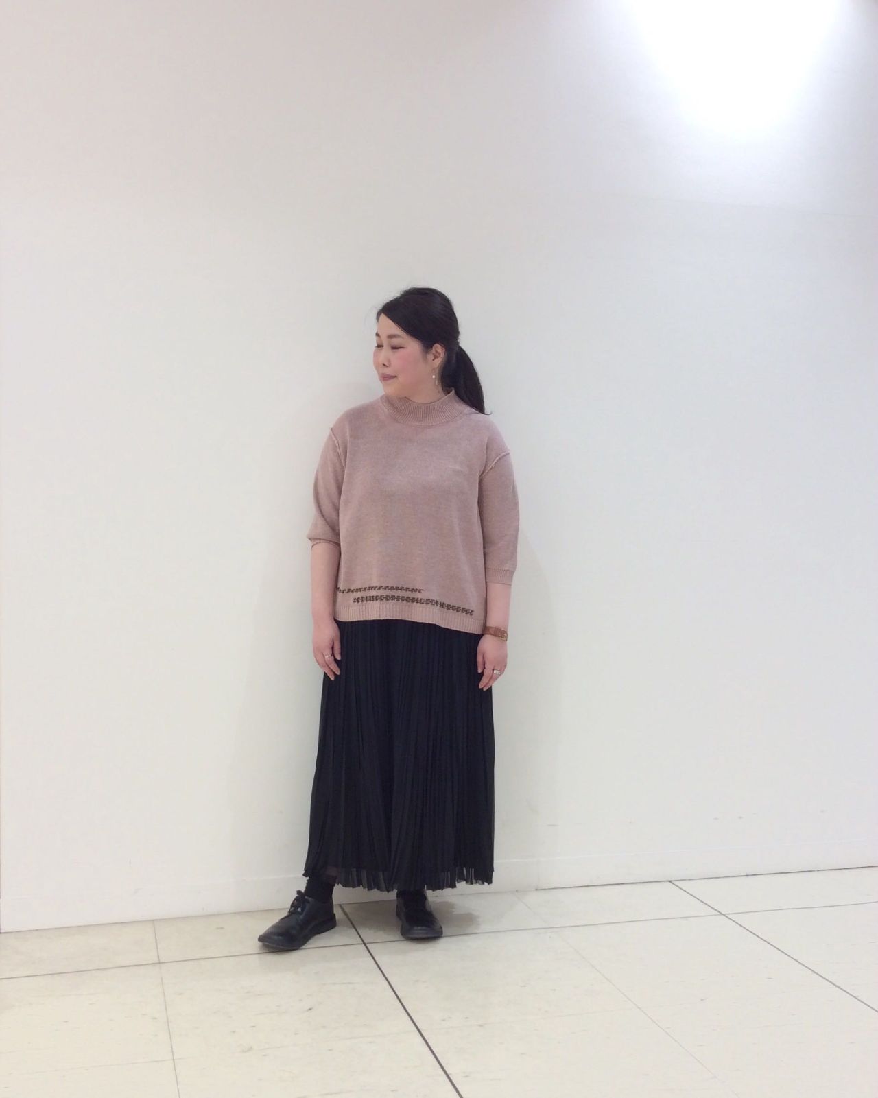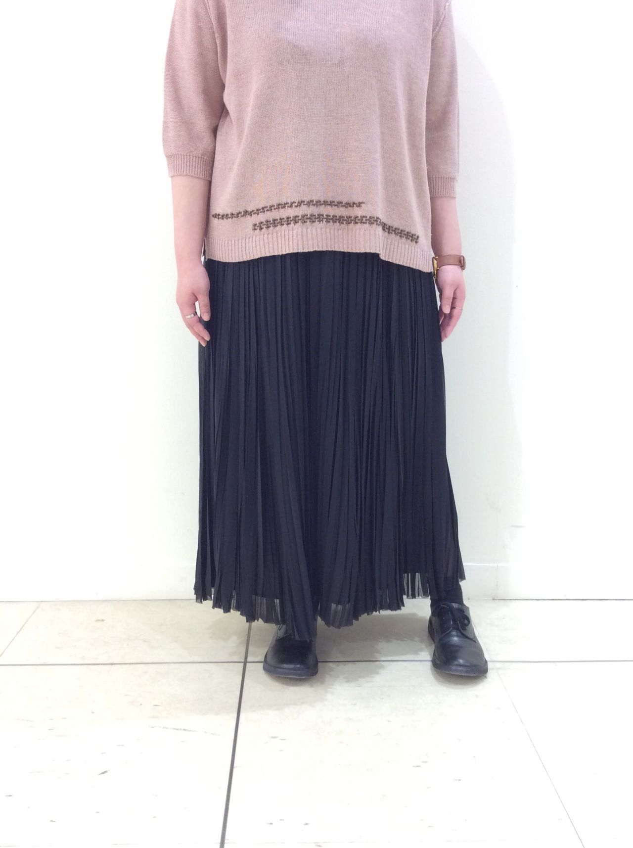 ジャケットやブラウスで綺麗めな着こなしだけではなく、膝丈位のワンピースの下からプリーツを覗かせてたり、カジュアルなスウェットに合わせても◎。