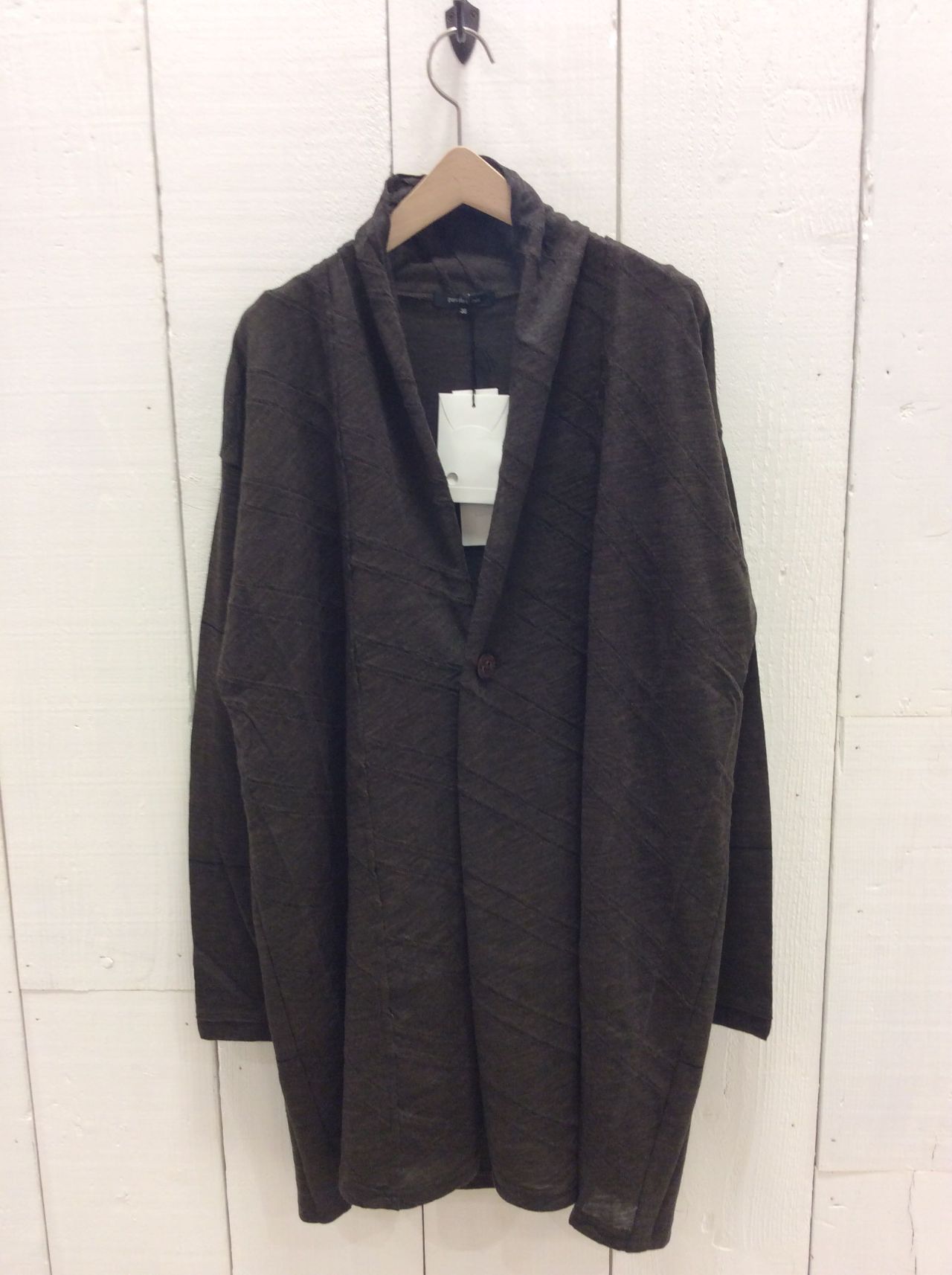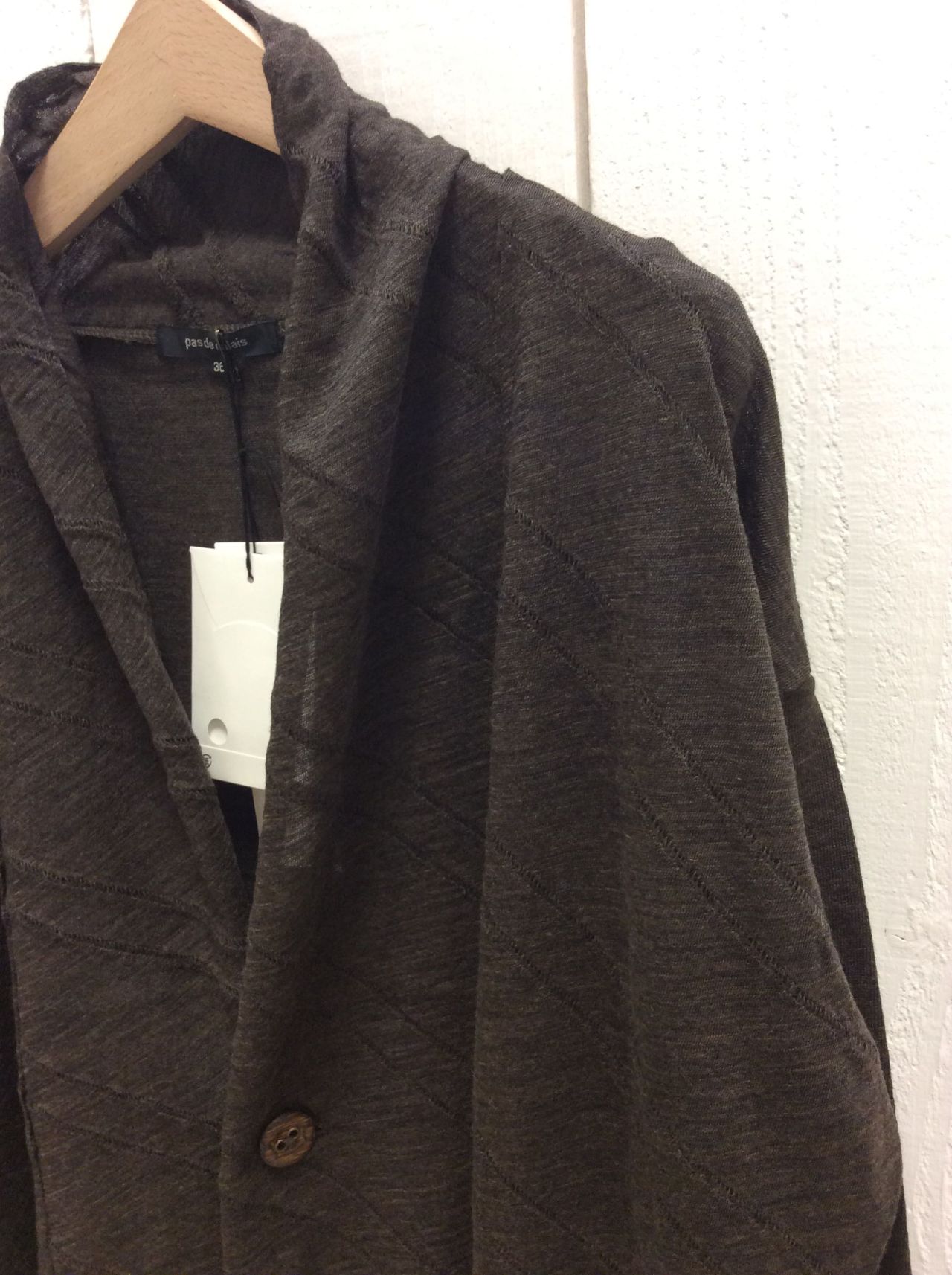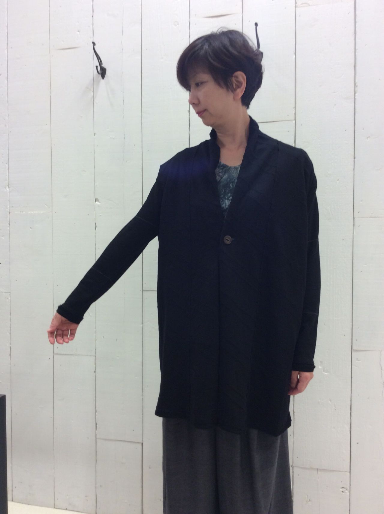 カーディガンは、2つの素材を組み合わせた着流し風カーディガン。