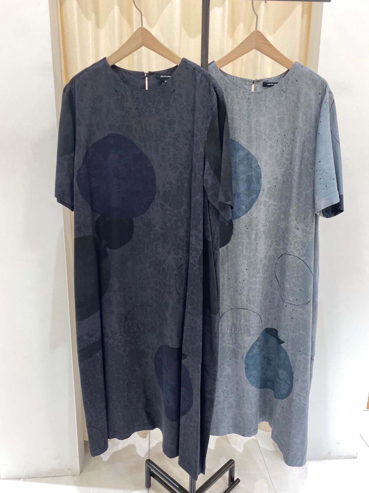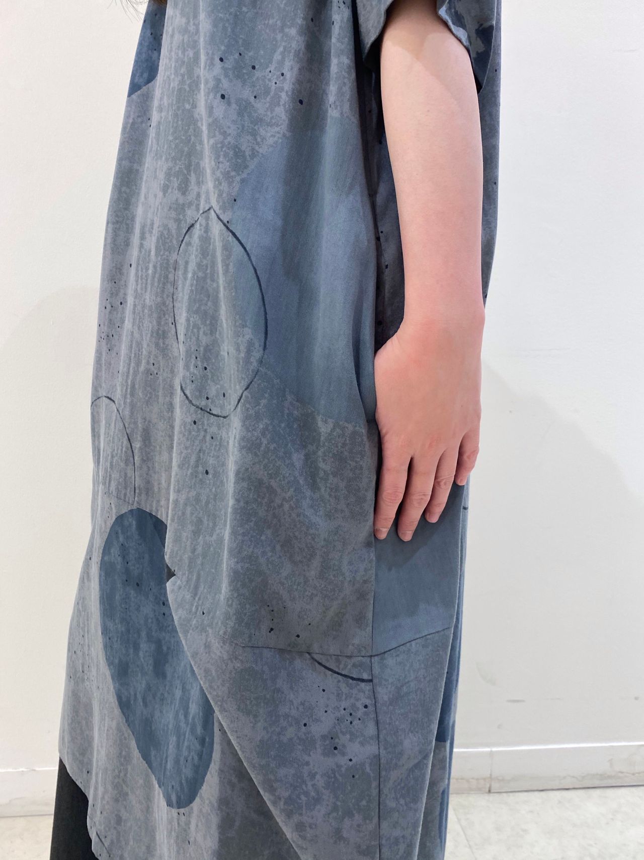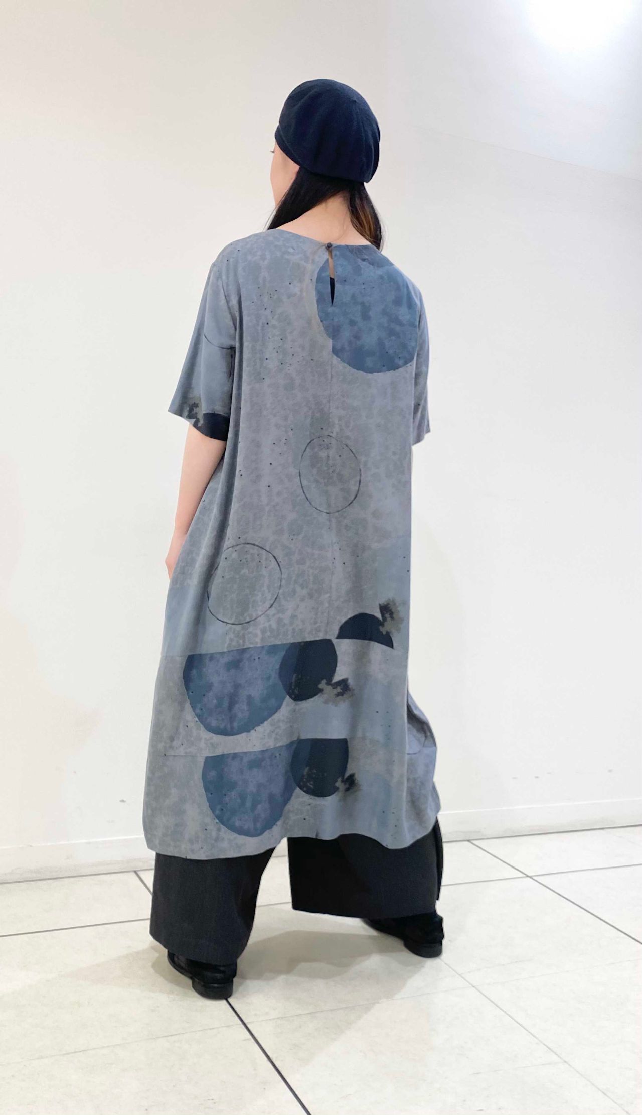 宇宙をイメージした大胆なドット柄を、繊細なムラ感や滲み感をスクリーンプリントで表現しています。