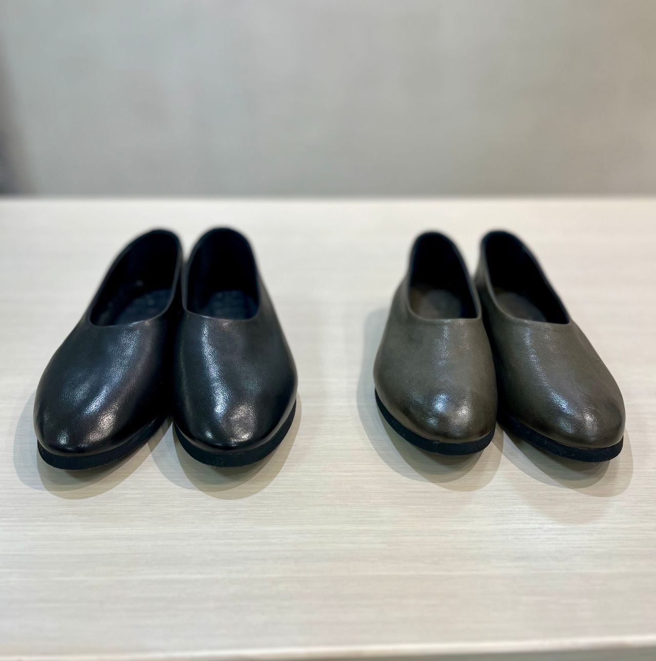 1980年代にレディースドレスシューズで見られる、後ろバランスのシンプルなパンプスシューズを、ラウンドの木型を使用してドレスダウンさせました。