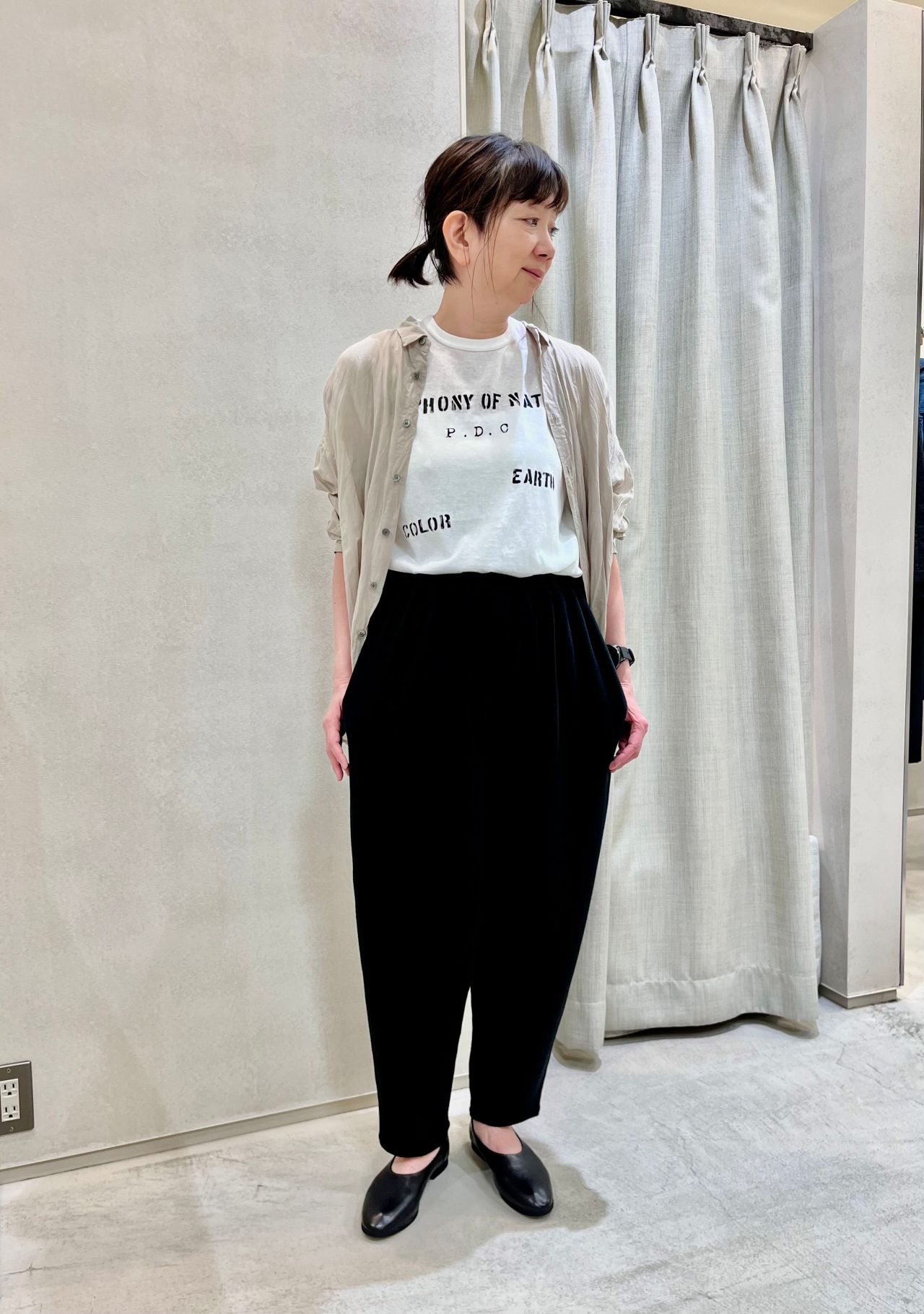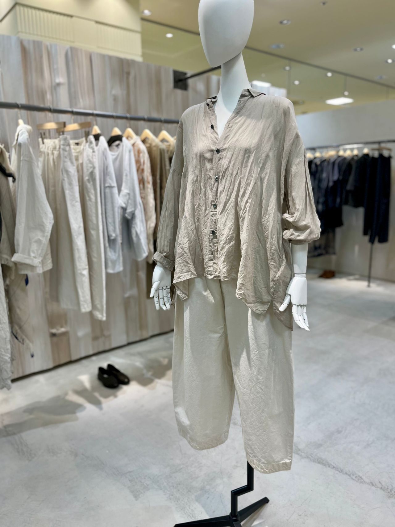 後ろヨークの下にはギャザーが施され涼しくコンフォートなシルエットになっています。
