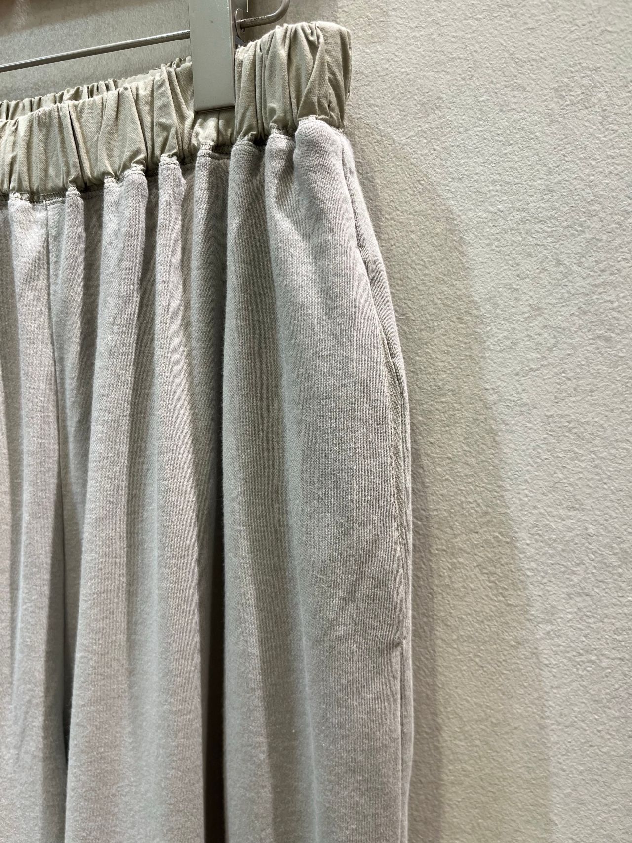 ウエスト部分の別地素材はキュプラ/コットンツイルワッシャー使用し、ポケット部分の素材はC/Ry天竺になります。