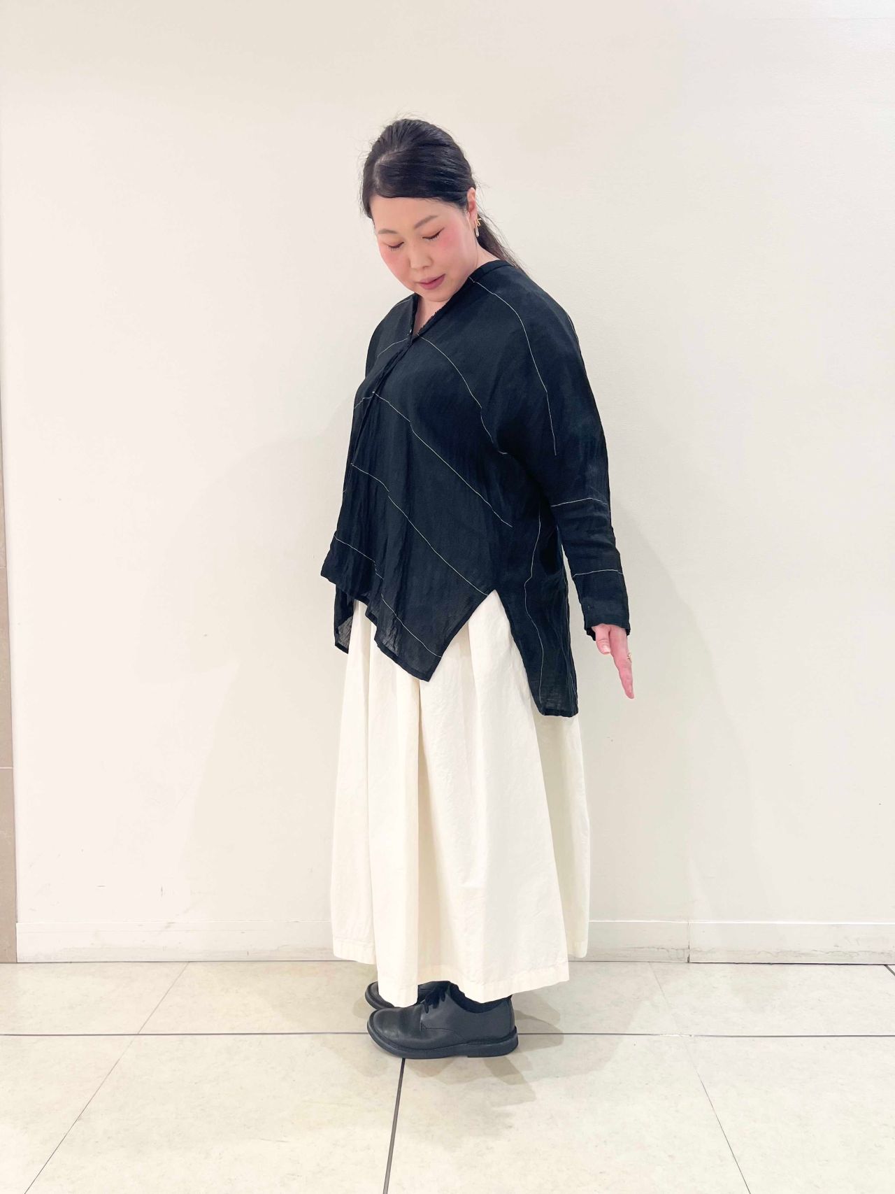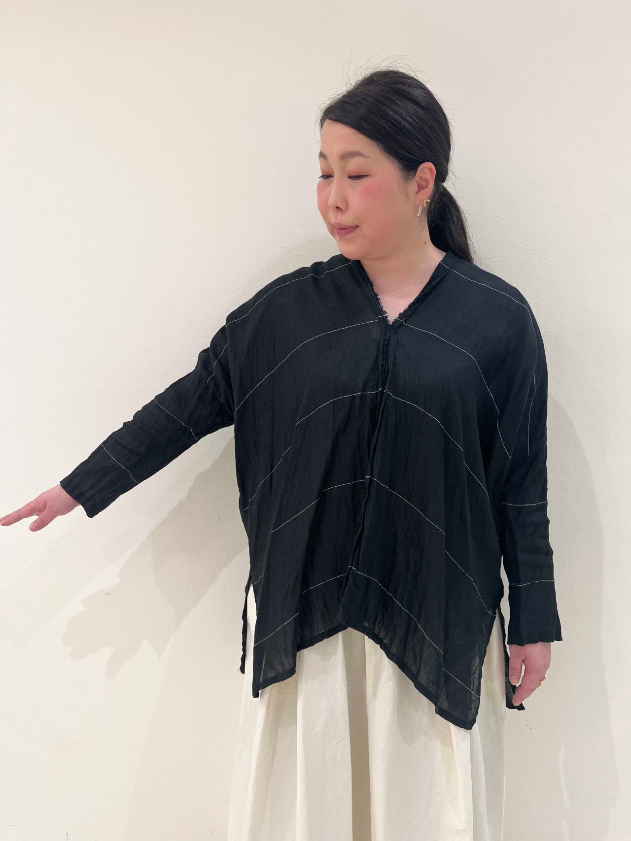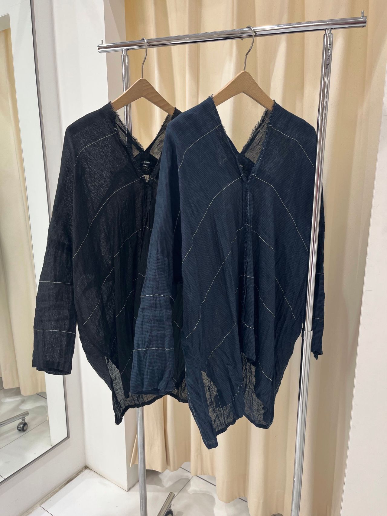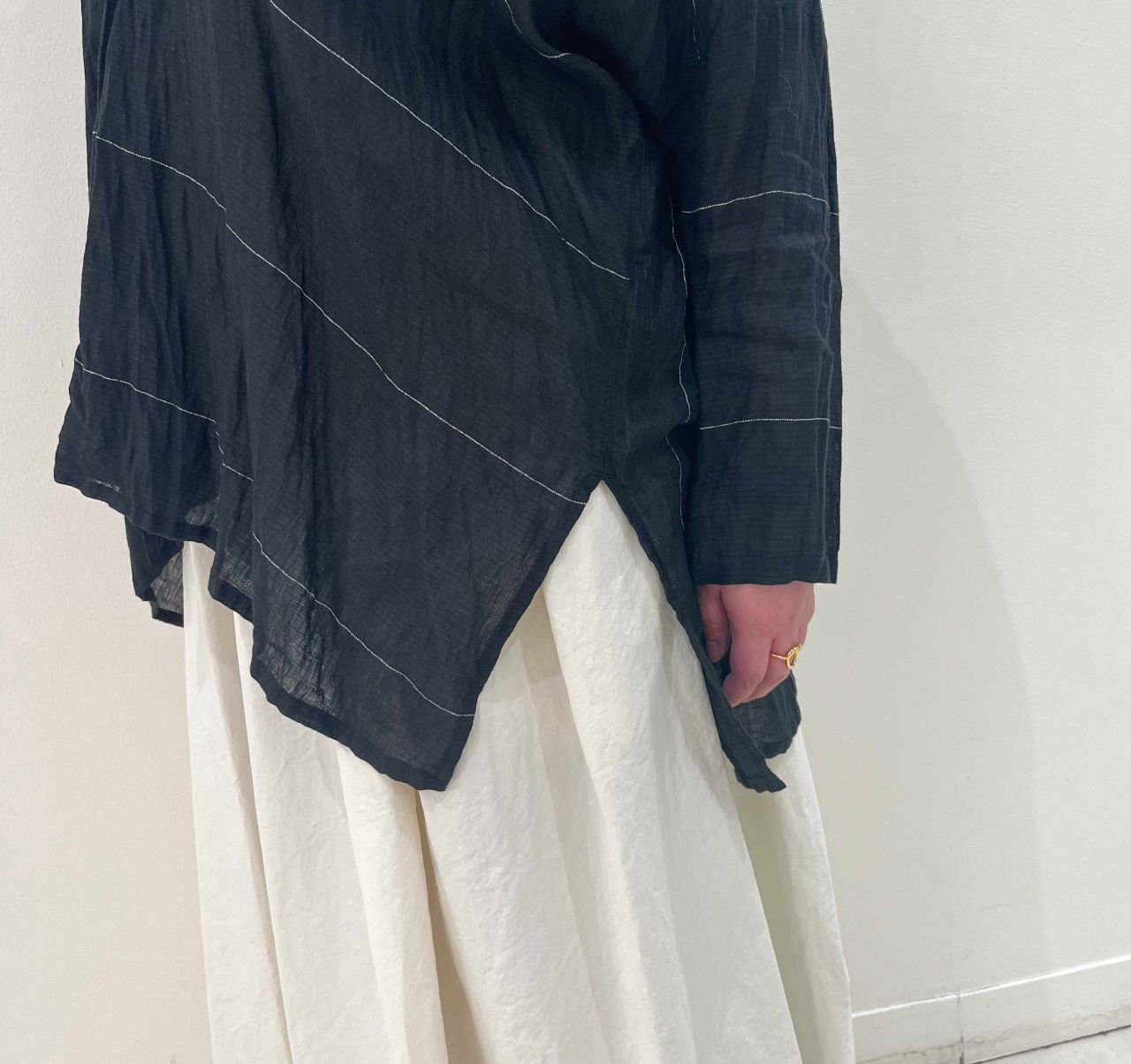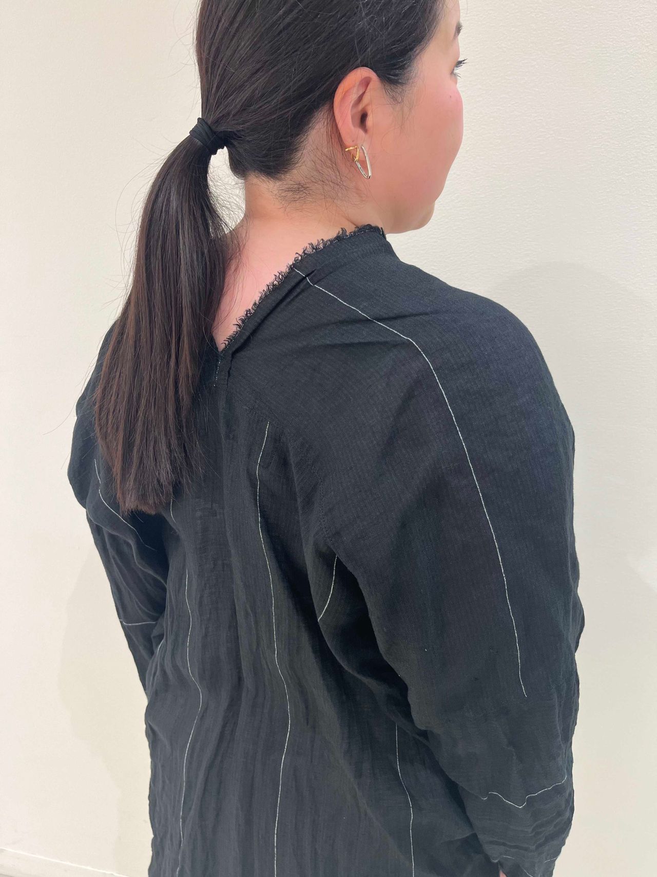衿から前中心端に生地の耳使いをしたデザインはパドカレ らしい抜け感のあるアイテムです。