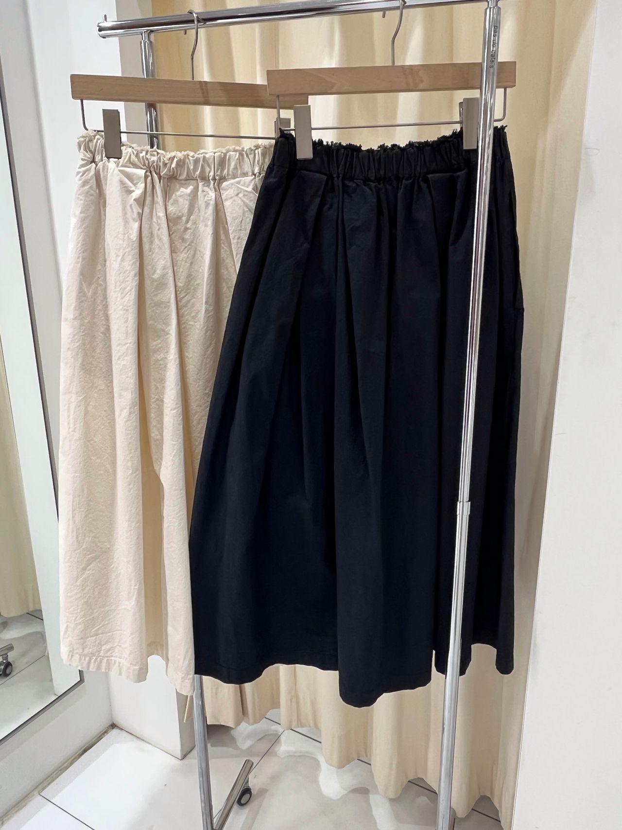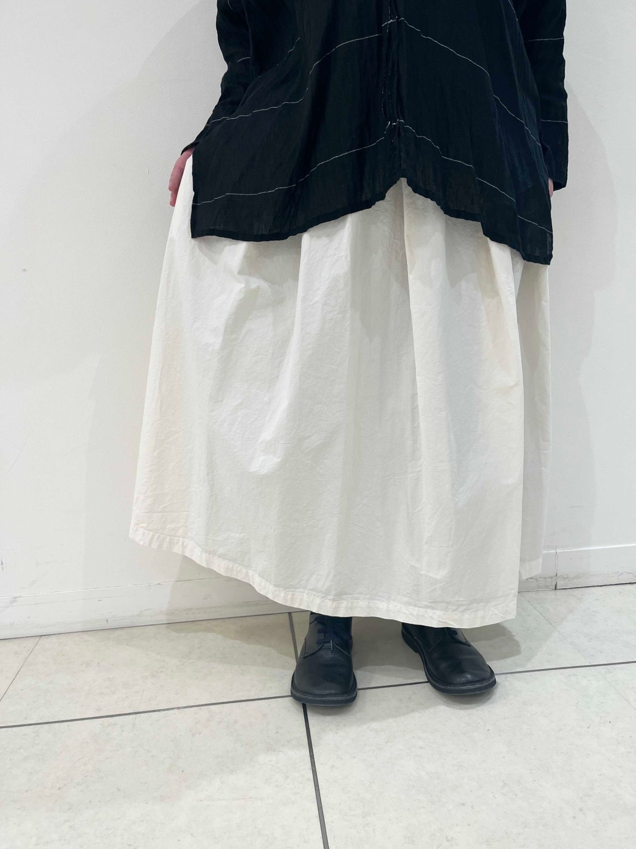 ヴィンテージ感ある素材や加工を施した分量感あるスカートは、シンプルなトップスと相性が良いアイテムです。アクセントとして、ウエスト部分の上端に綿麻チェック素材をカットオフ仕様で挟み込んでいます。ウエスト部分、ゴム&テープ紐使いでウエスト調整しやすいです。
