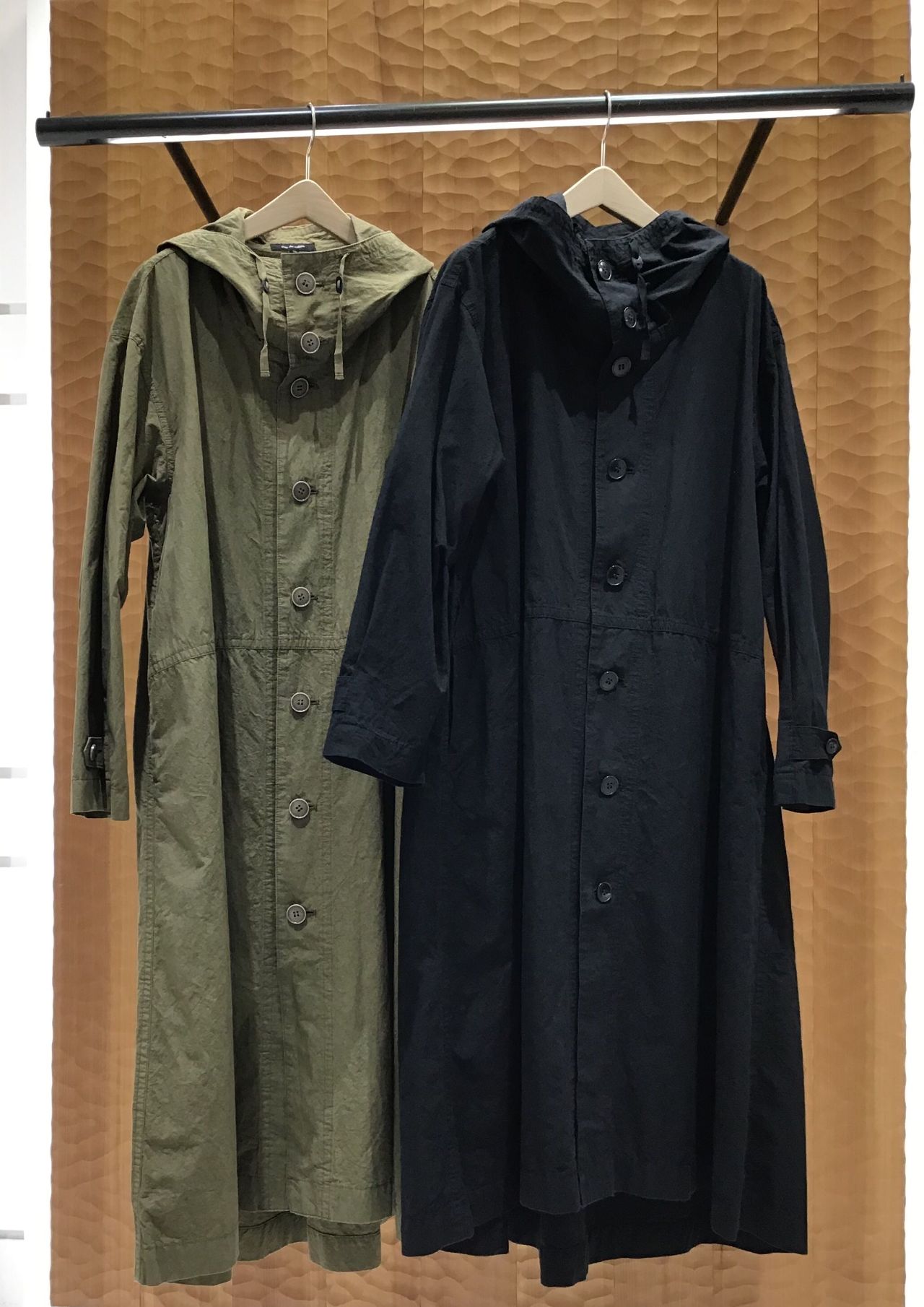 フード付きのオーバーコート。