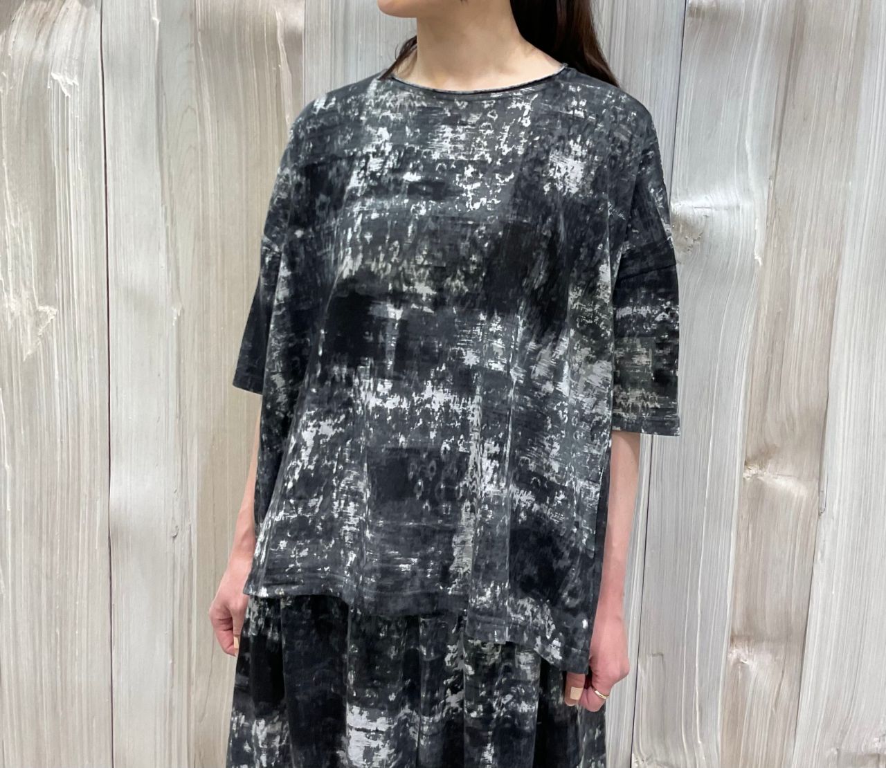 アートタッチなプリントが印象的な、ゆったりワイドシルエットのトップスです。