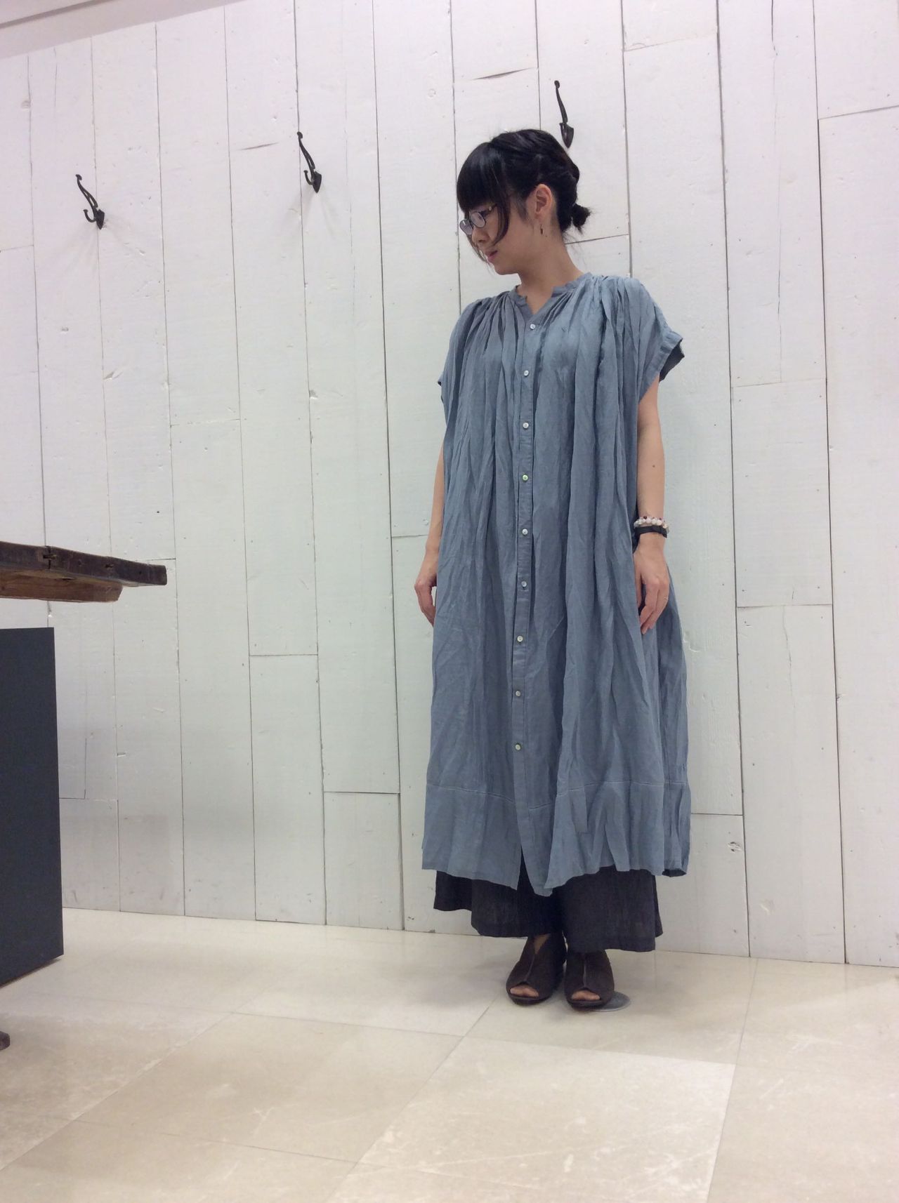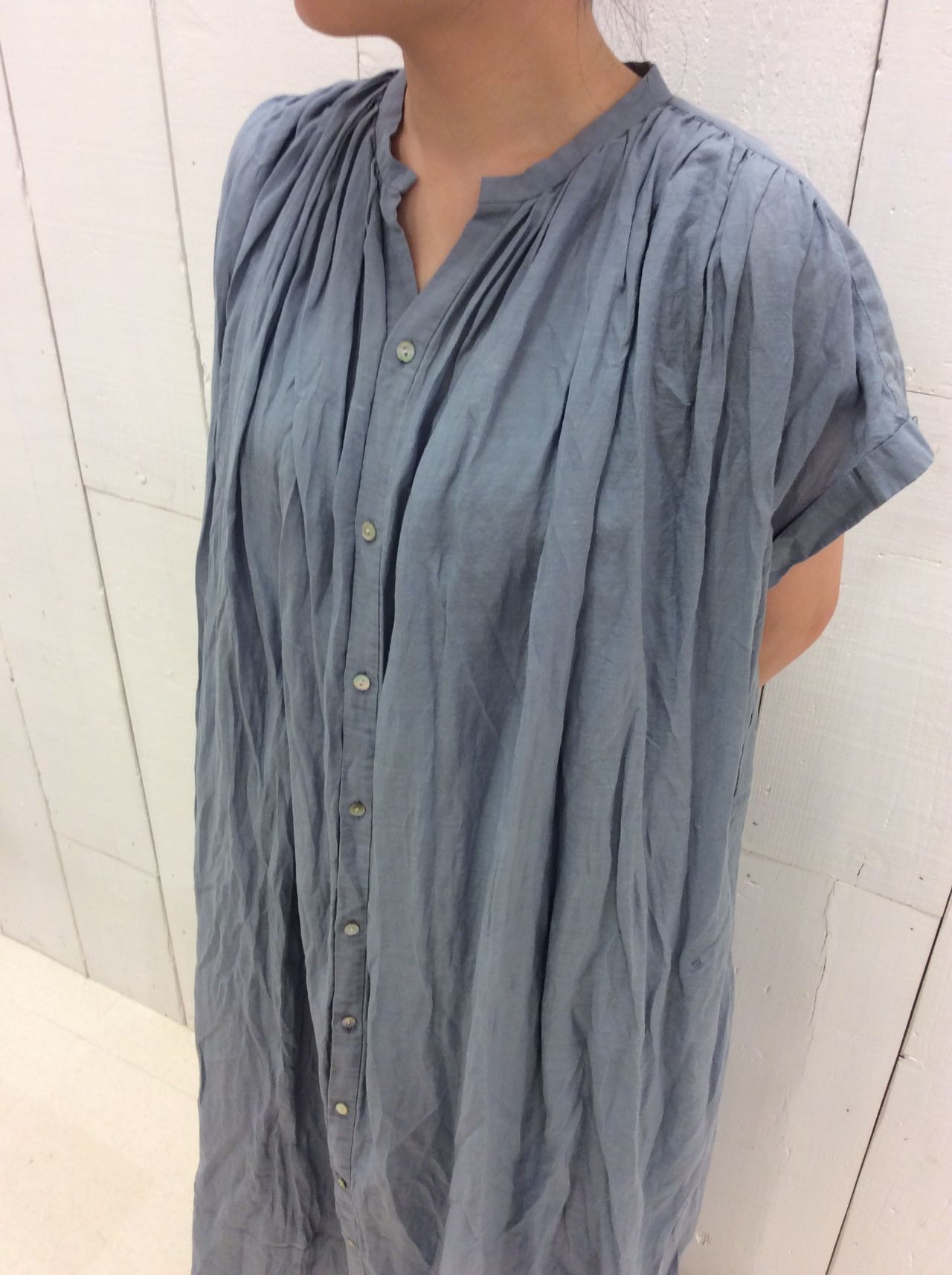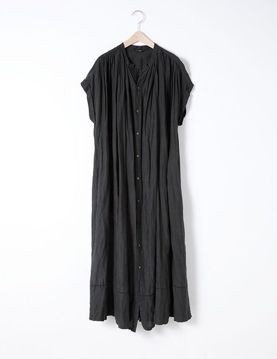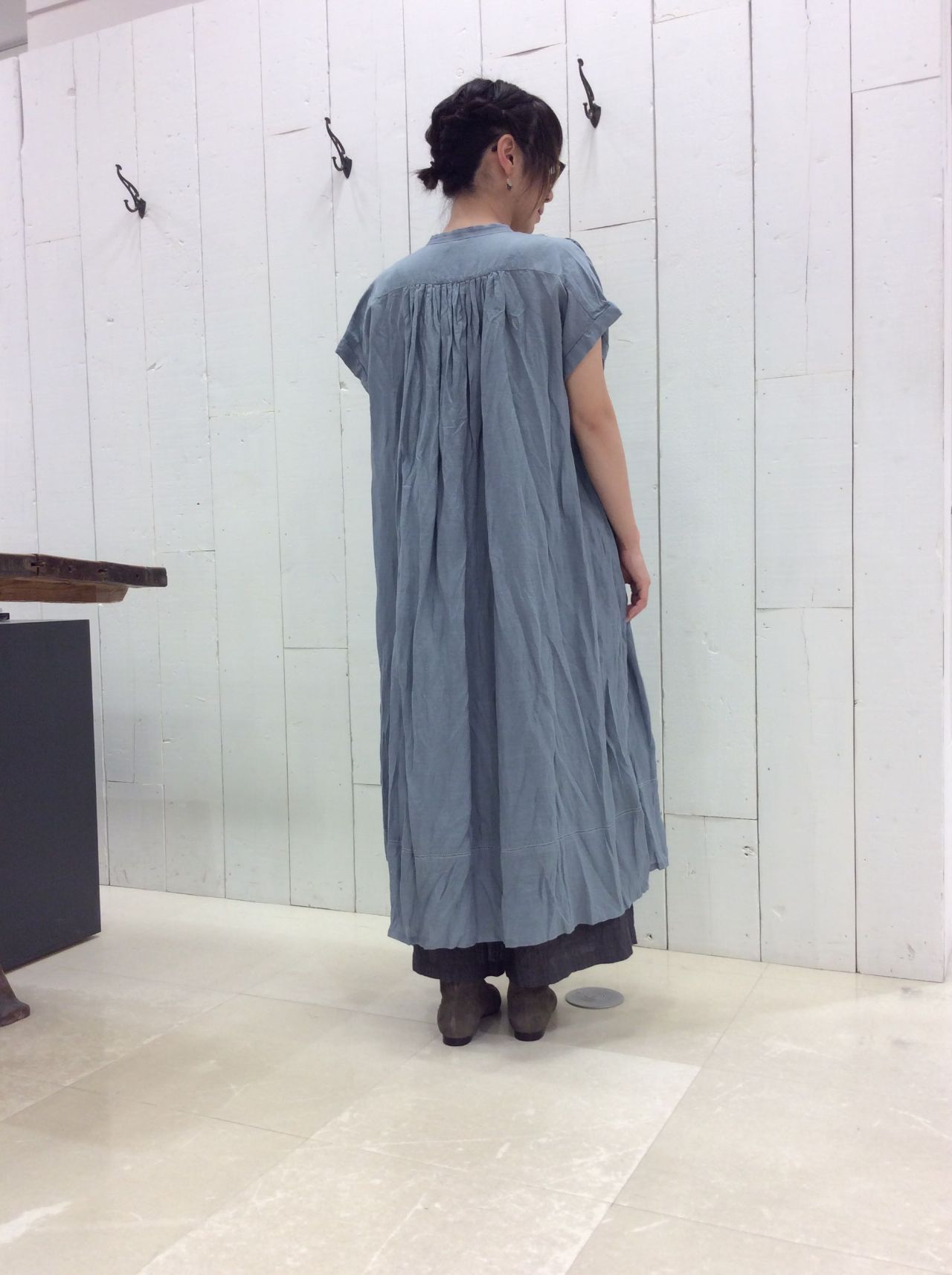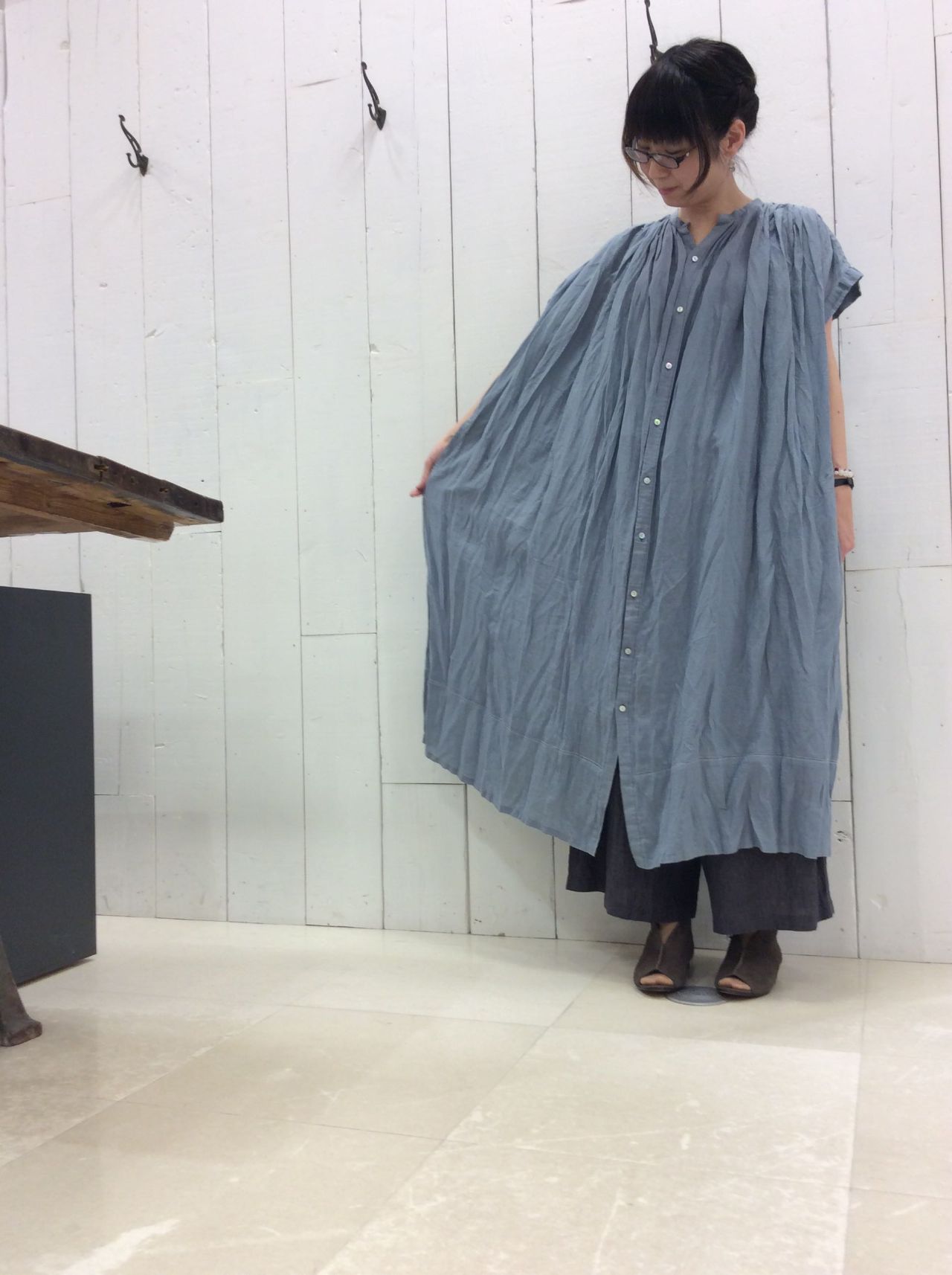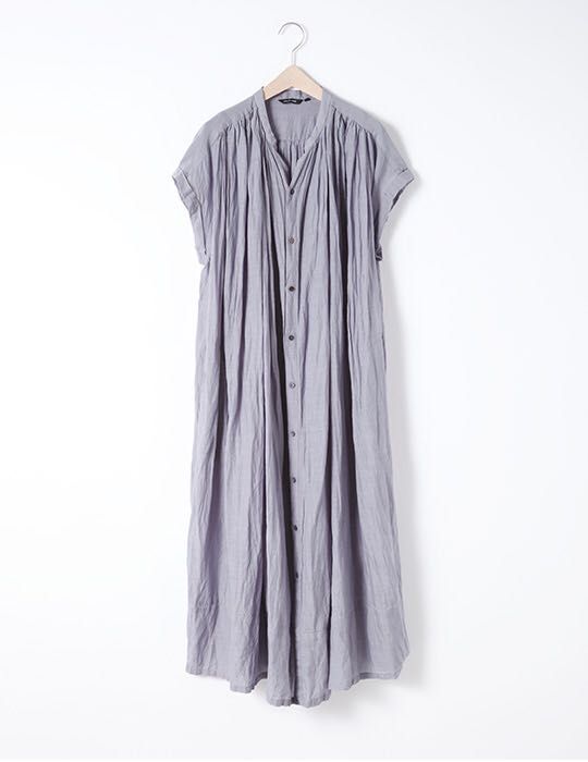 前にも後にもたっぷり入ったギャザーの分量感がポイントの、ロングワンピース。