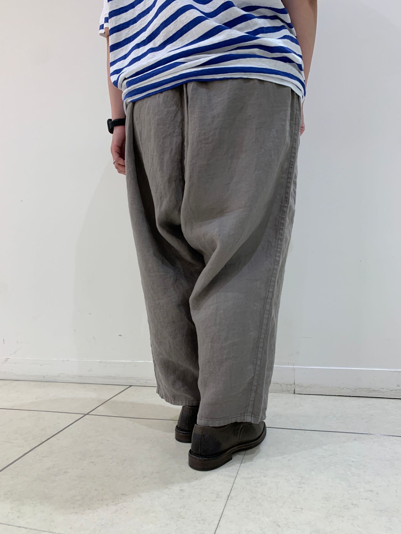 足回りがスッキリとしたサルエルパンツ。