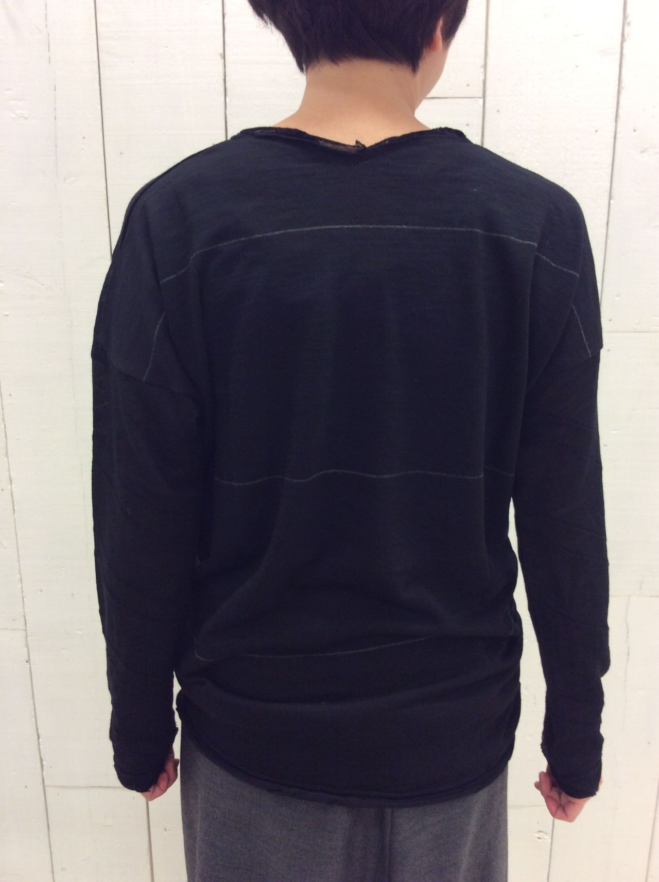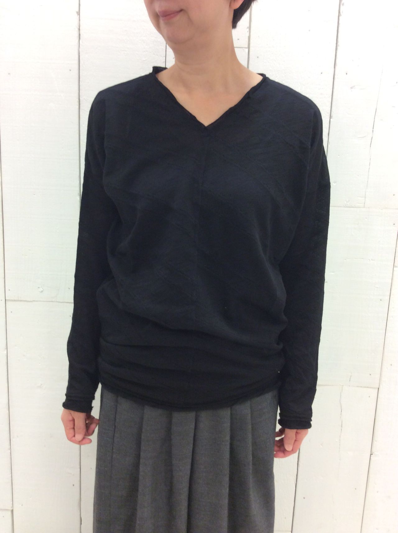Vネックの場合、前身頃が斜めタックで編みこんでいるシックな生地で、後ろ身頃がボーダー。