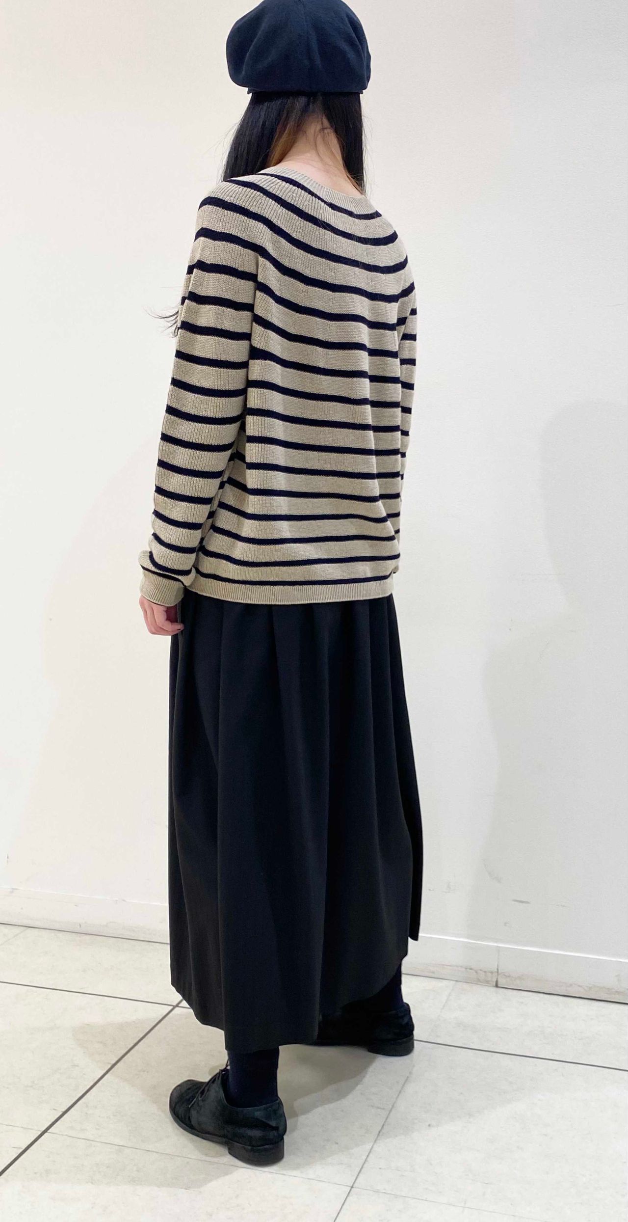 スッキリとしたシルエットで着ていただけます。ボーダー柄がコーディネートのポイントになります。