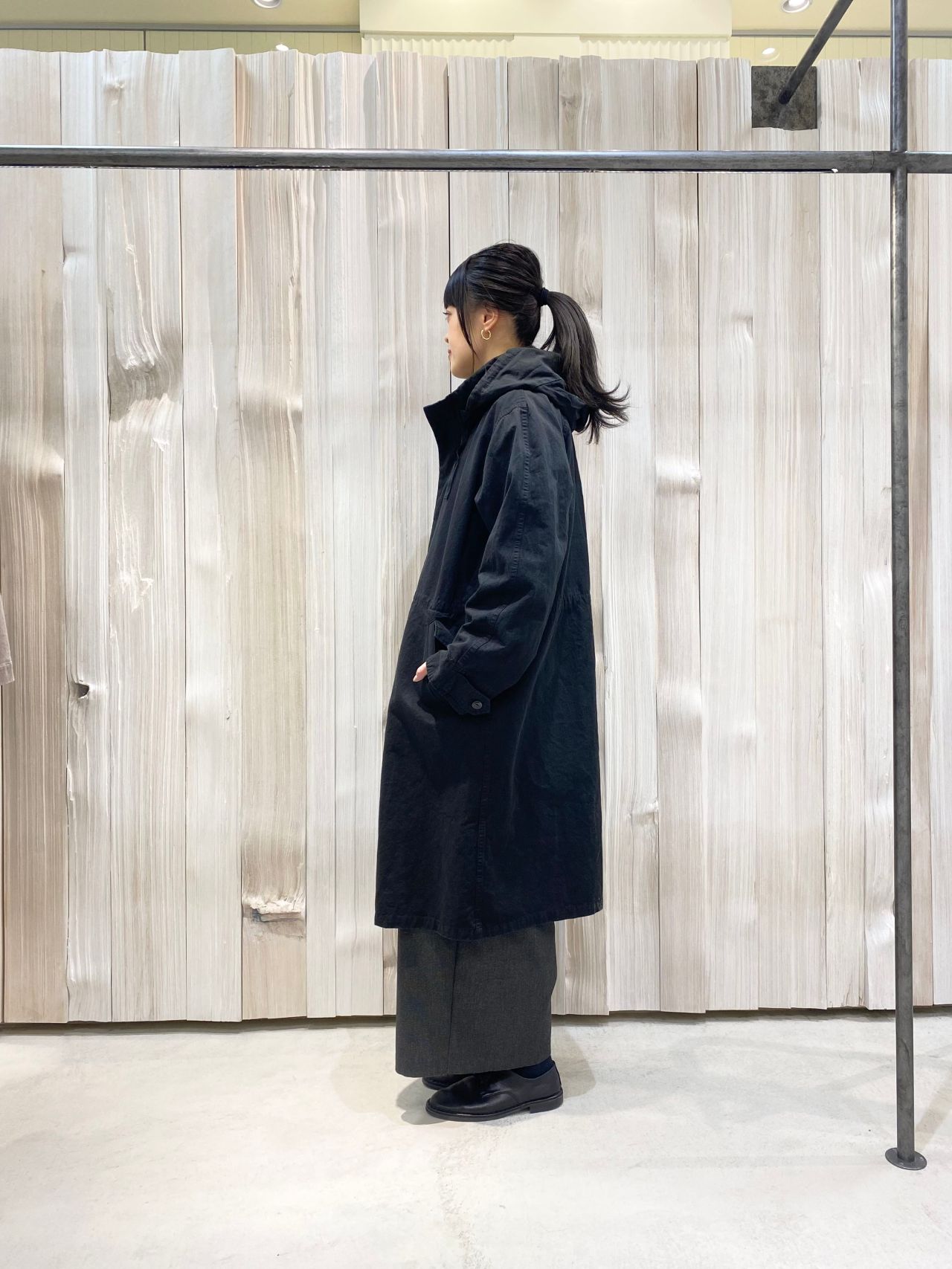 衿の中に収納されている大きめのフードが印象的。ウエストにドローストリングの紐が通っているので、シルエットを変えて楽しんで頂けます。ライナーとコートを釦で留め付け、取り外し可能なライナー付き。