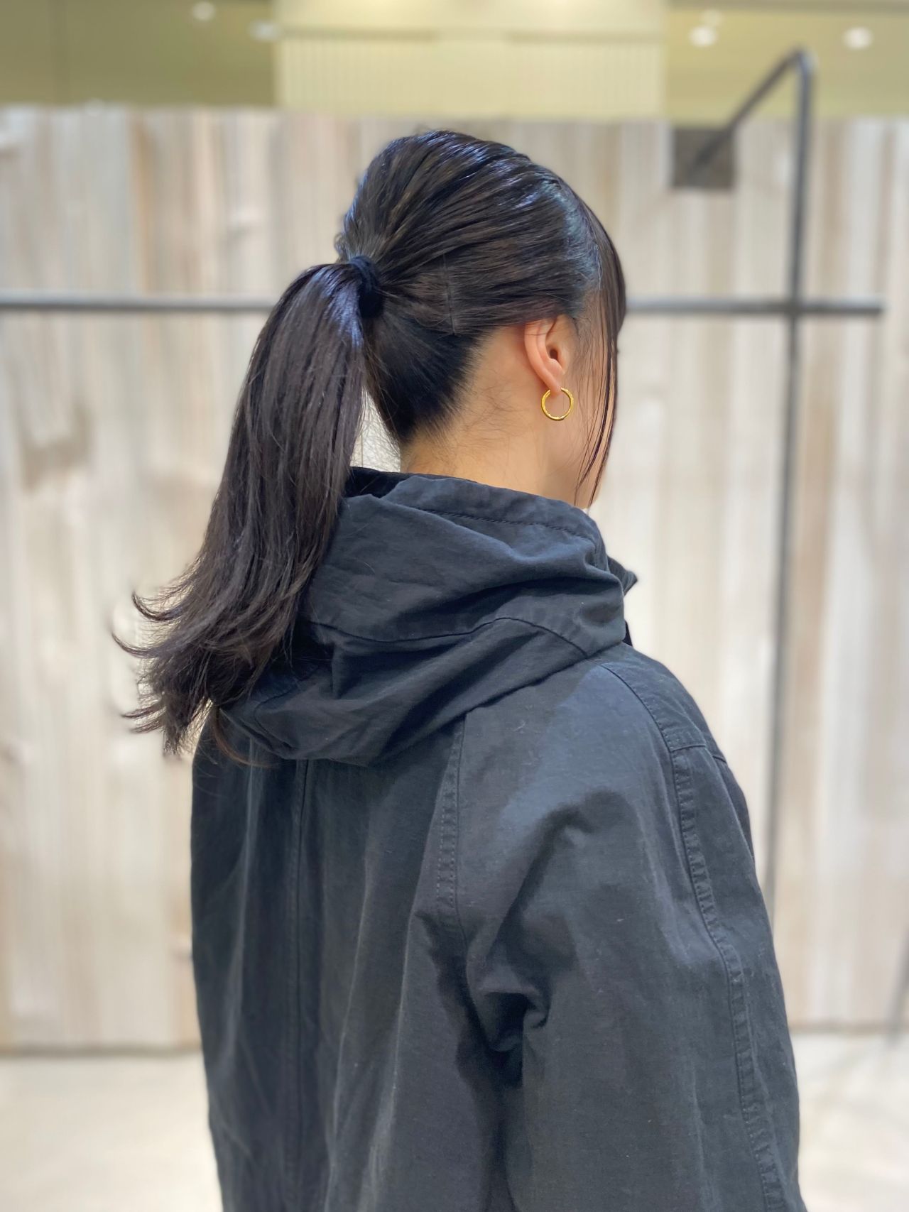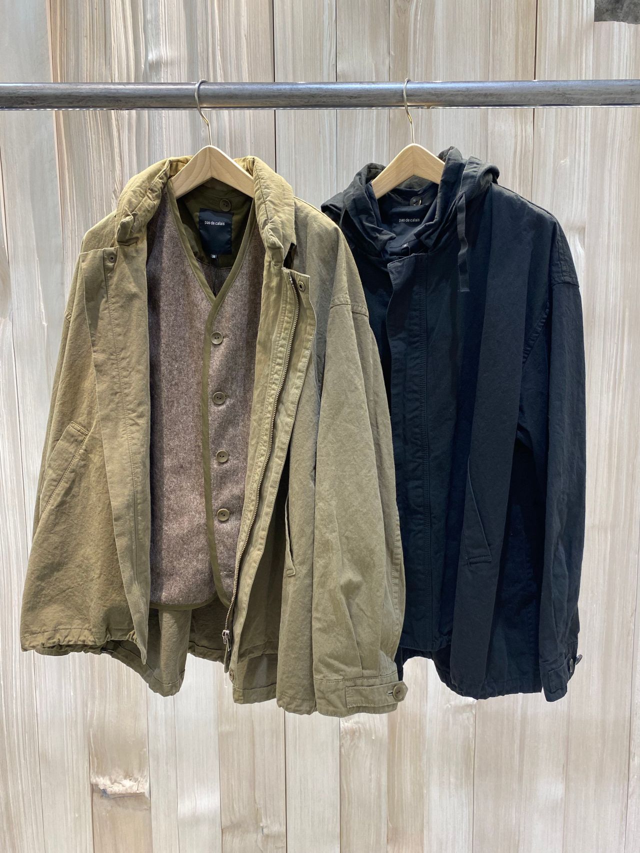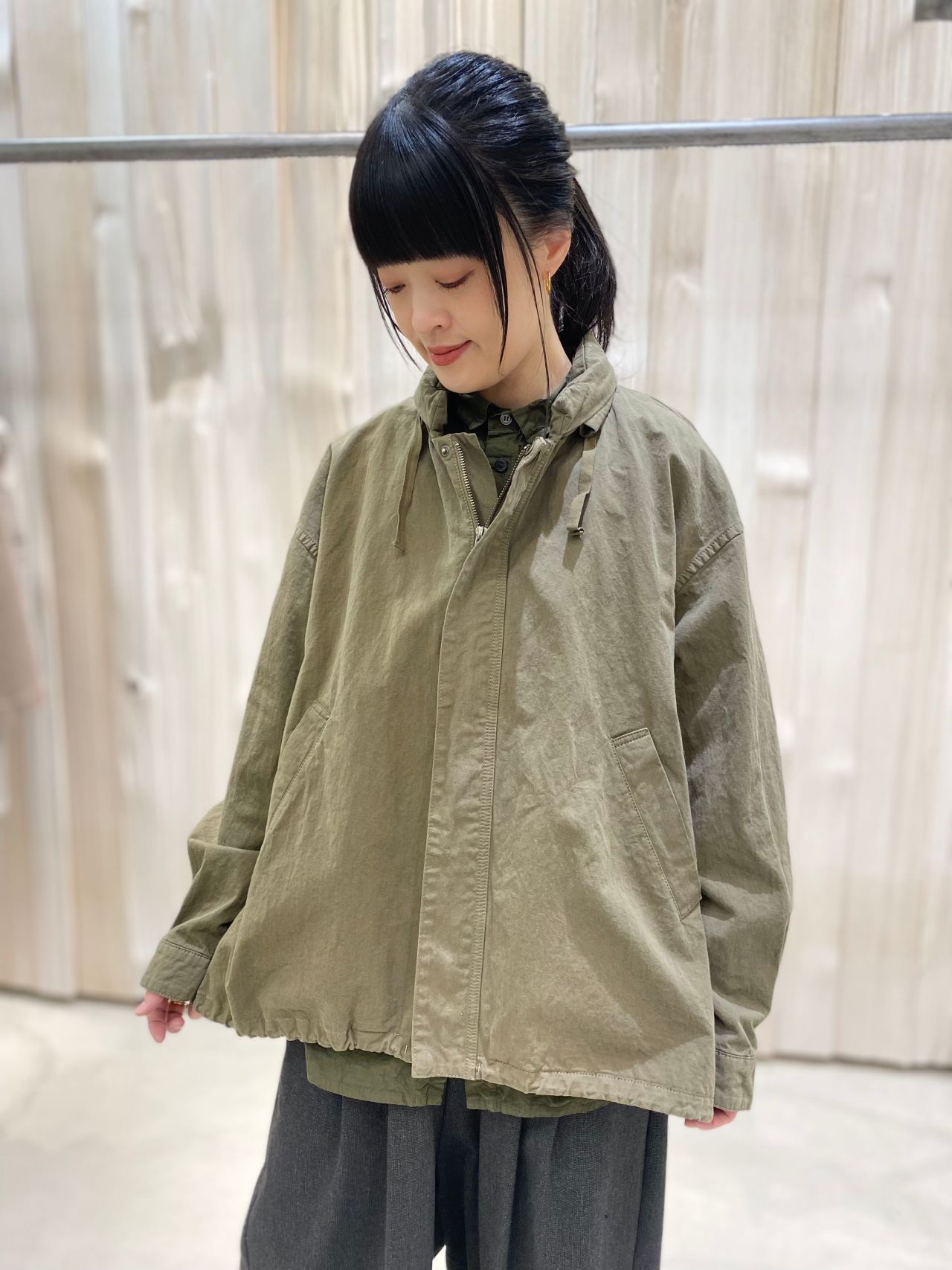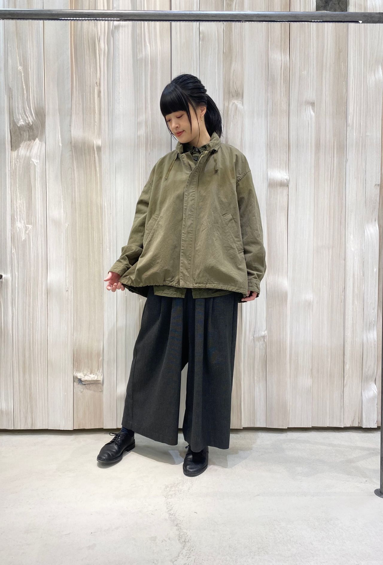 衿の中に収納されているフードが印象的。裾にドローストリングの紐が通っているので、シルエットを変えて楽しんで頂けます。