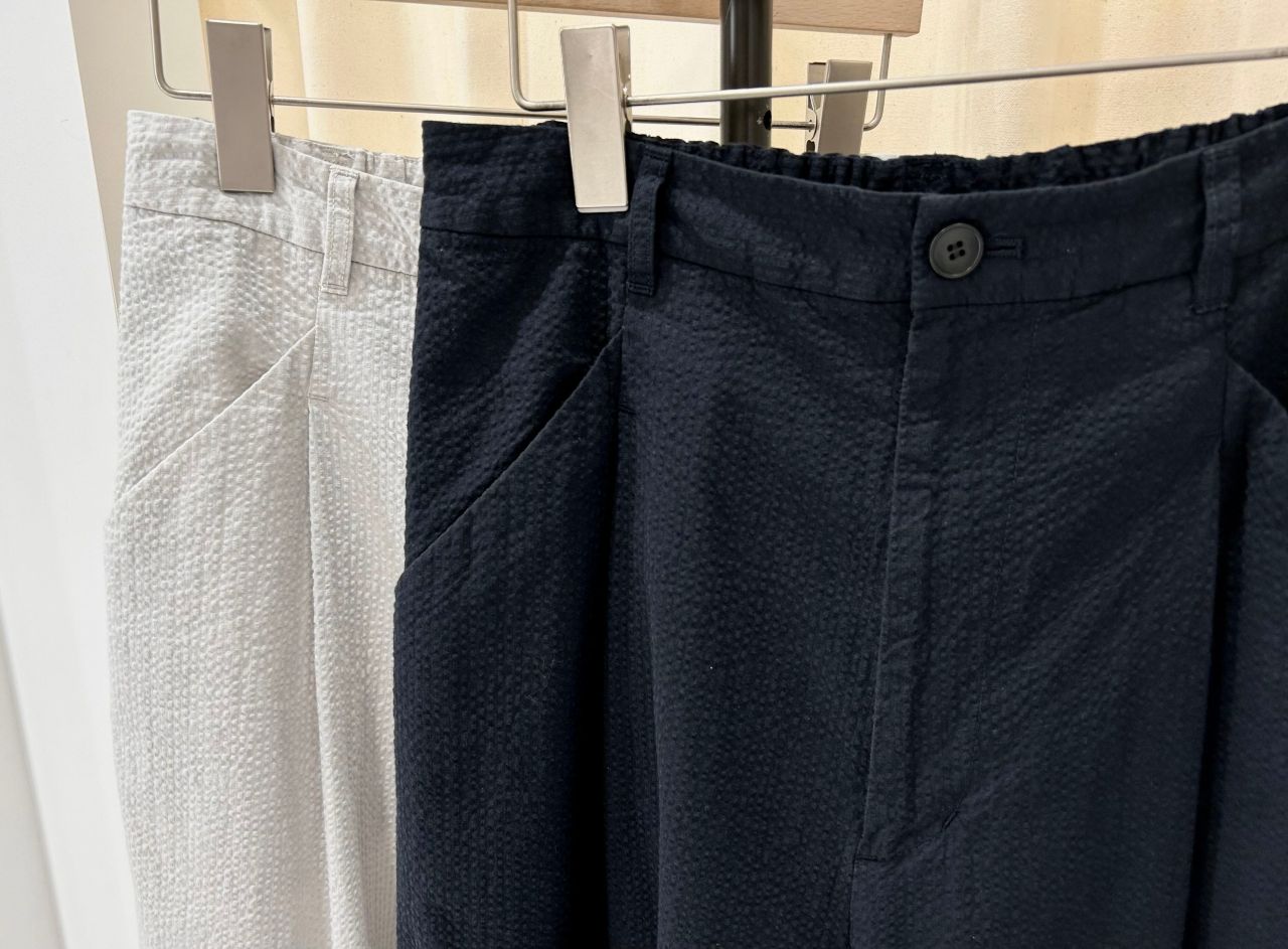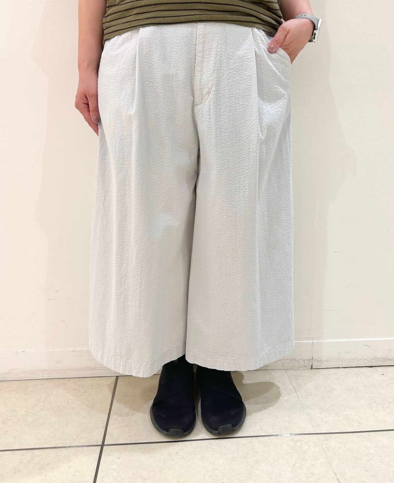表面の凹凸が特徴のサッカー素材のワイドパンツ。