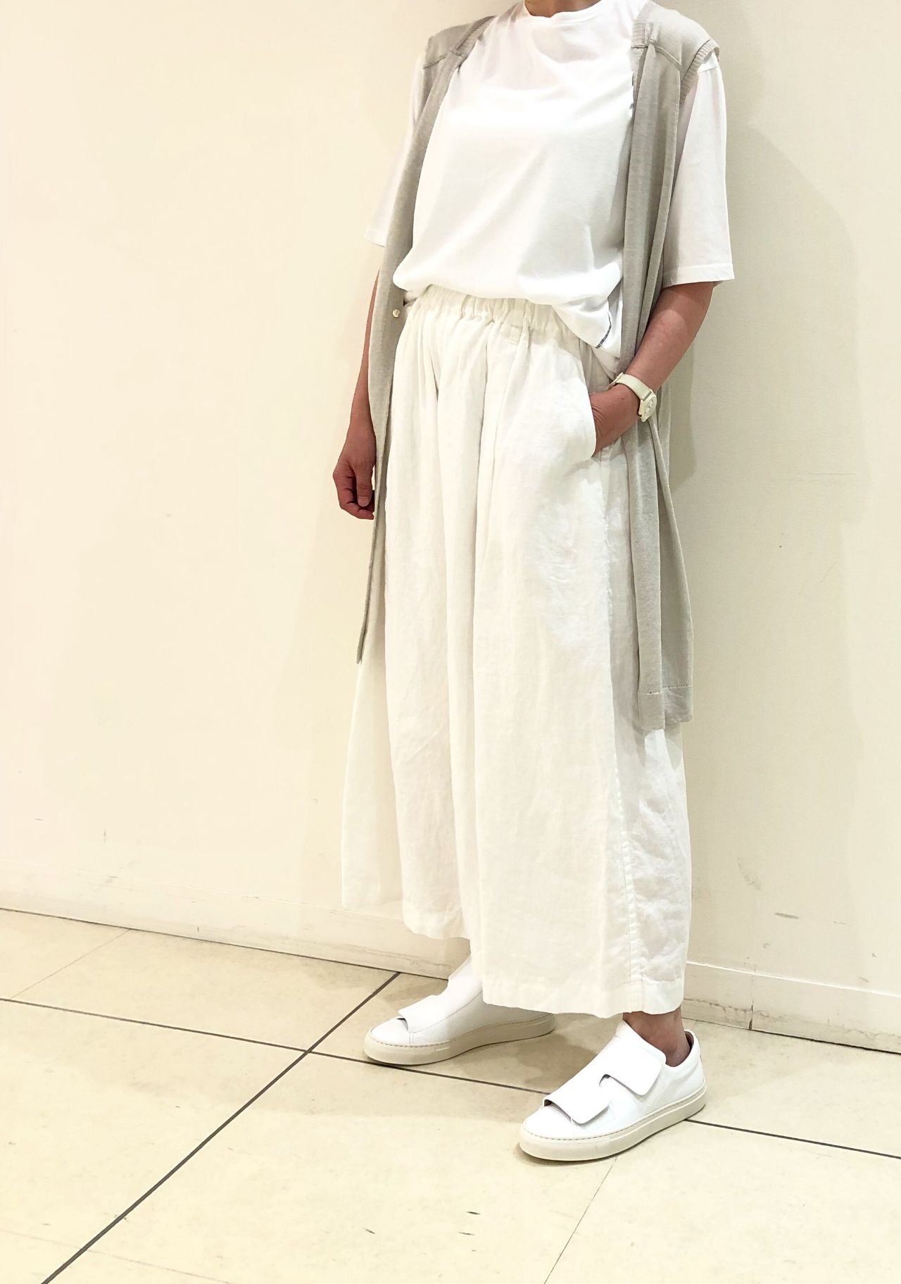 リネン素材、ウエストゴム、まだまだ暑い夏の終わりを楽しめるパンツです。