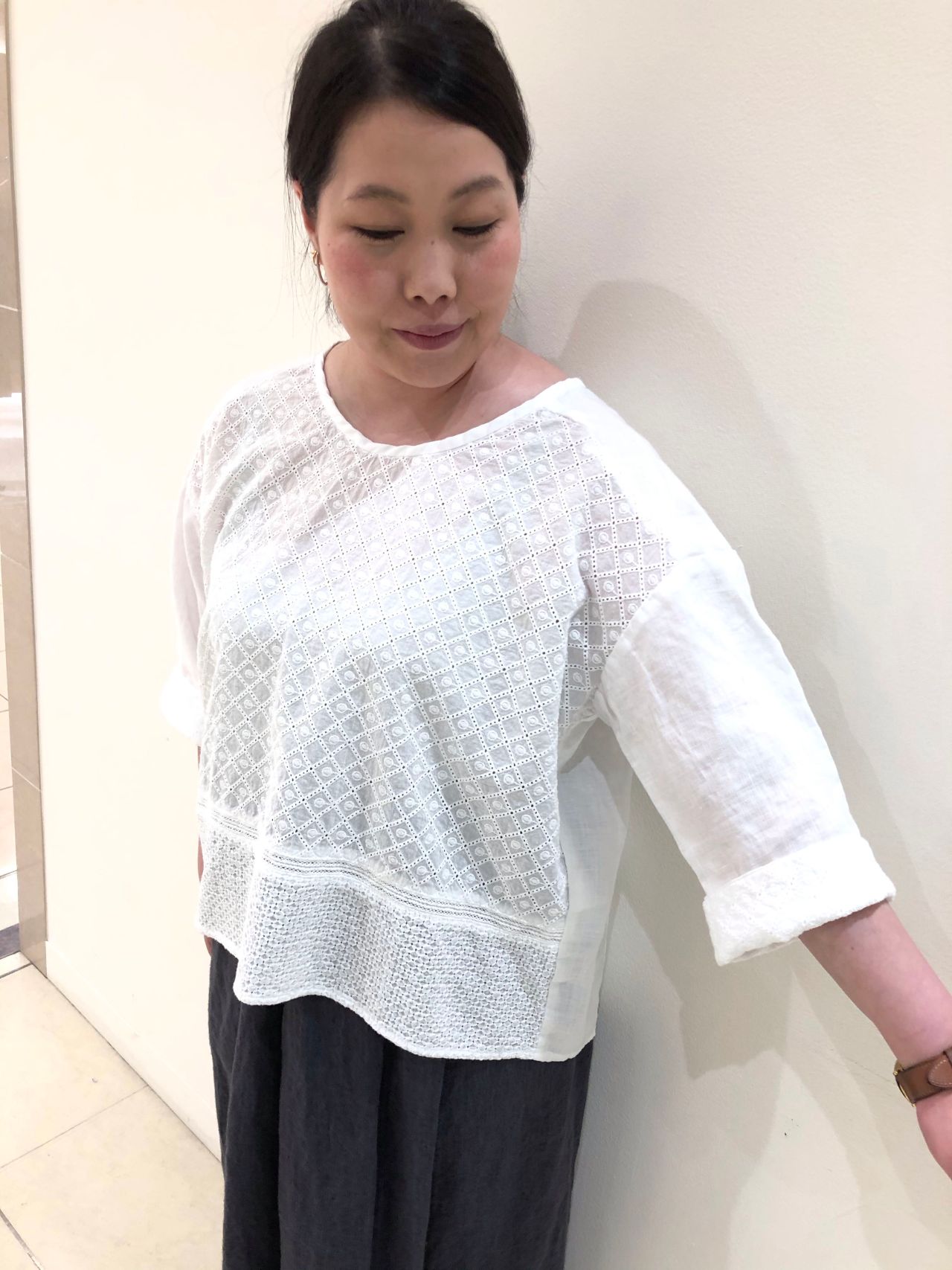 毎シーズンご好評いただいている、レース切替ブラウスの新作。