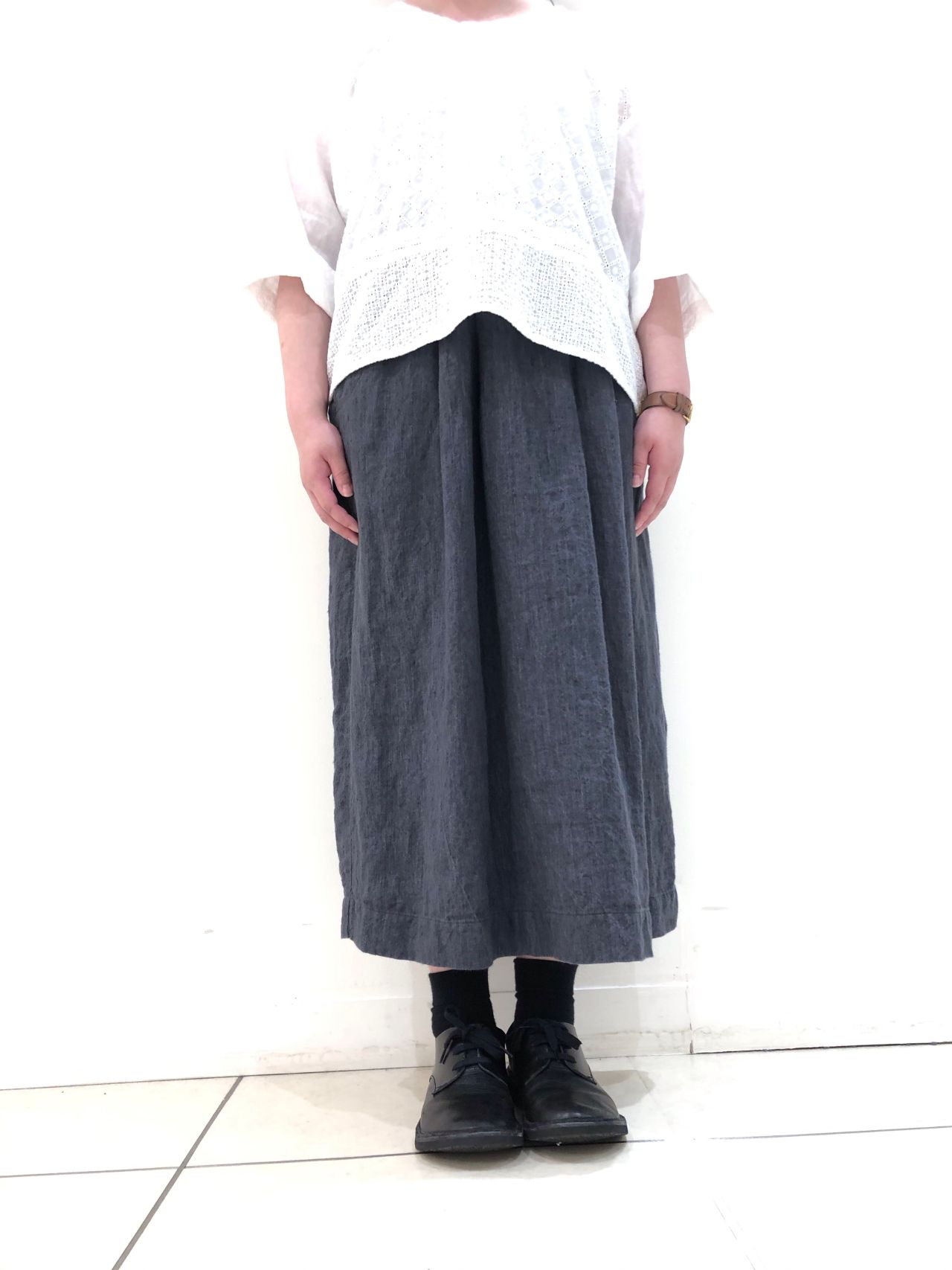 リネンツイル素材の少し裾広がりなソフトボックスシルエットのロングスカート。