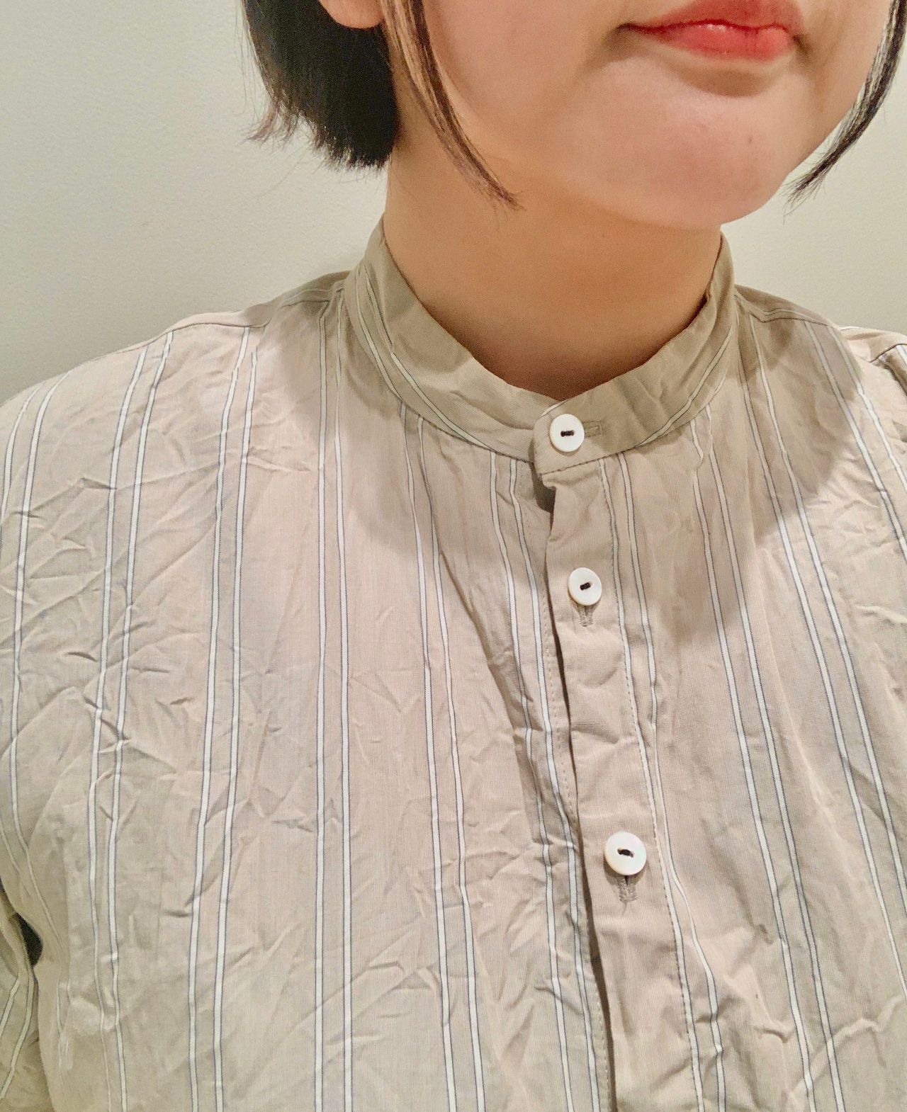 バンドカラーのスッキリとした襟元と、ギャザーの甘さのバランスが素敵です。