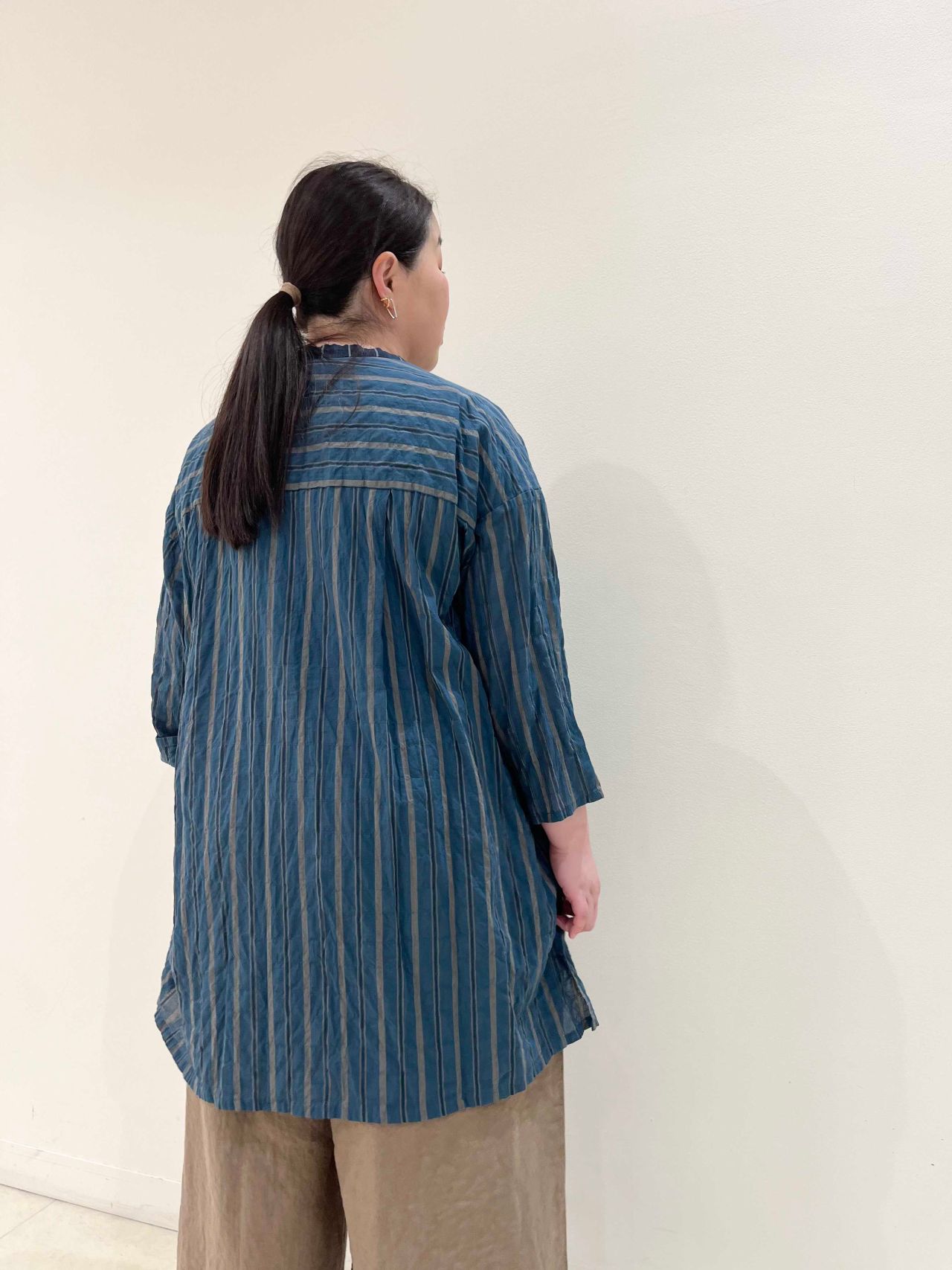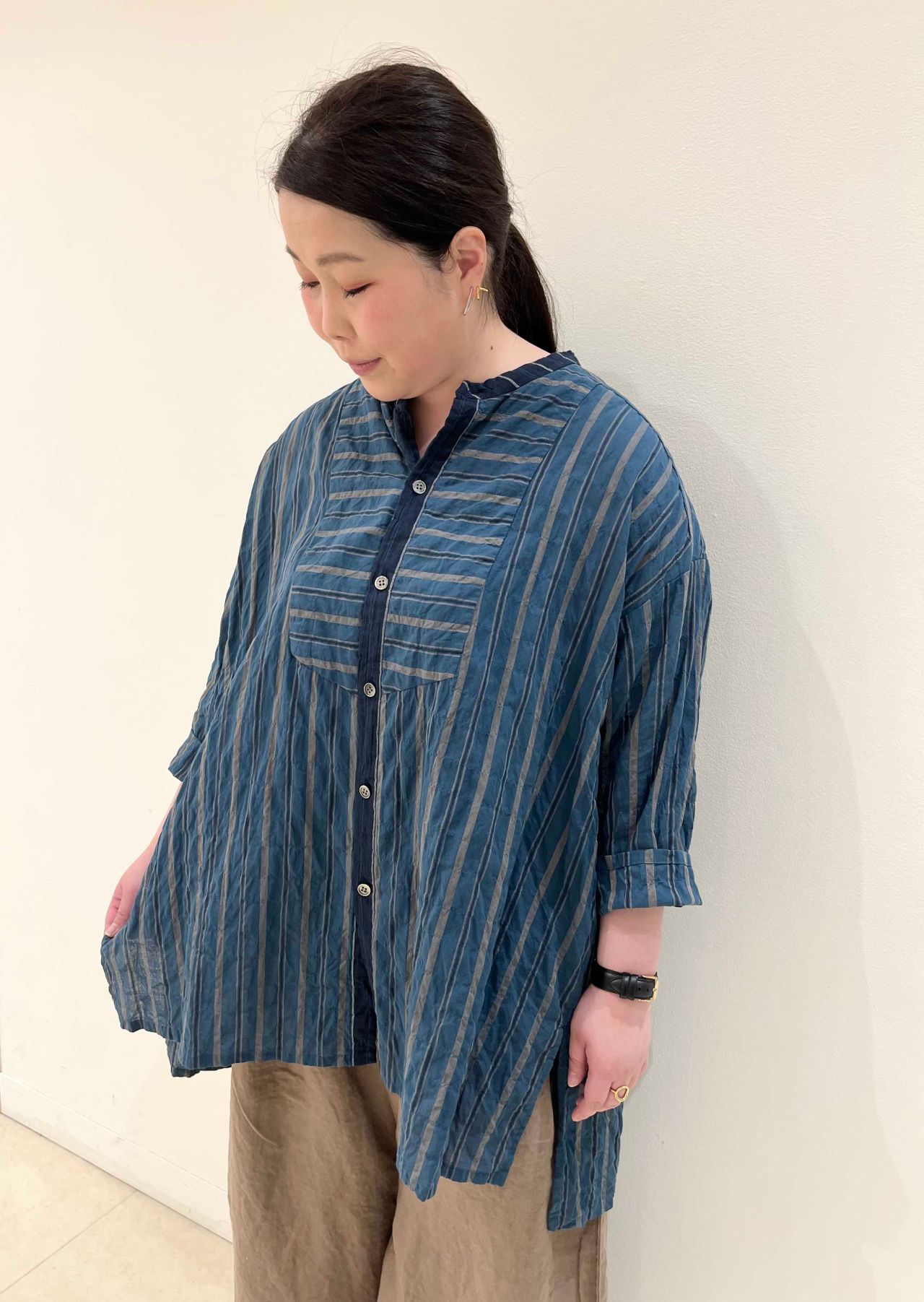 シャーリングストライプブラウス