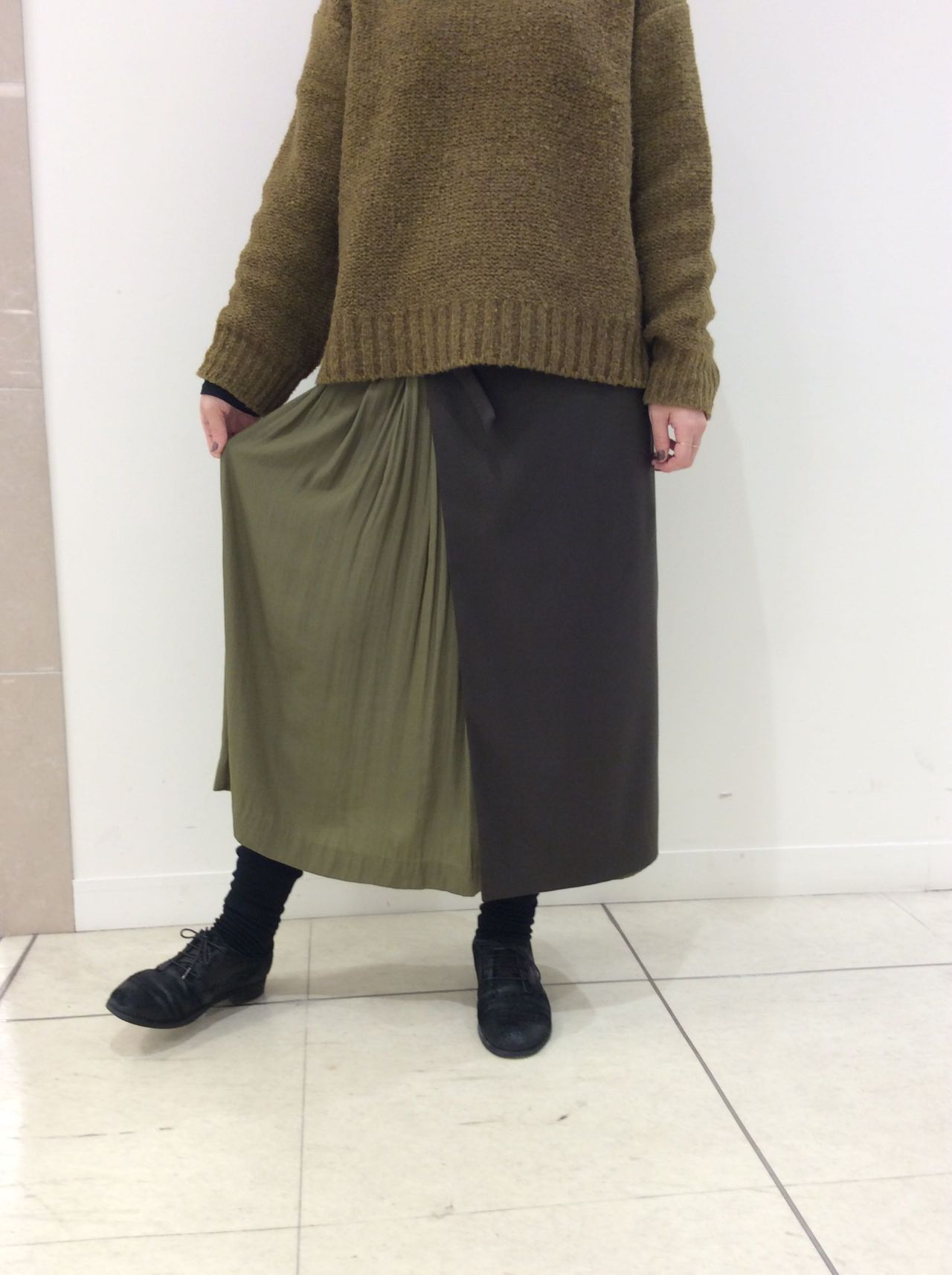 ラップデザインで、右サイドにプリーツが出て着た時にフワリと裾が揺れるシルエット。