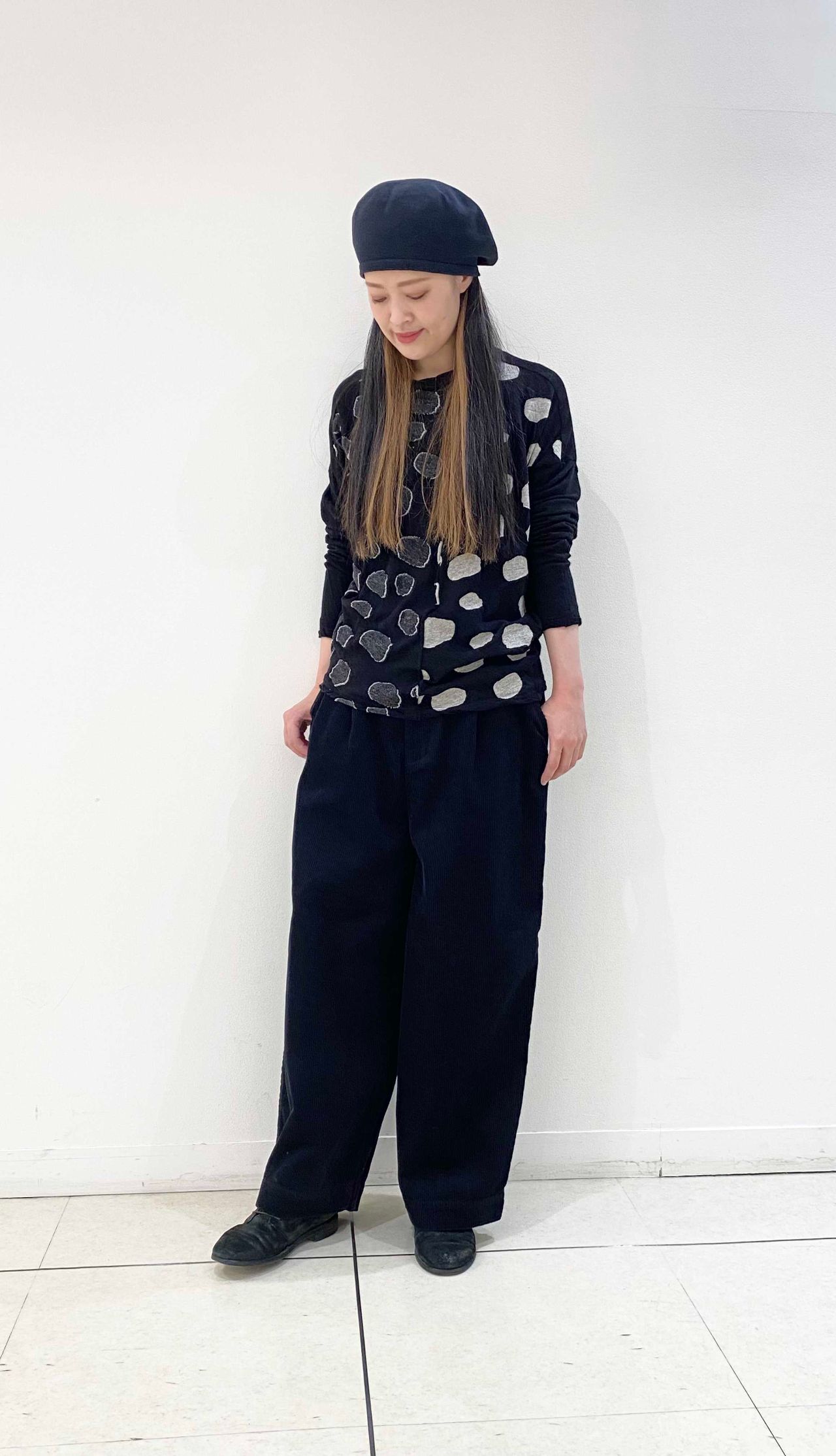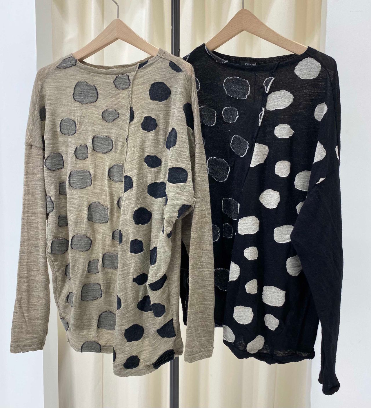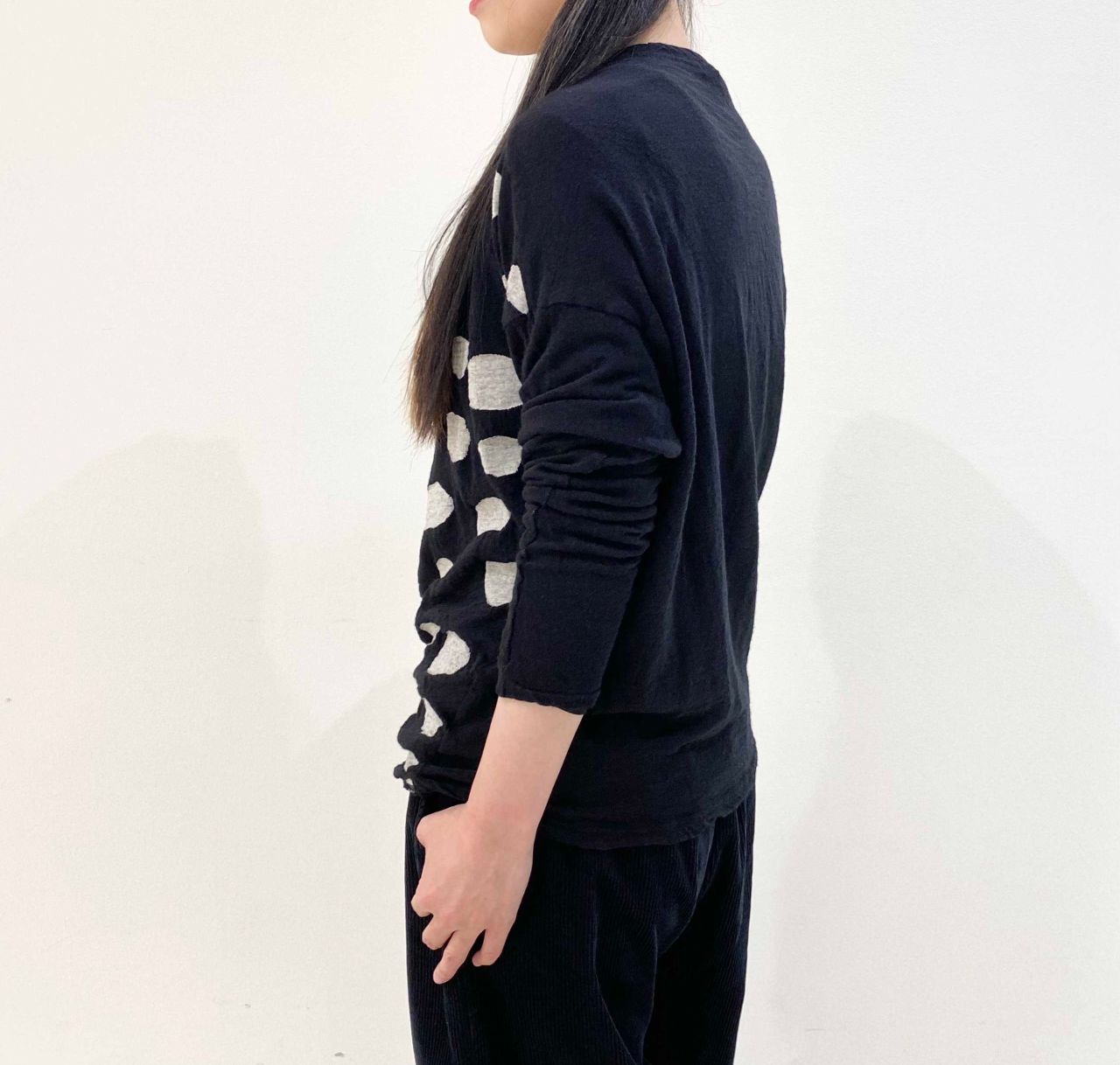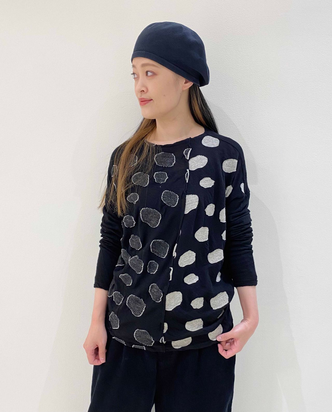 身頃をドット柄の表裏で切り替えた長袖プルオーバーです。