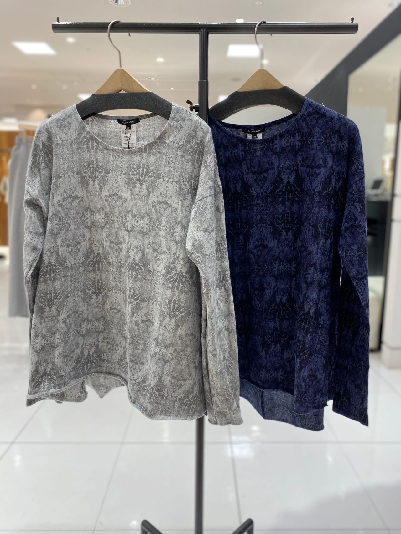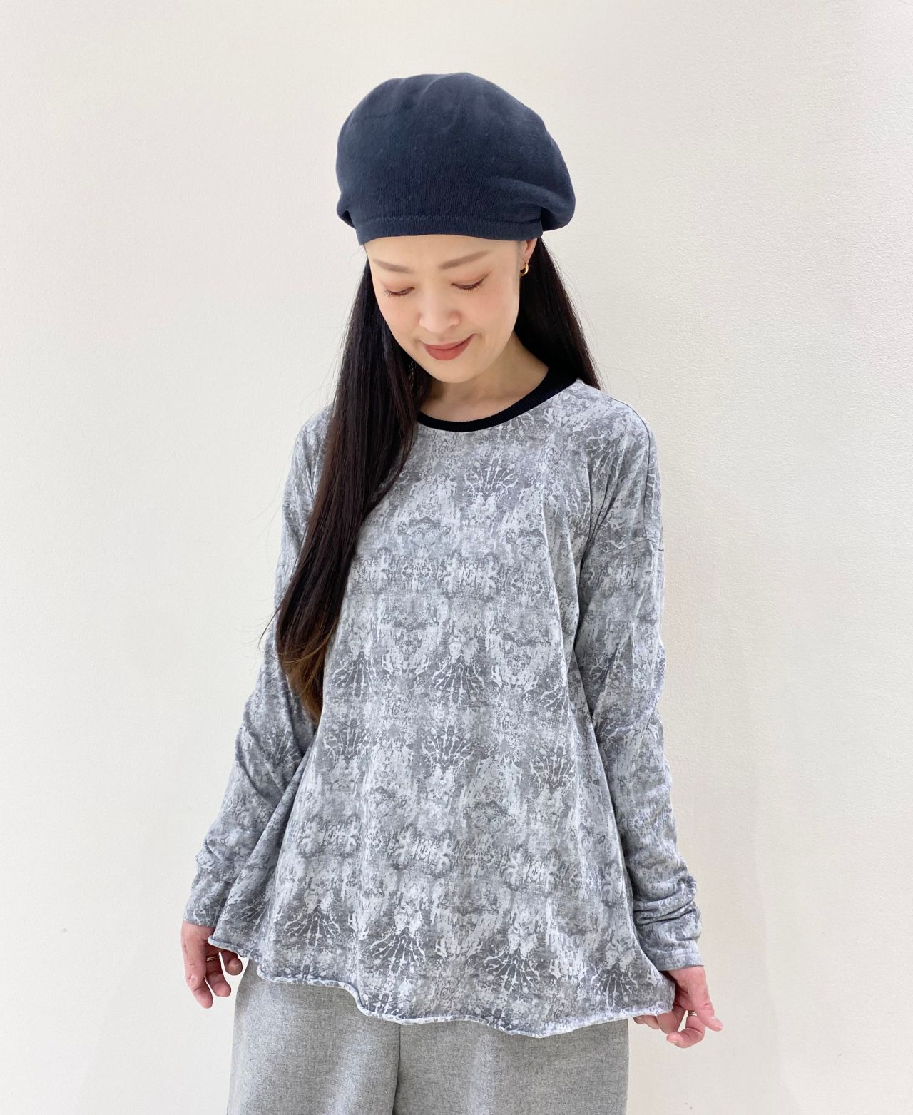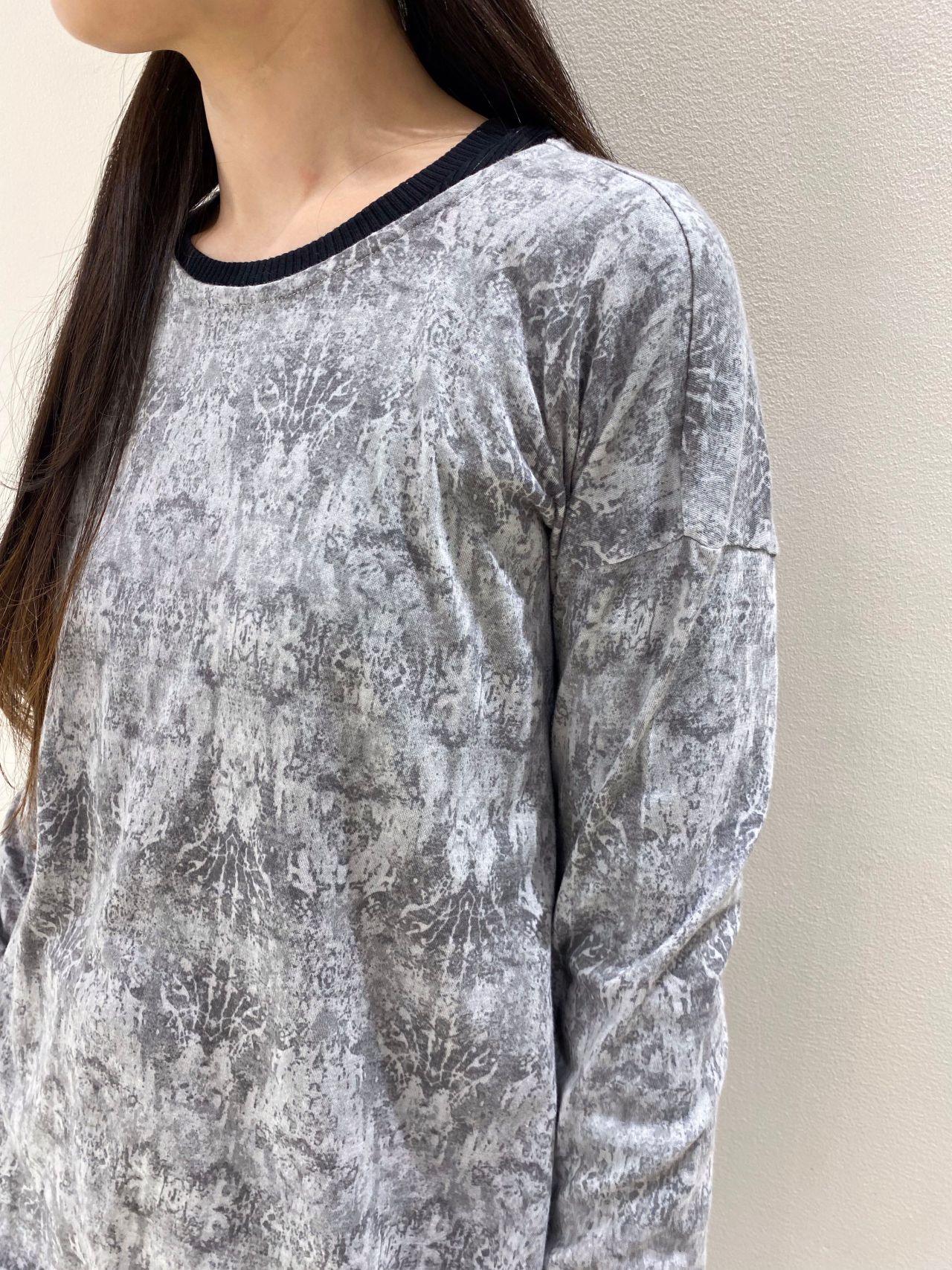 ダマスクプリントをのせた長袖プルオーバー。